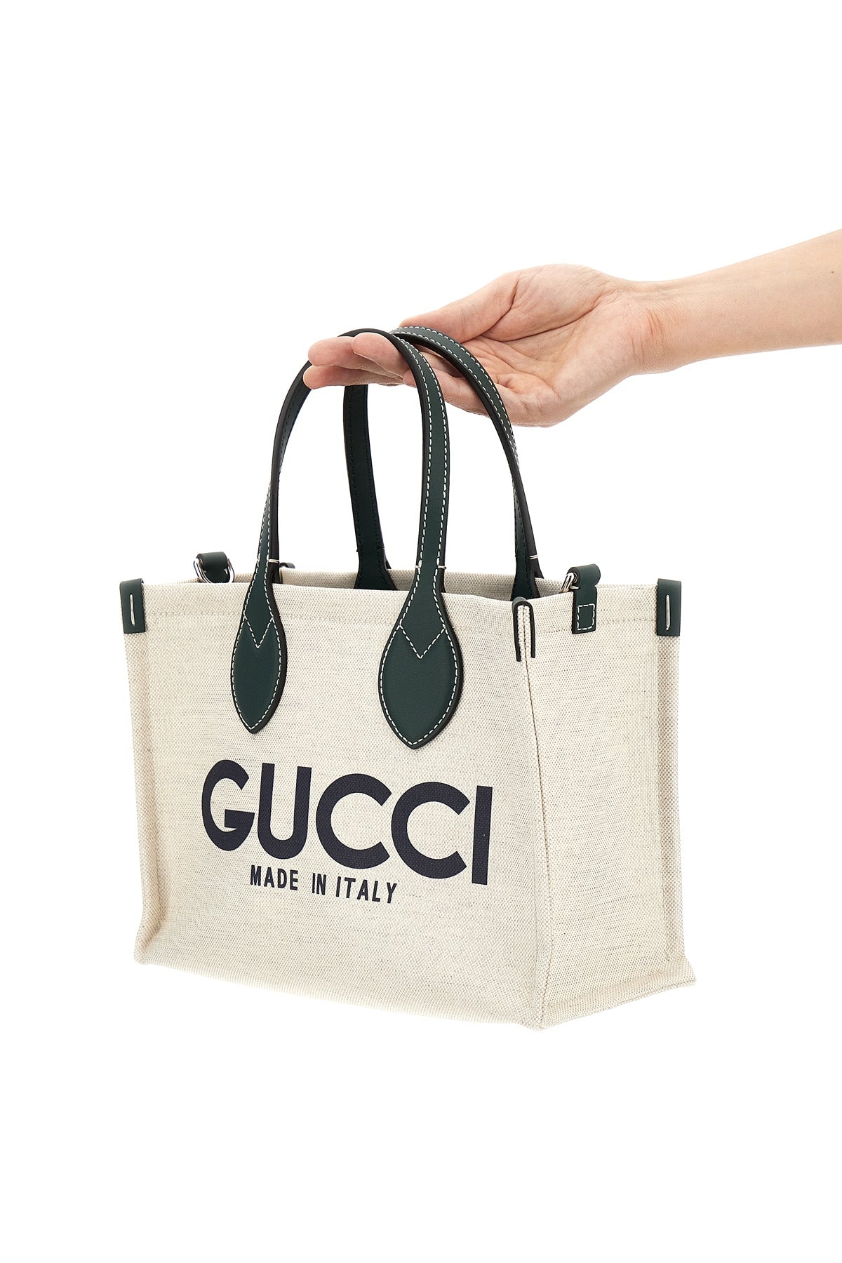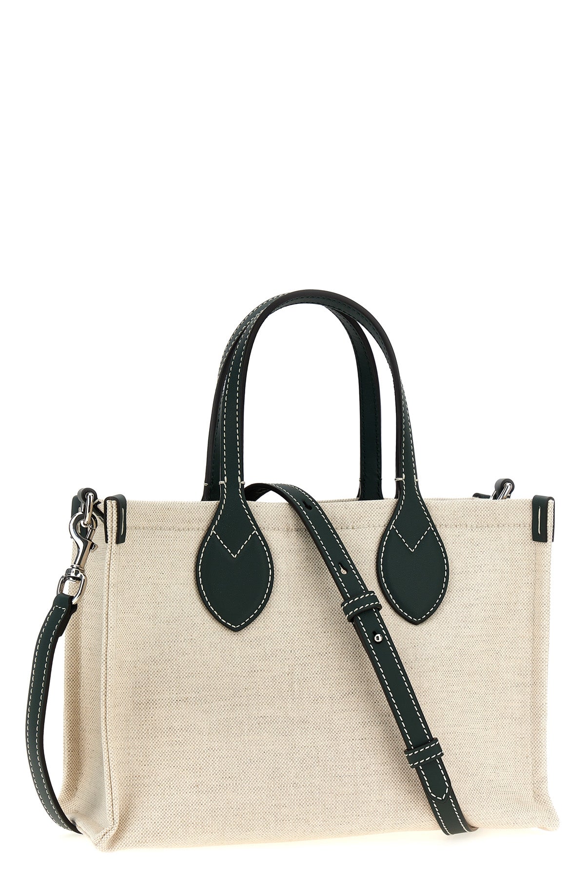 Mini sac cabas en toile avec logo imprimé sur le devant, détails en cuir, double poignée, pochette intérieure amovible, bandoulière en cuir réglable et amovible.