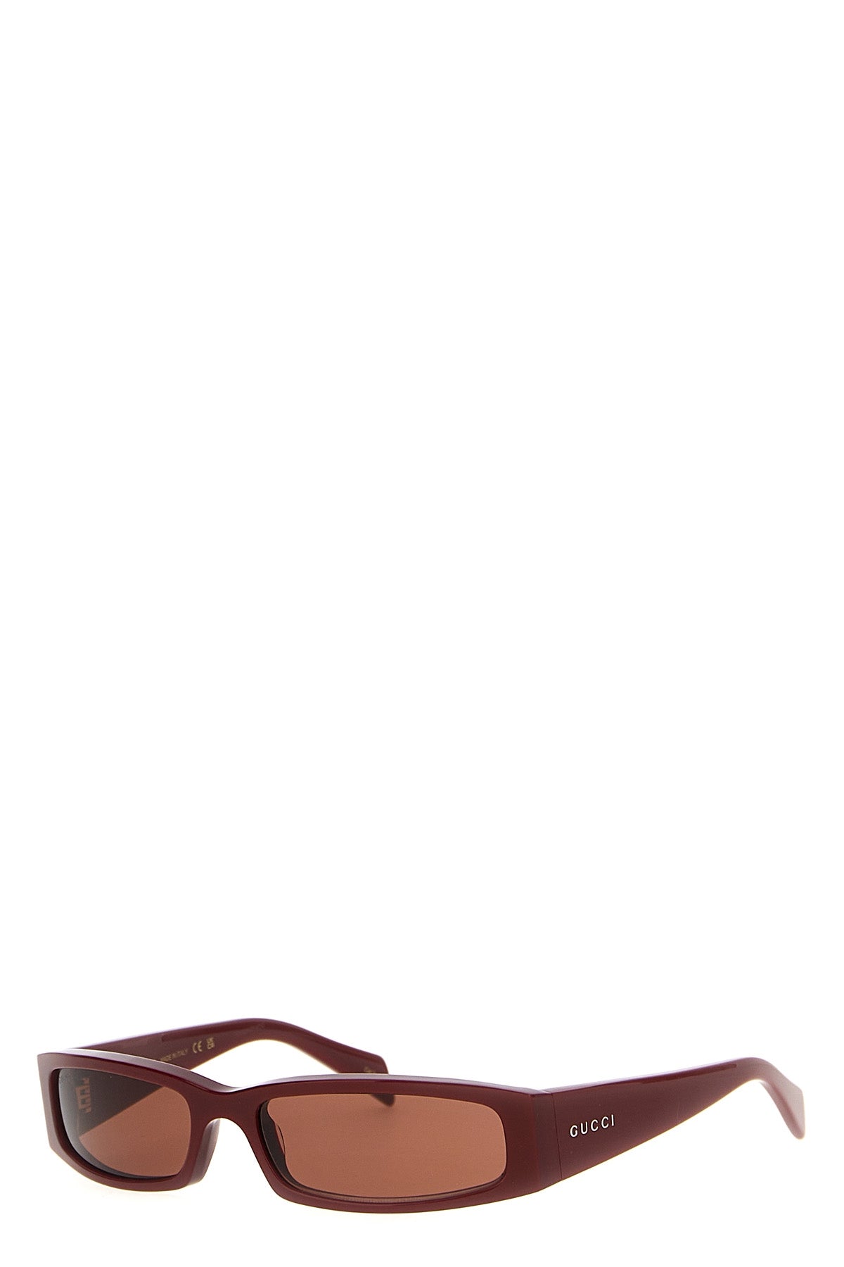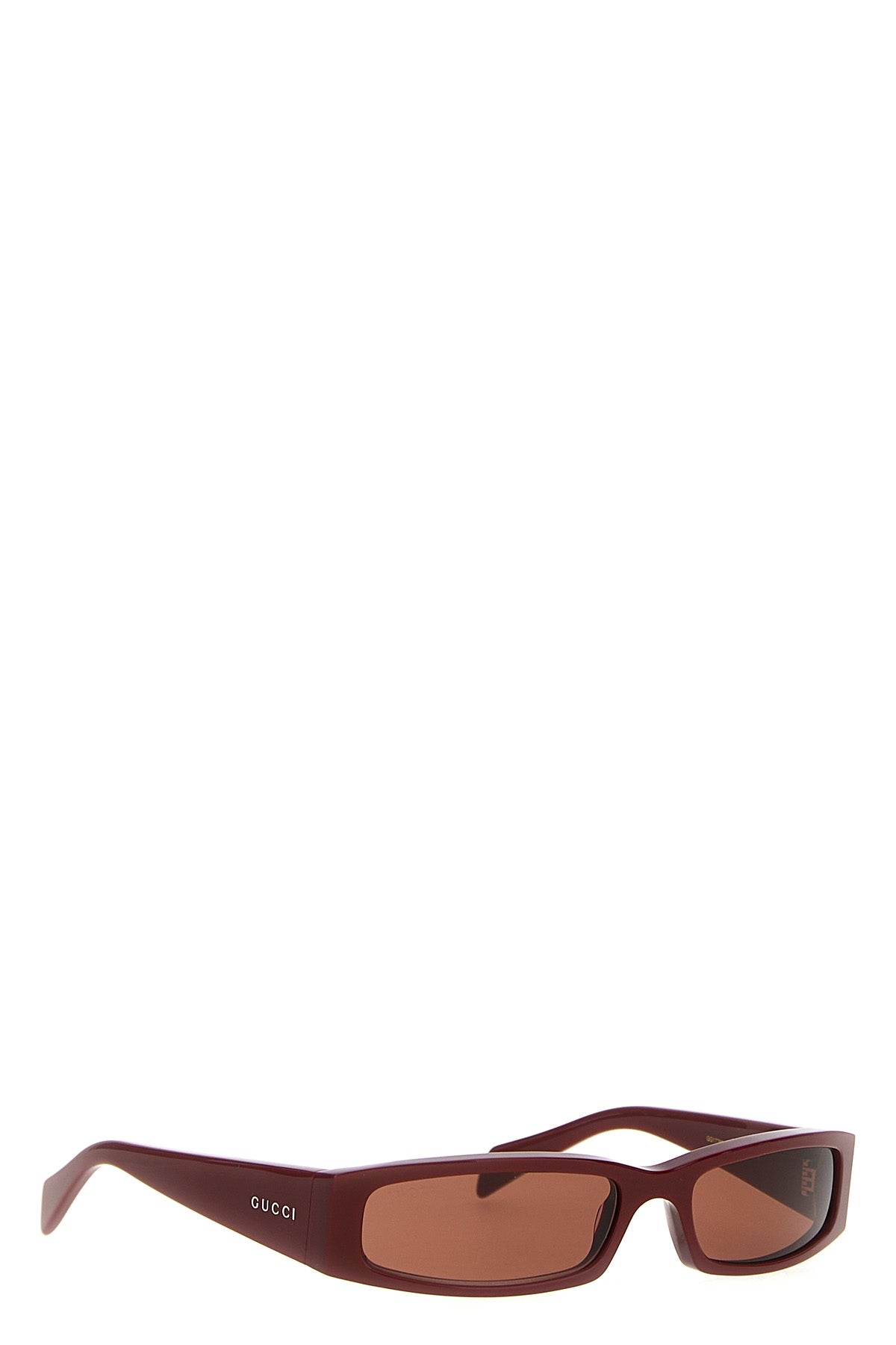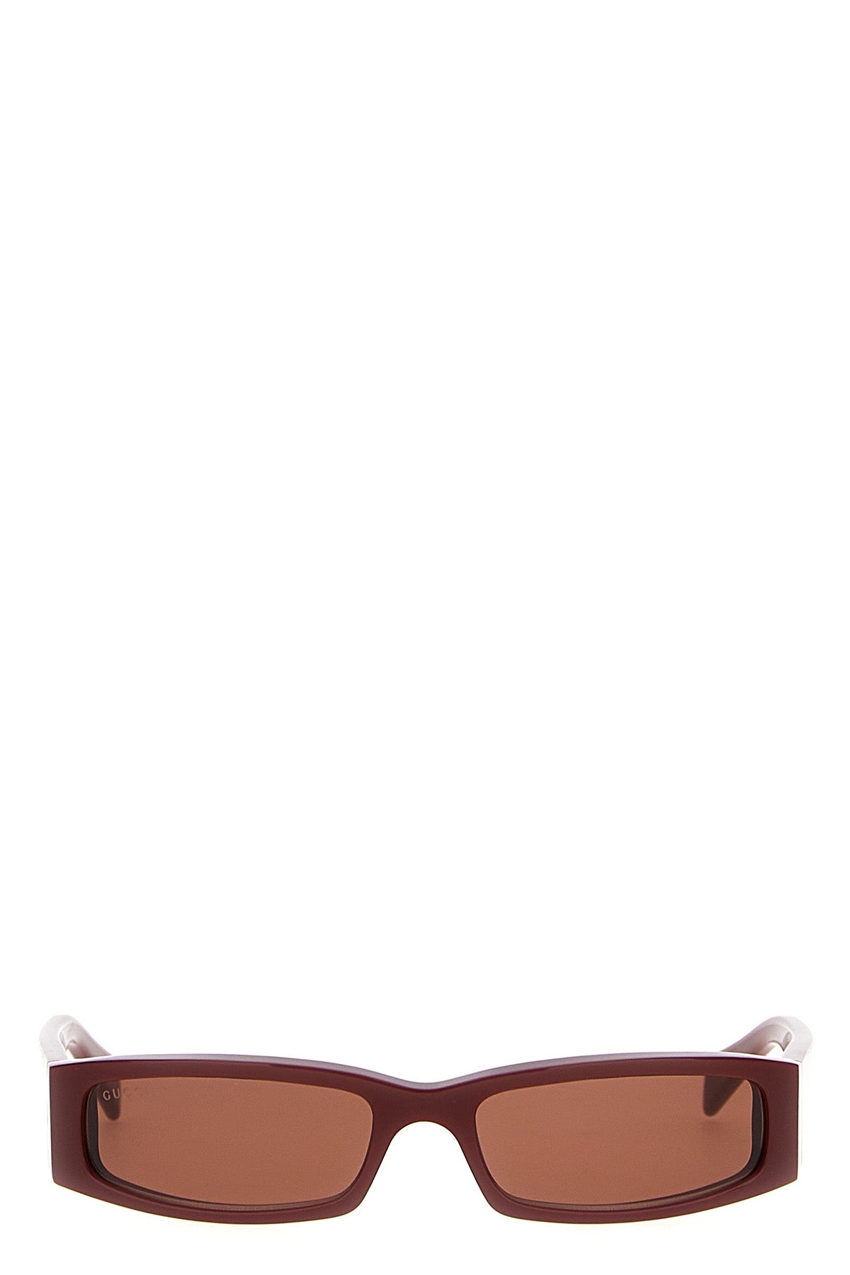 Lunettes de soleil rectangulaires avec monture en acétate rouge encore brillant, verres unis marron chaud, logo sur les branches.