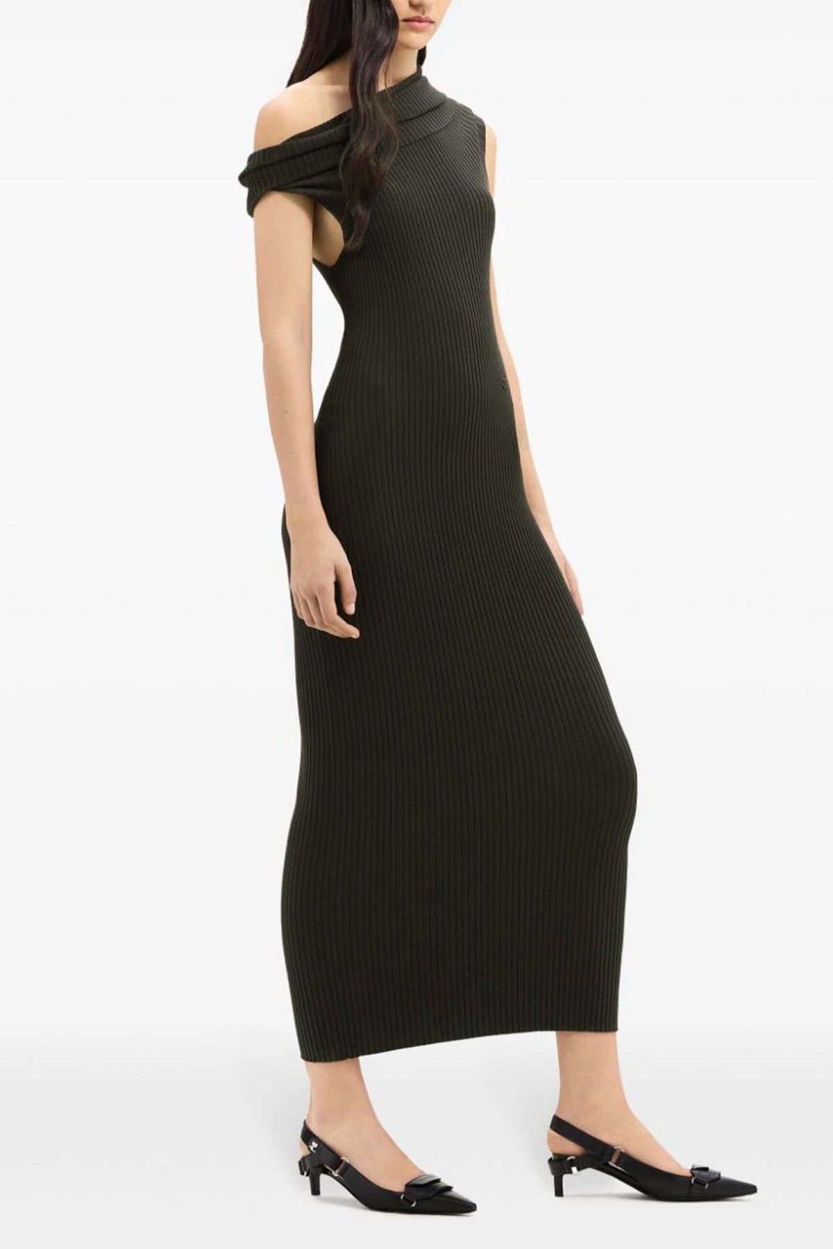 Robe longue sans manches asymétrique à une épaule en maille côtelée torsadée, mélange de viscose, avec broderie logo sur le devant.