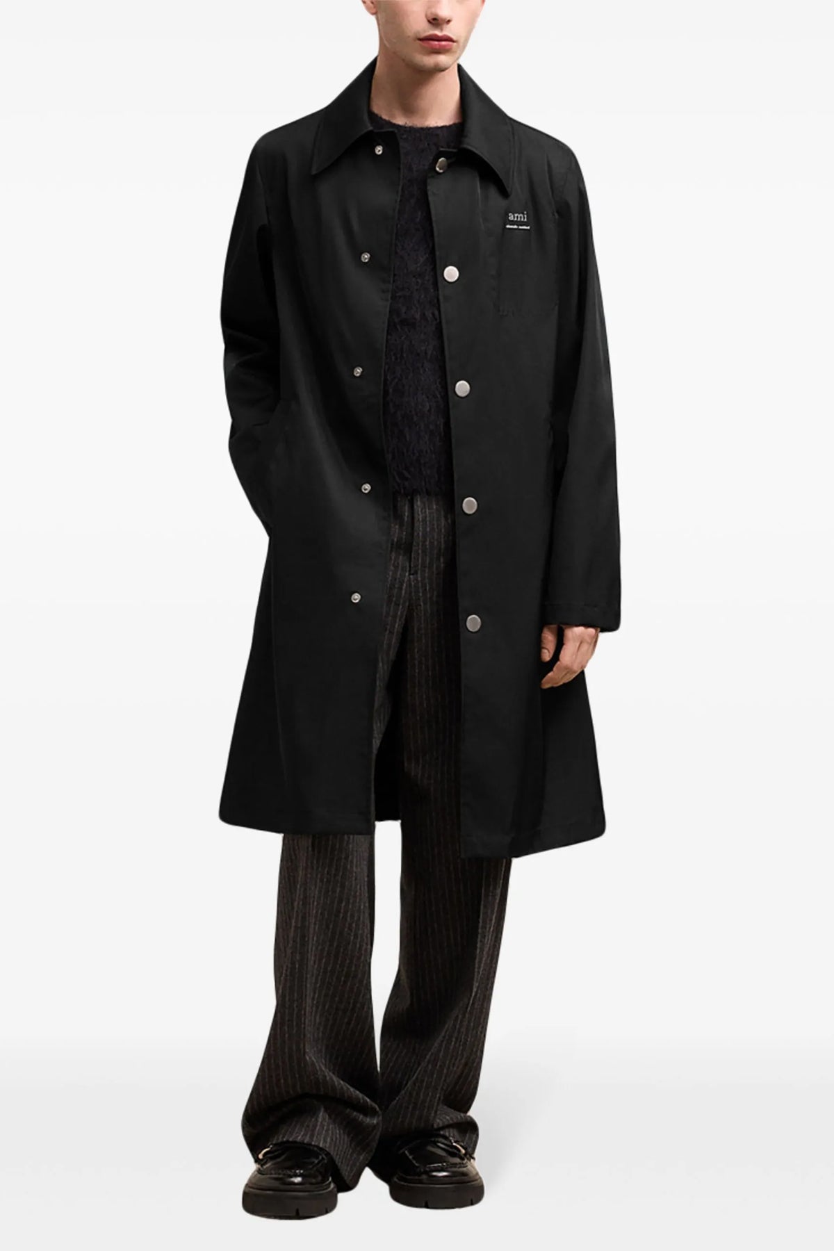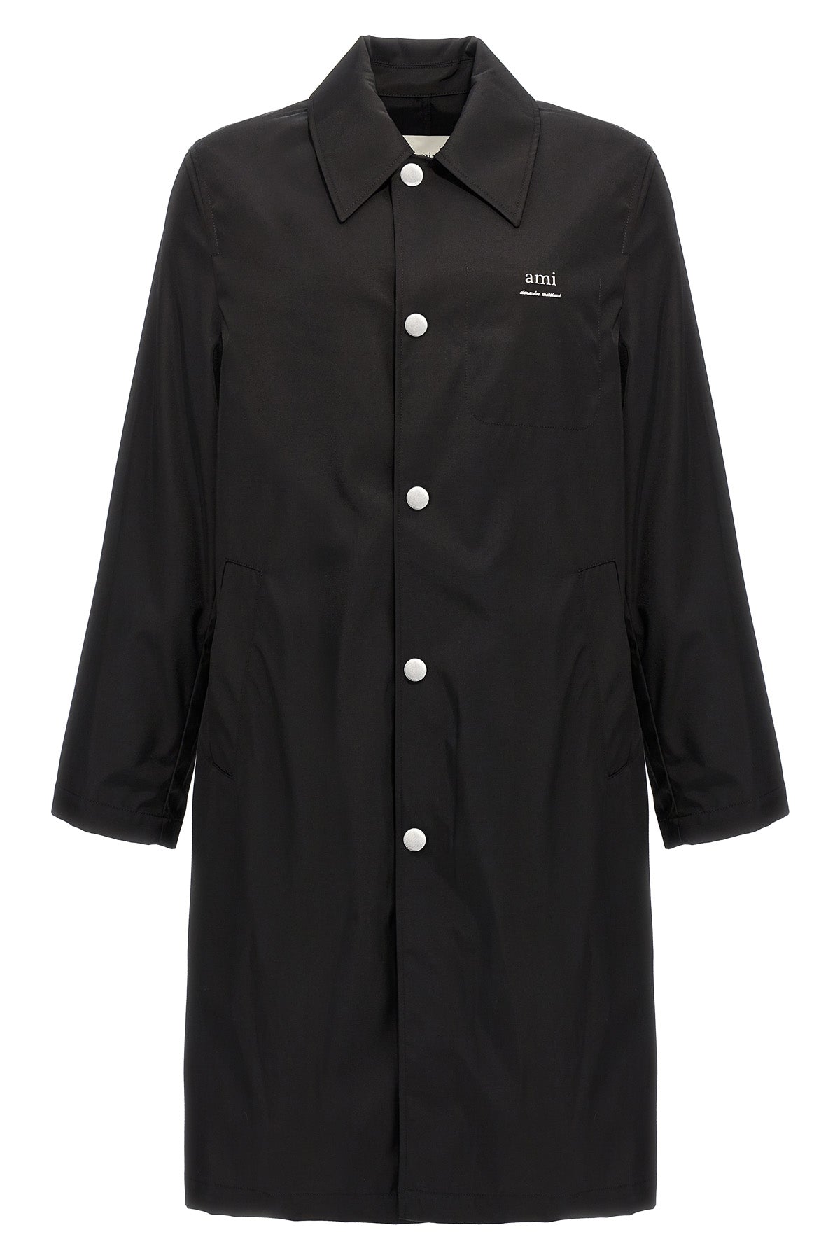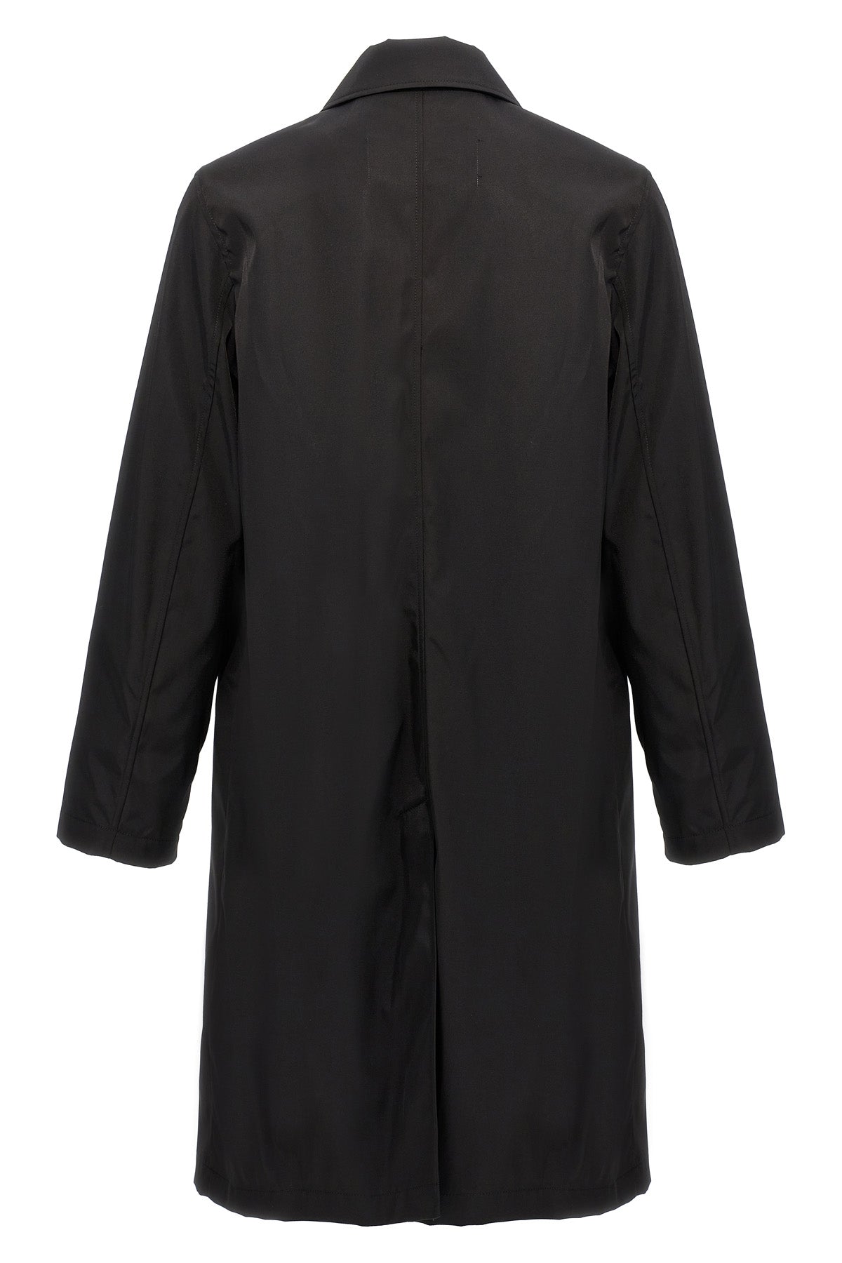 Trench-coat déperlant en sergé technique mélangé nylon et coton, logo métallique appliqué sur le devant, fermeture à boutons-pression, manches longues, poches, fente au dos.