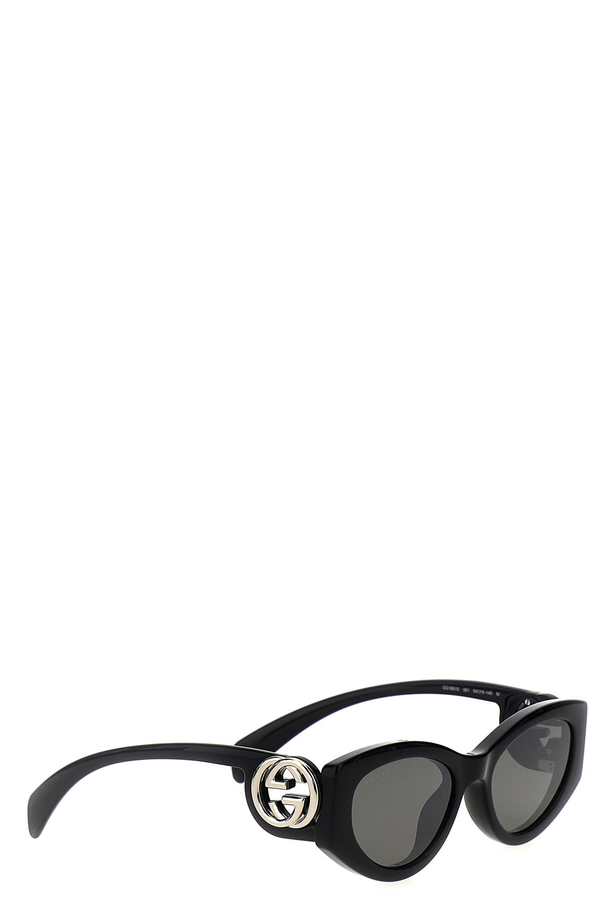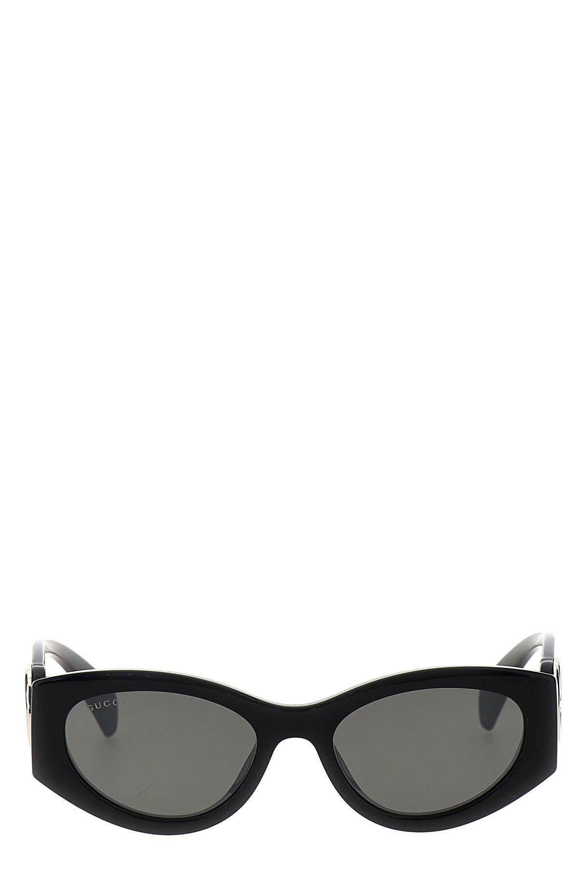 Lunettes de soleil œil de chat avec monture noire brillante injectée, verres gris unis et logo en métal sur les branches. Livrées dans un étui en velours disponible en six couleurs vives assorties à la doublure en satin. La couleur de l'étui, qui contient également une pochette en flanelle et satin assortie ainsi qu'un chiffon en microfibre ivoire, sera choisie aléatoirement pour chaque paire de lunettes.