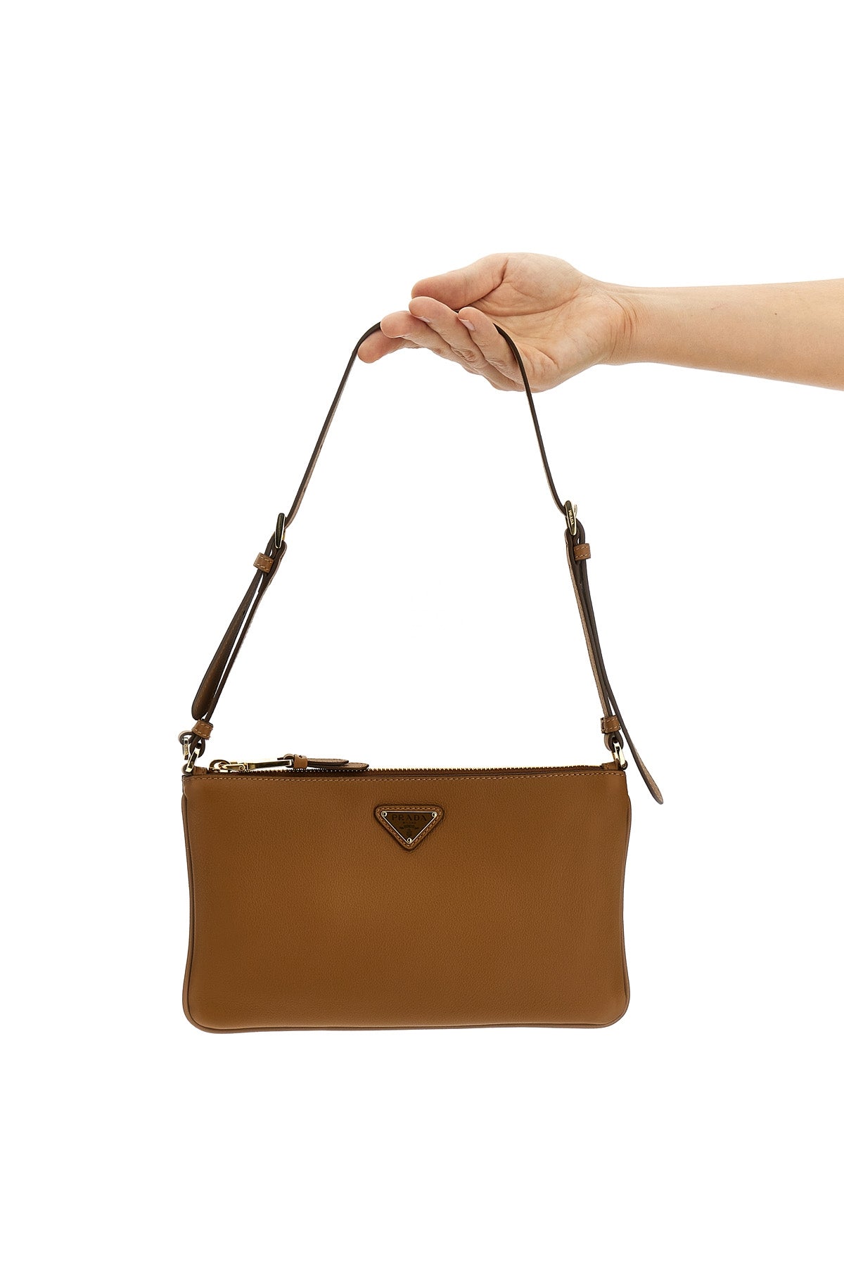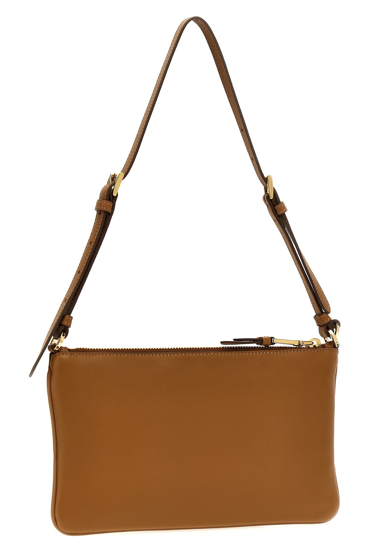 Sac bandoulière en cuir souple grainé, logo triangulaire en métal émaillé sur le devant, anse réglable, fermeture éclair, détails métalliques.