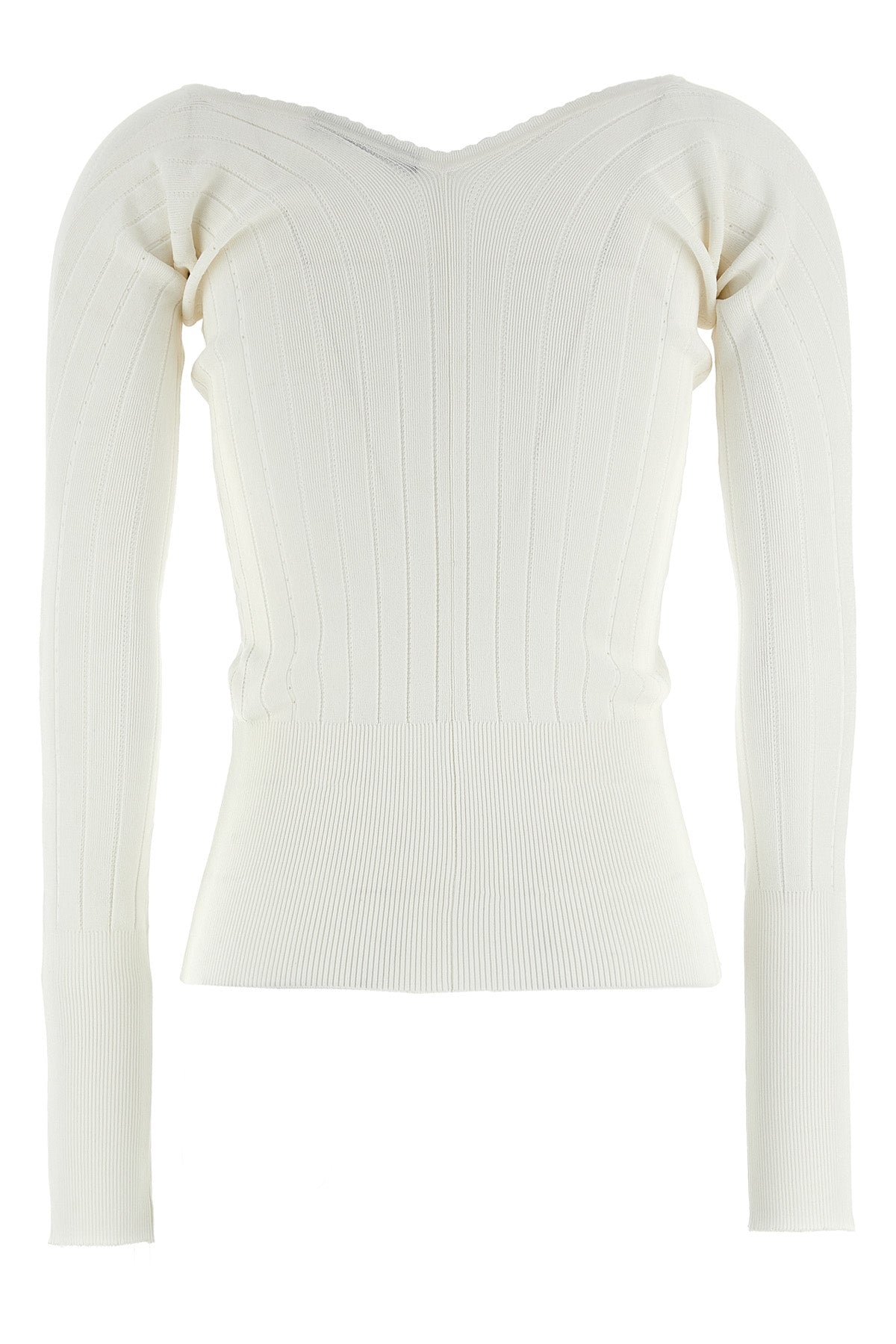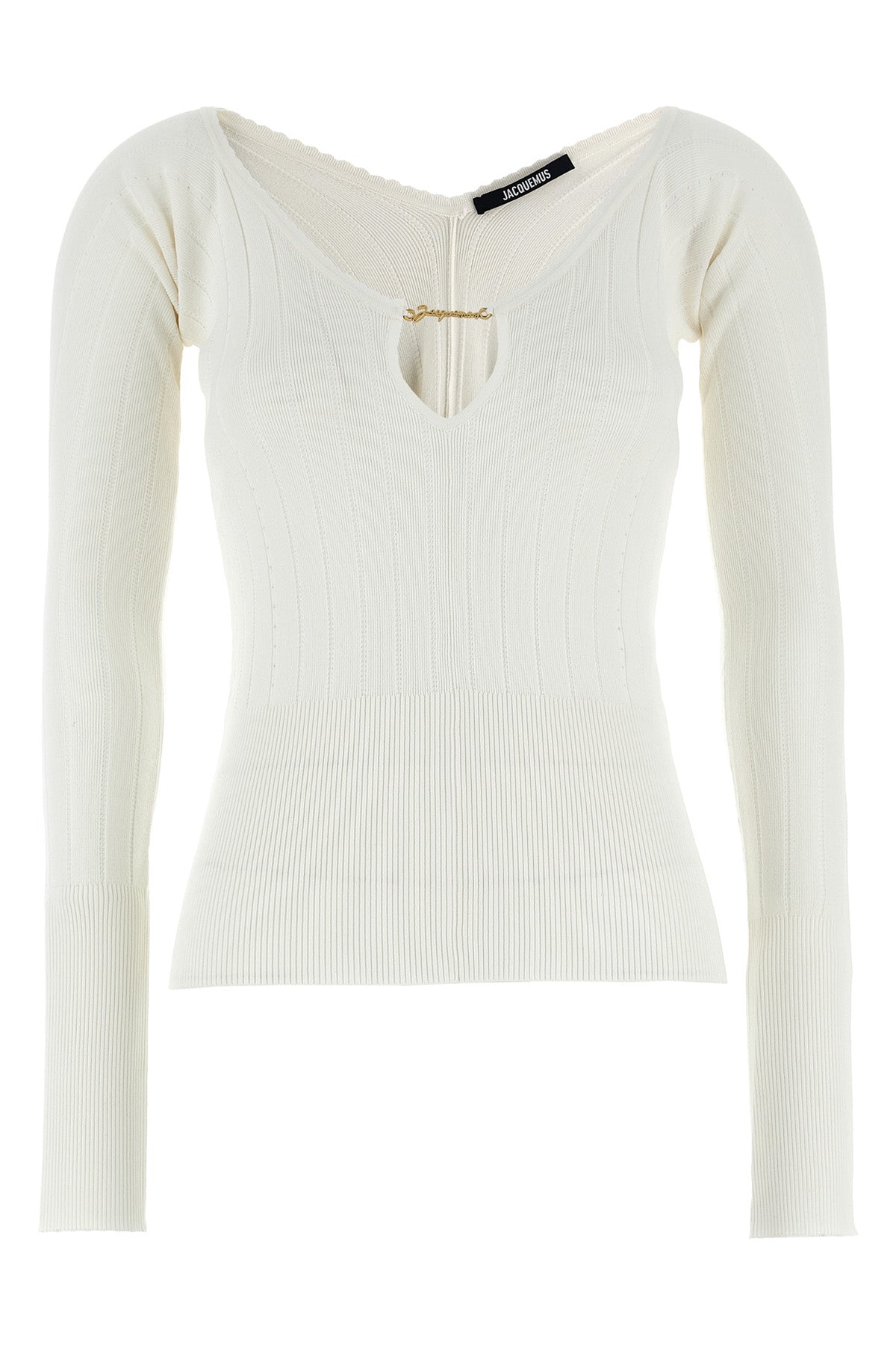 Le Haut Pralù' Top en viscose côtelée extensible, détail découpé sur le devant avec breloque logo en métal doré, manches longues.