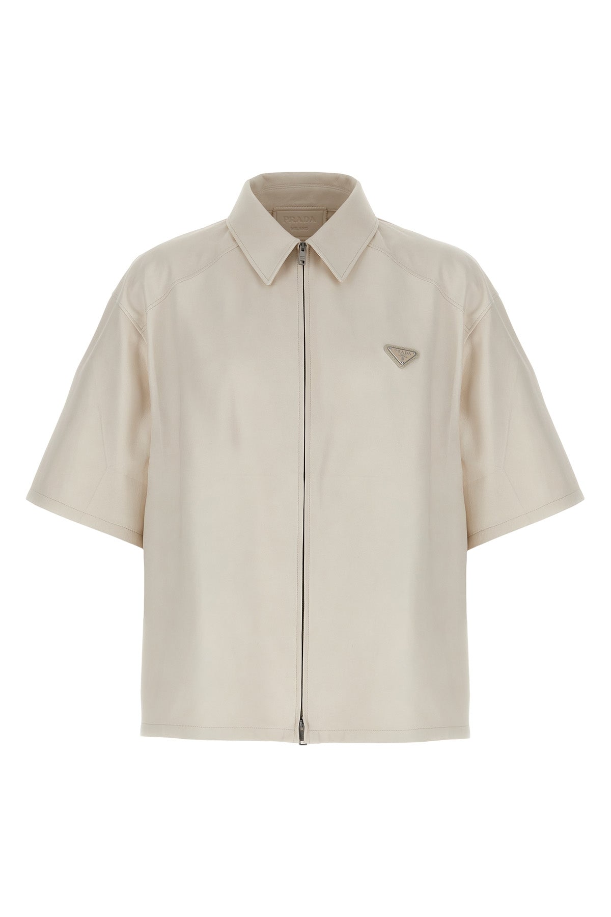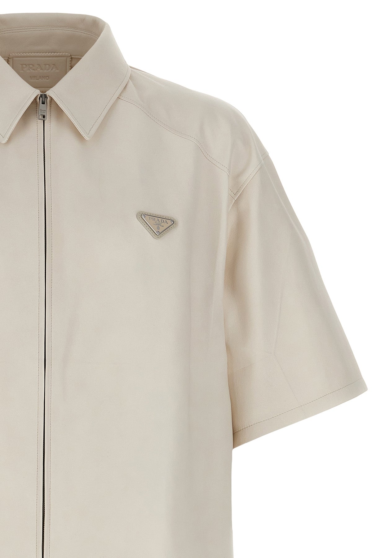 Chemise en nappa, logo triangulaire en métal émaillé sur le devant, fermeture éclair, manches courtes.