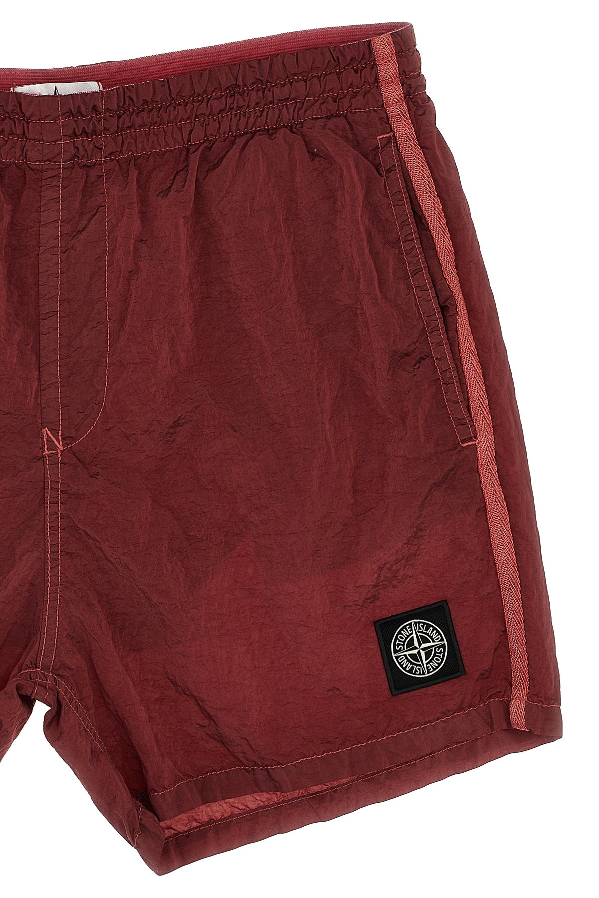 Maillot de bain en nylon métallisé froissé, logo sur le devant, taille élastique avec cordon de serrage ajustable, poches, slip intégré en filet.