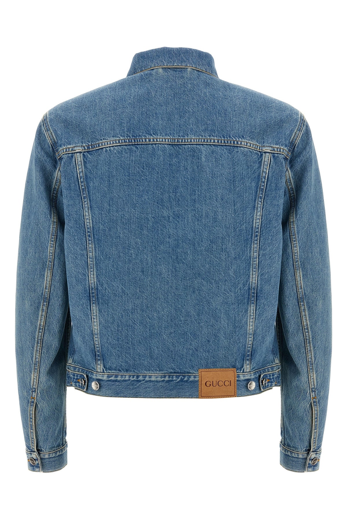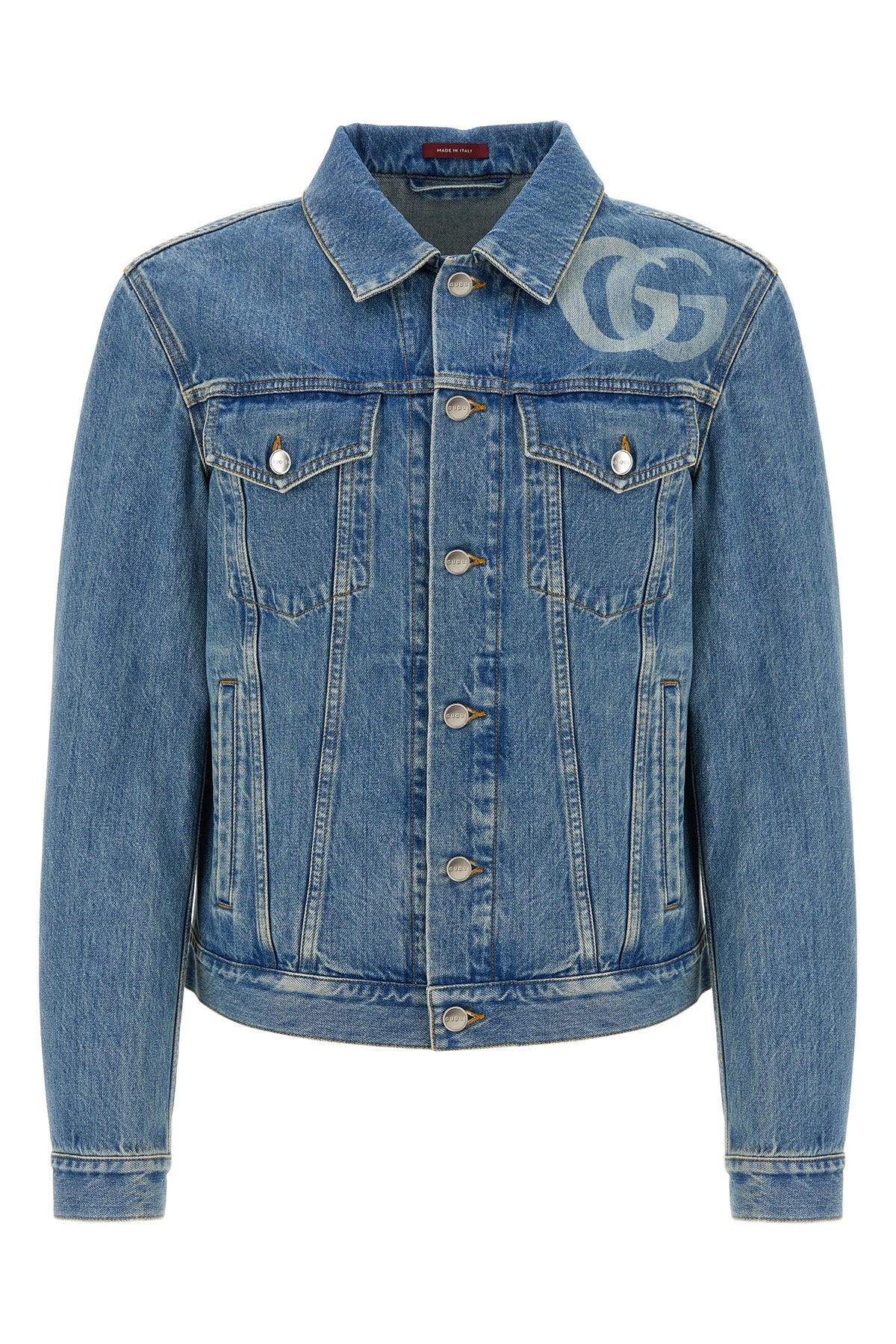 Veste en denim de coton effet délavé, logo GG gravé au laser sur le devant, fermeture boutonnée, manches longues à revers, poches, étiquette logo Jacron au dos.