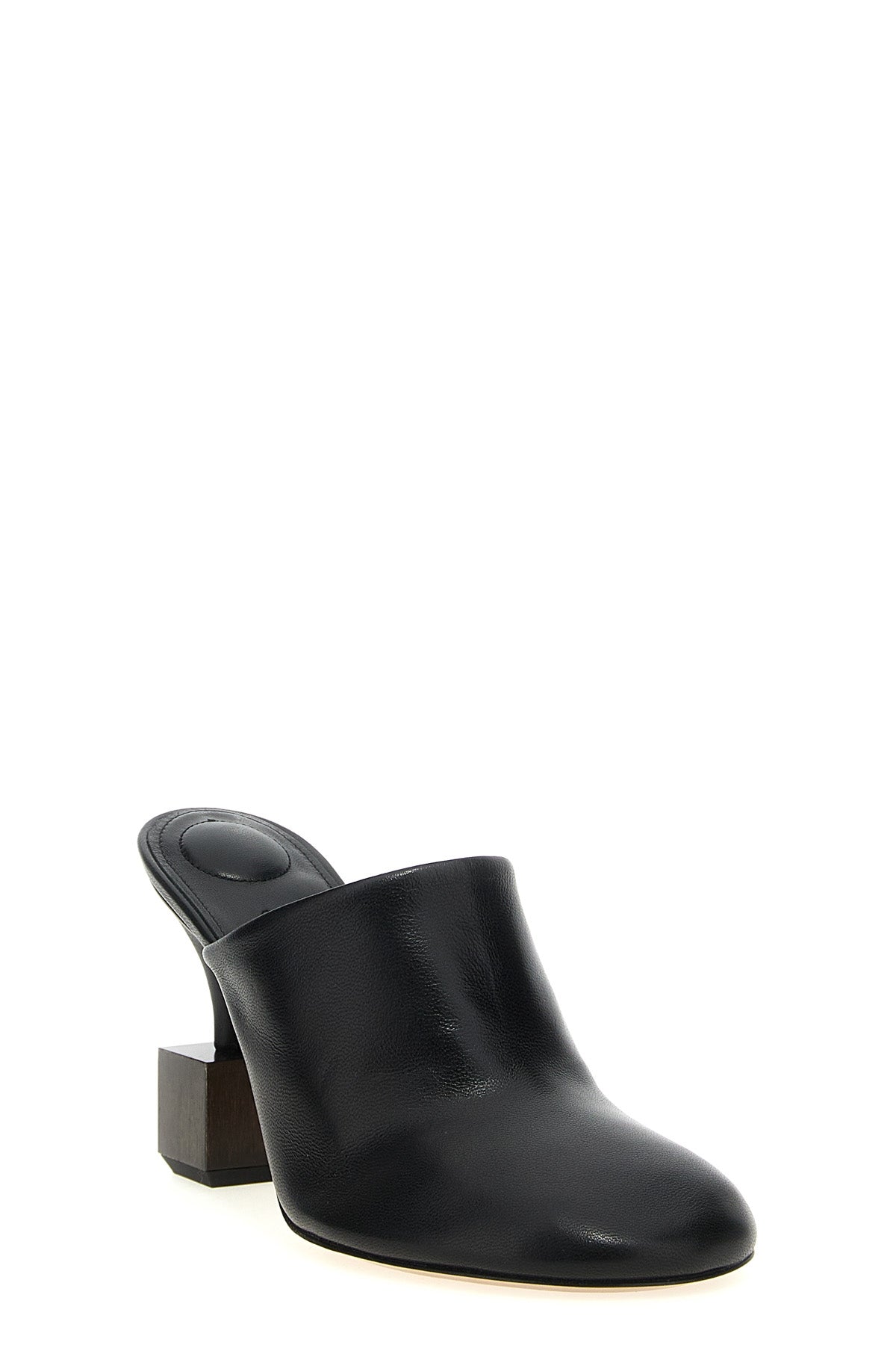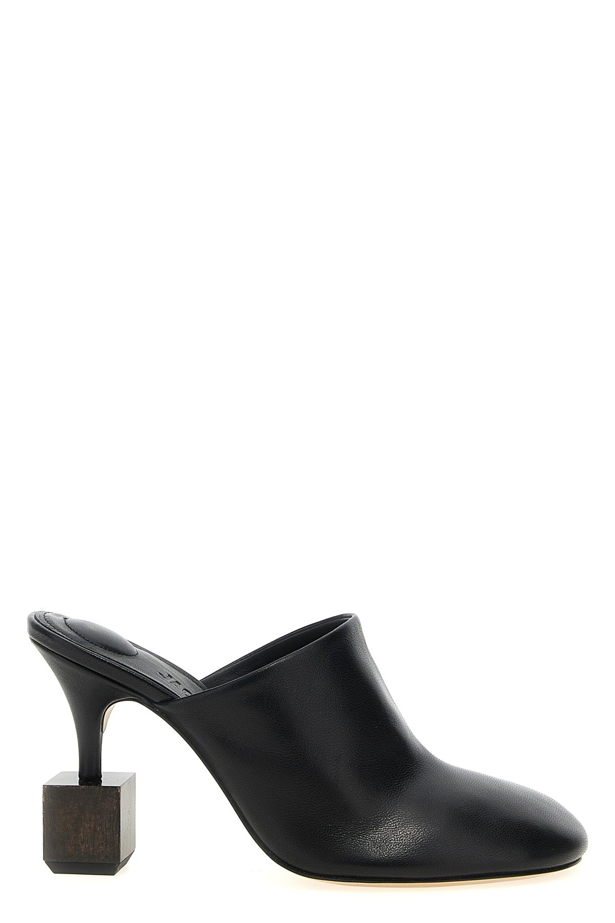 Mules Bisou' en cuir lisse, bout arrondi, talon orné de sculptures géométriques en bois, semelle en cuir.