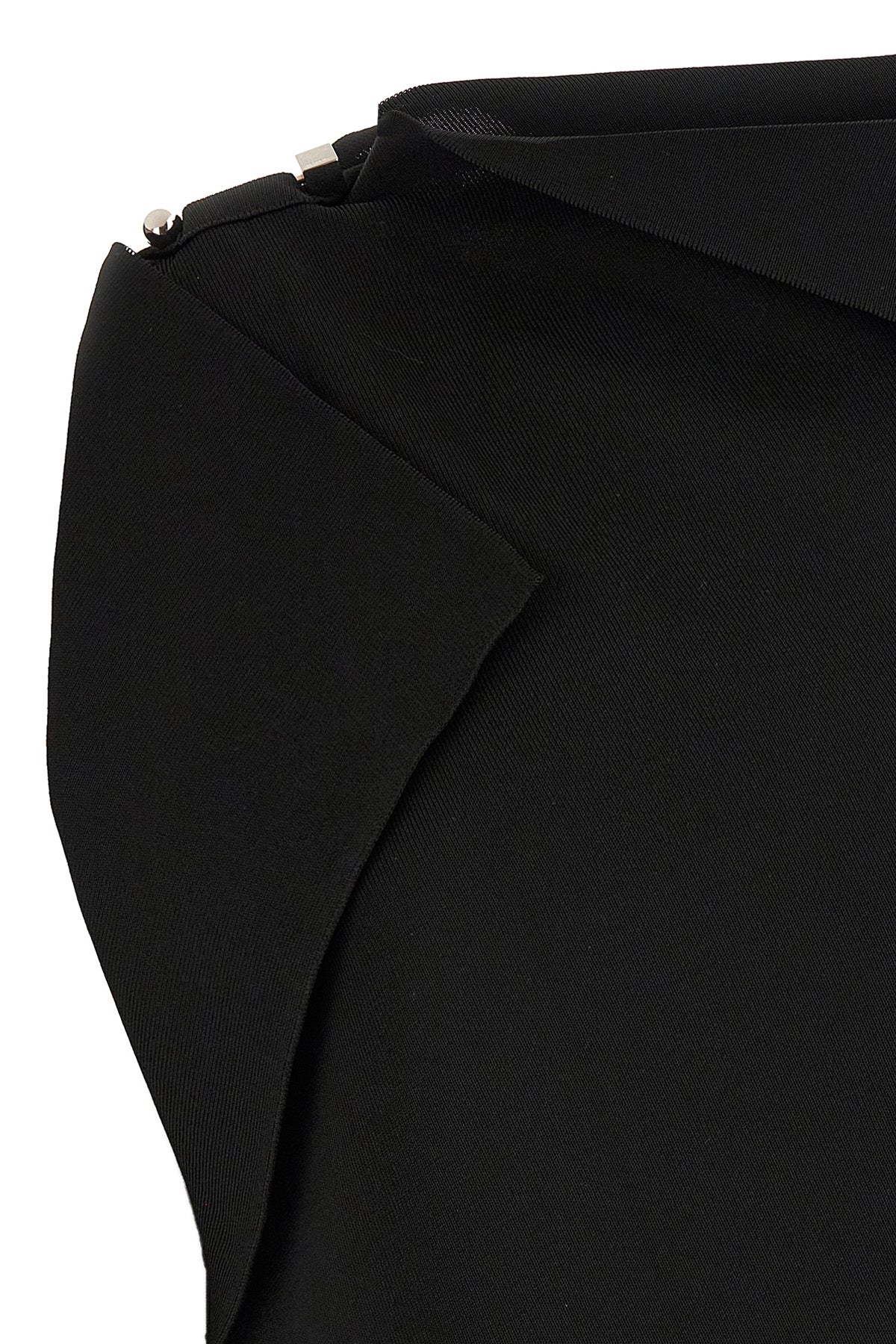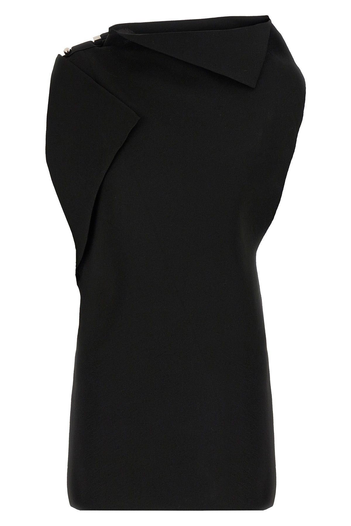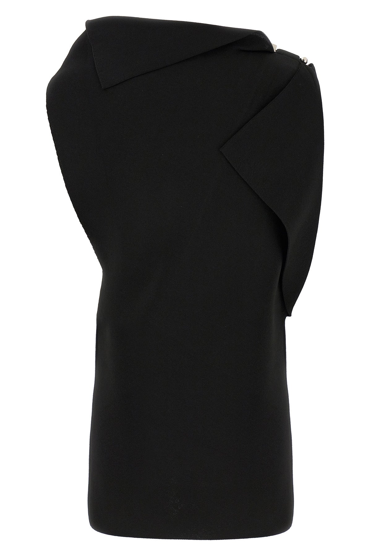 La Mini Robe Trapèze' Robe en maille viscose effet 3D, forme asymétrique et drapée, col bateau, sans manches, broche ronde-carrée en métal sur l'épaule.