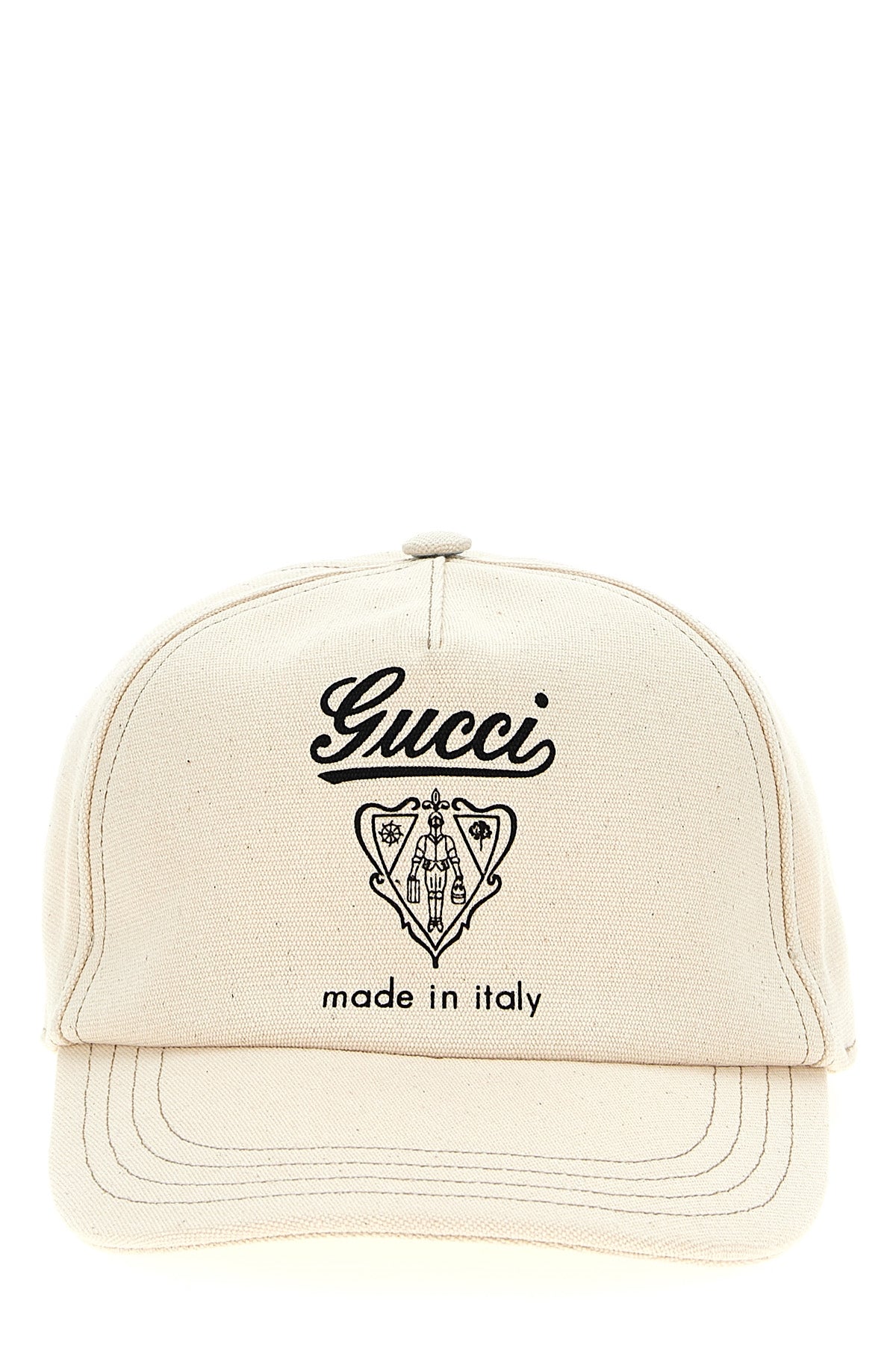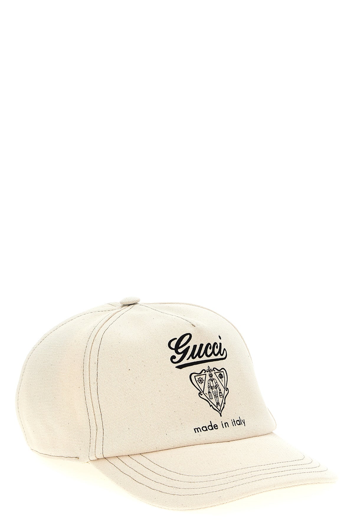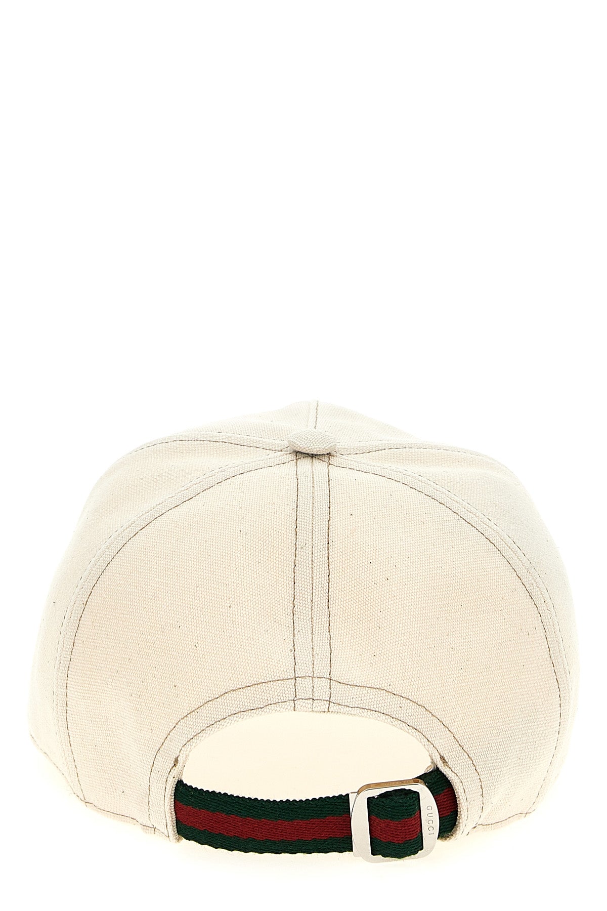 Casquette en coton avec surpiqûres contrastées, imprimé des armoiries Gucci sur le devant, sangle en ruban réglable à l'arrière.