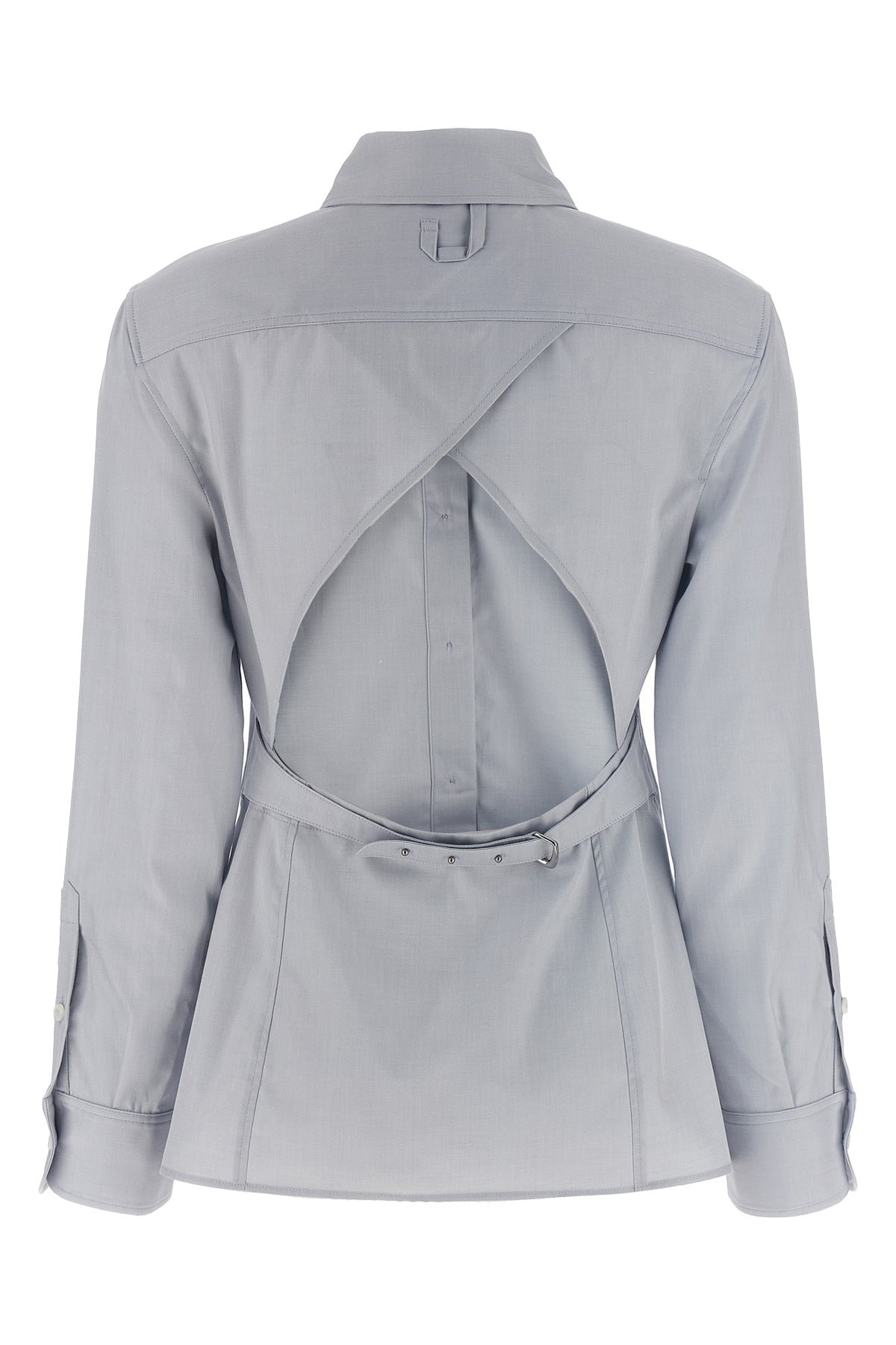 Chemise de costume en coton à chevrons avec fermeture boutonnée et broderie logo sur le devant, manches longues à poignets retroussés, grand détail découpé dans le dos avec bretelle réglable.