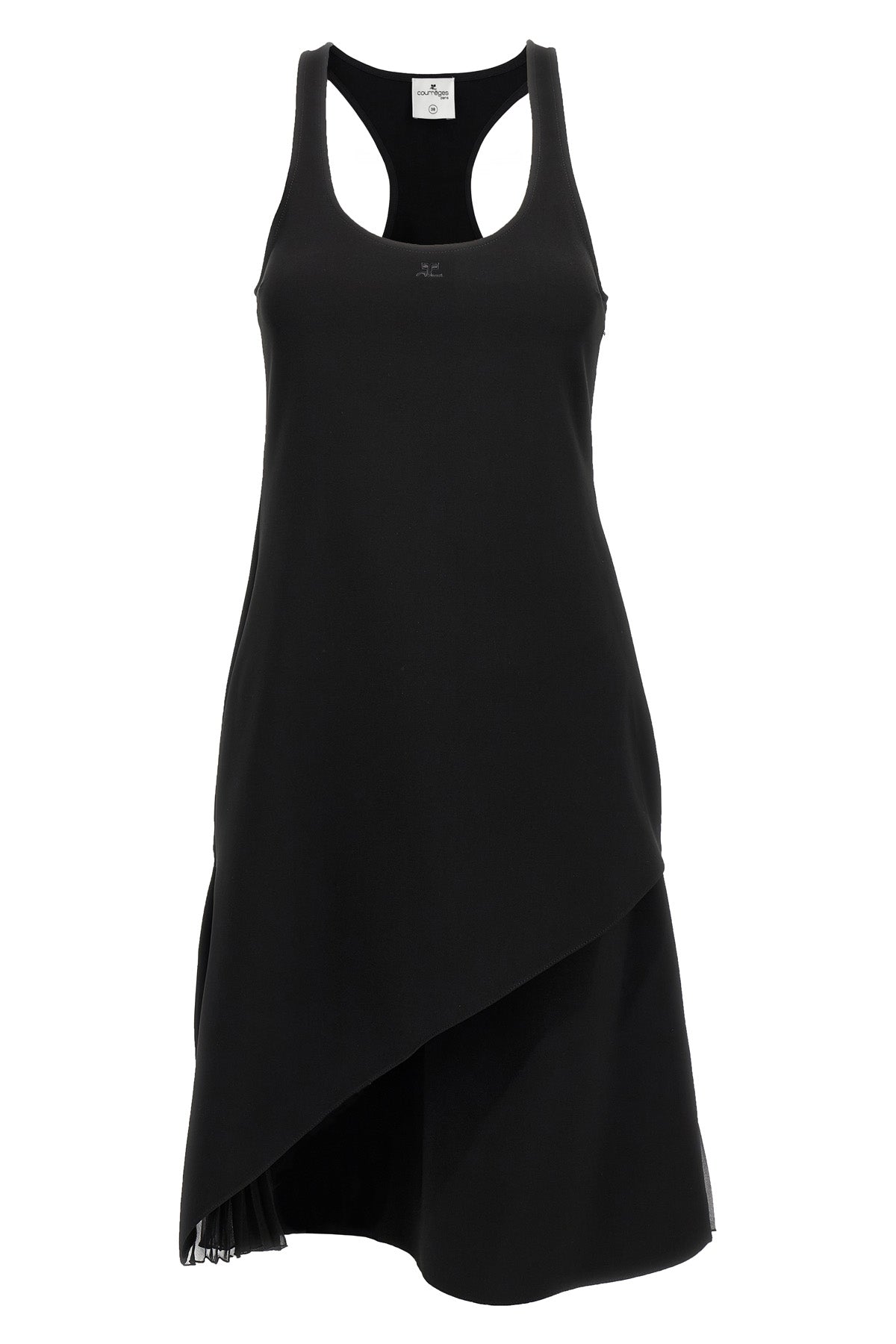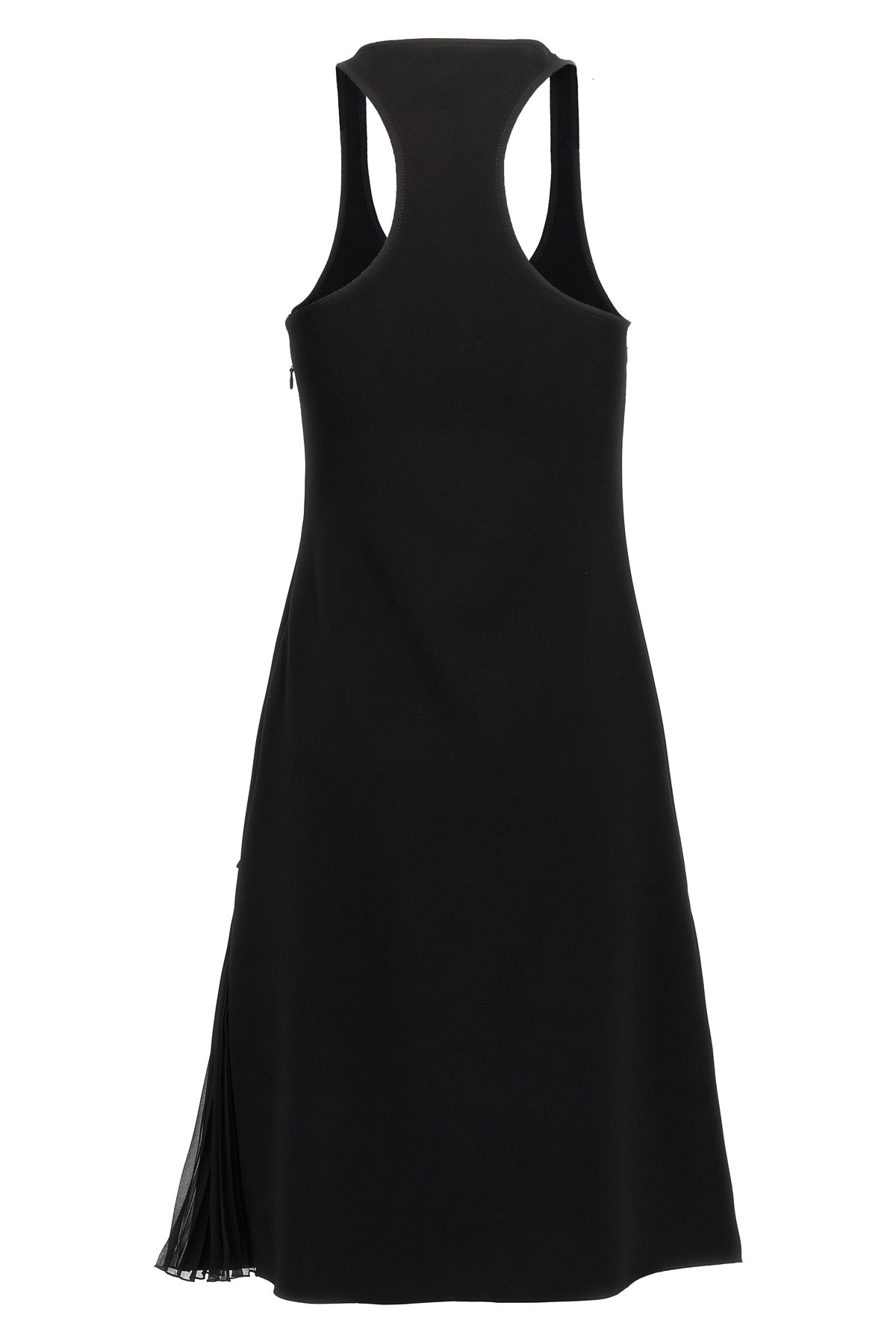 Robe midi en crêpe à plis infinis, coupe trapèze, logo brodé ton sur ton sur le devant, silhouette trapèze, large encolure ronde, sans manches, jupe portefeuille avec culotte intégrée et empiècements à volants plissés sur les côtés, fermeture éclair latérale.