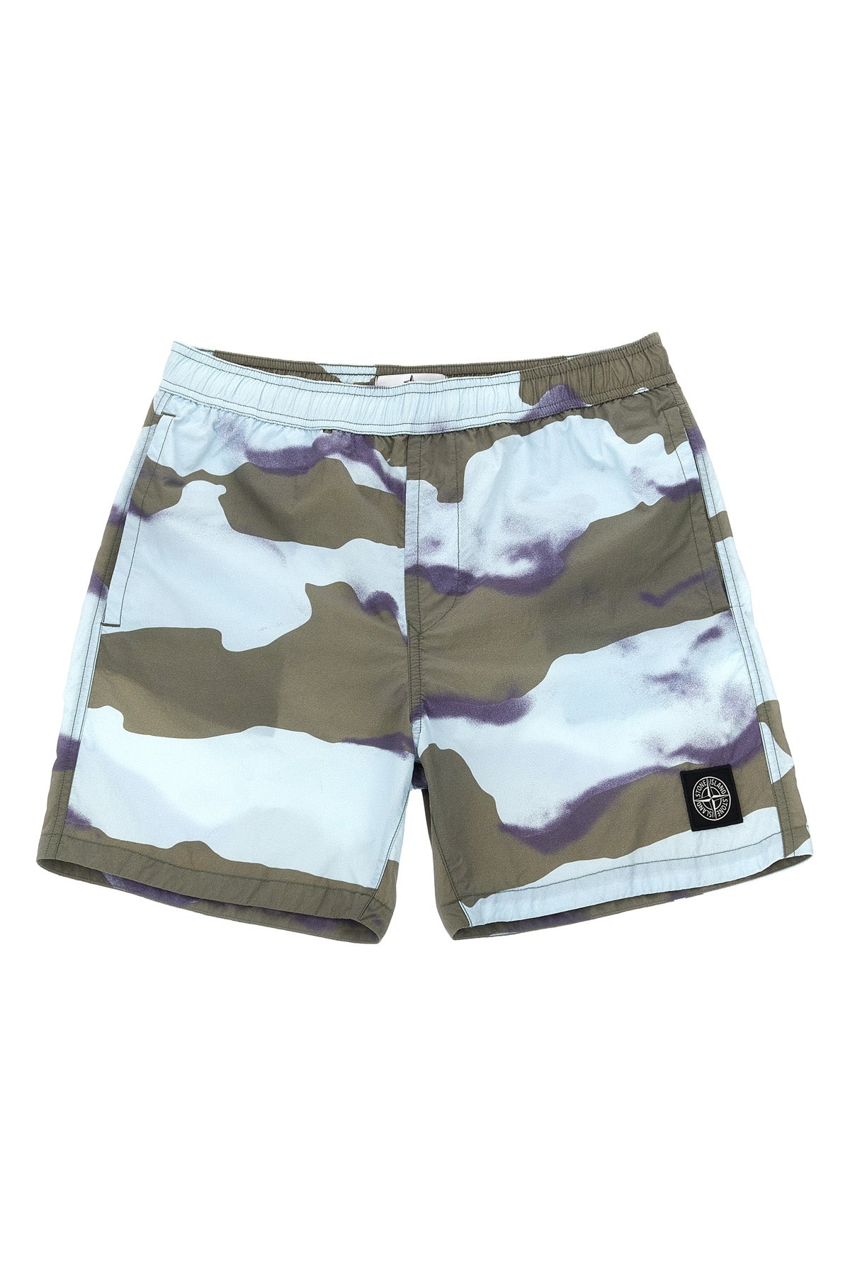 Maillot de bain en tissu technique à motifs, logo sur le devant, cordon de serrage élastique ajustable à la taille, poches, slip intérieur en filet.