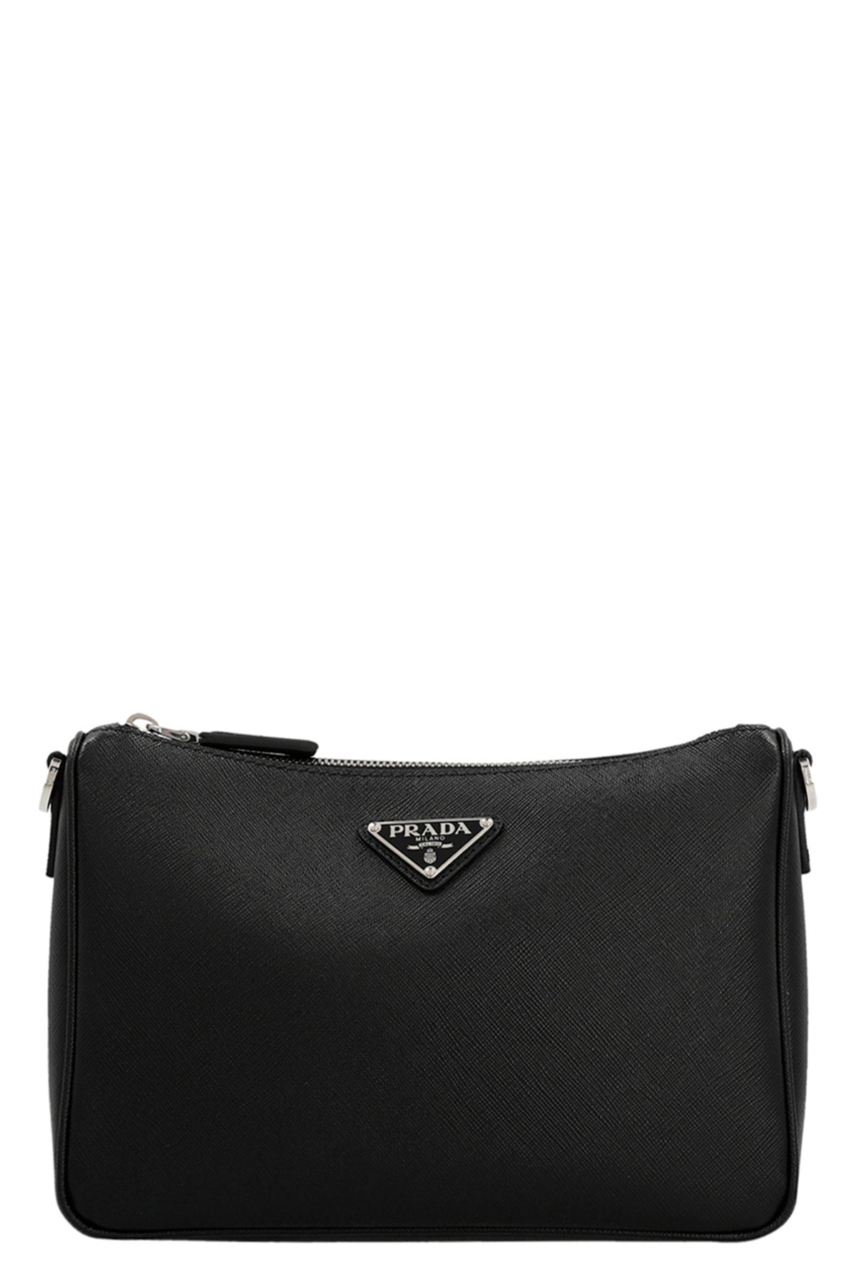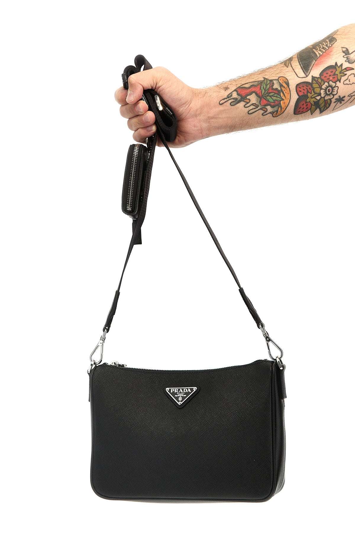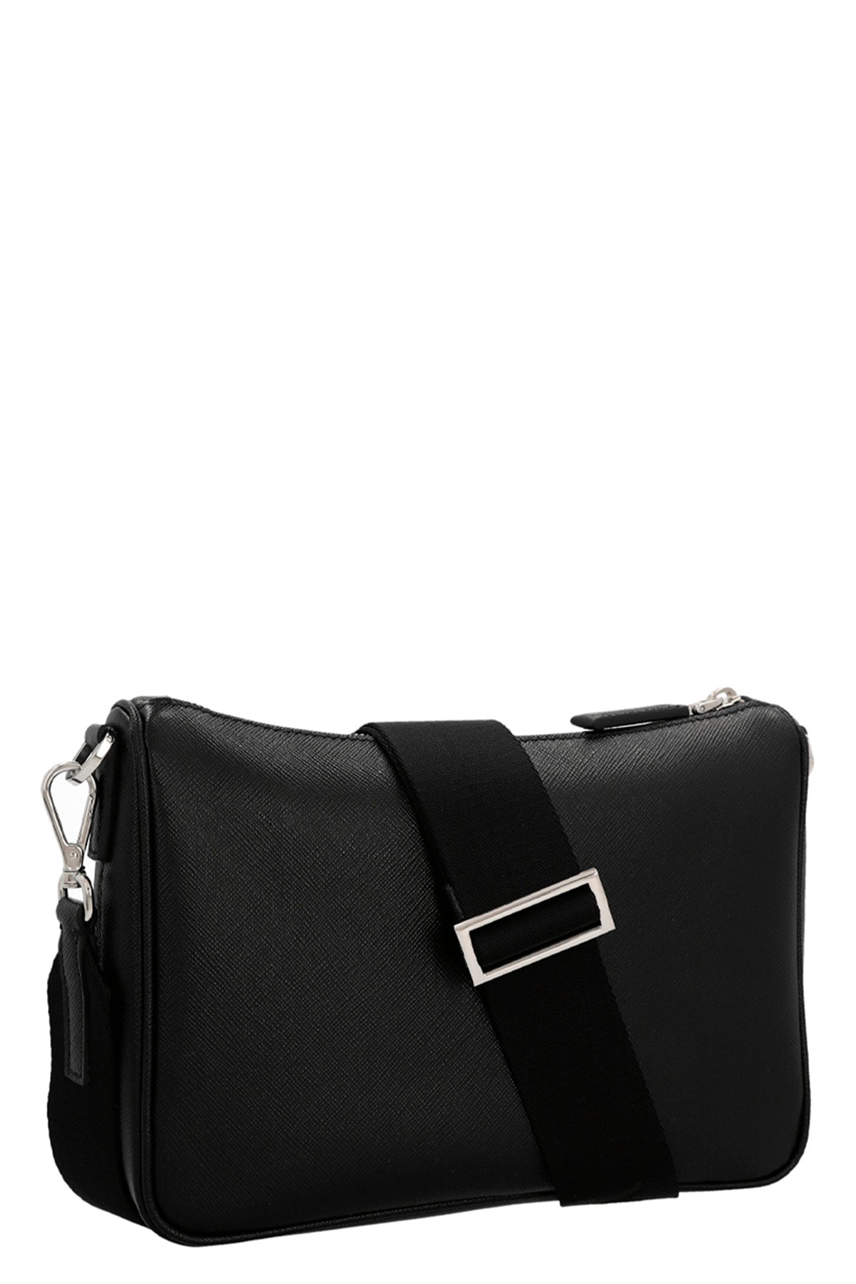 Sac bandoulière en nylon et Saffiano avec bandoulière réglable et amovible, pochette amovible, fermeture éclair et logos triangulaires.