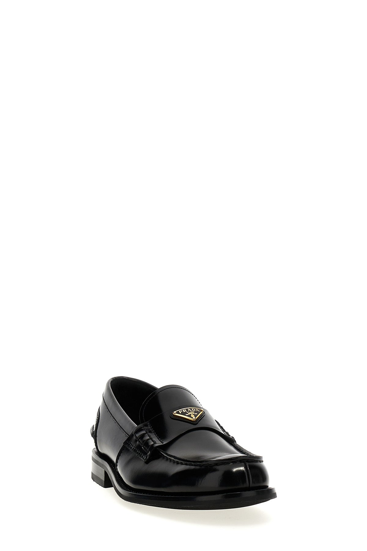 Mocassins en cuir brossé, logo triangulaire en métal émaillé appliqué, semelle en caoutchouc.