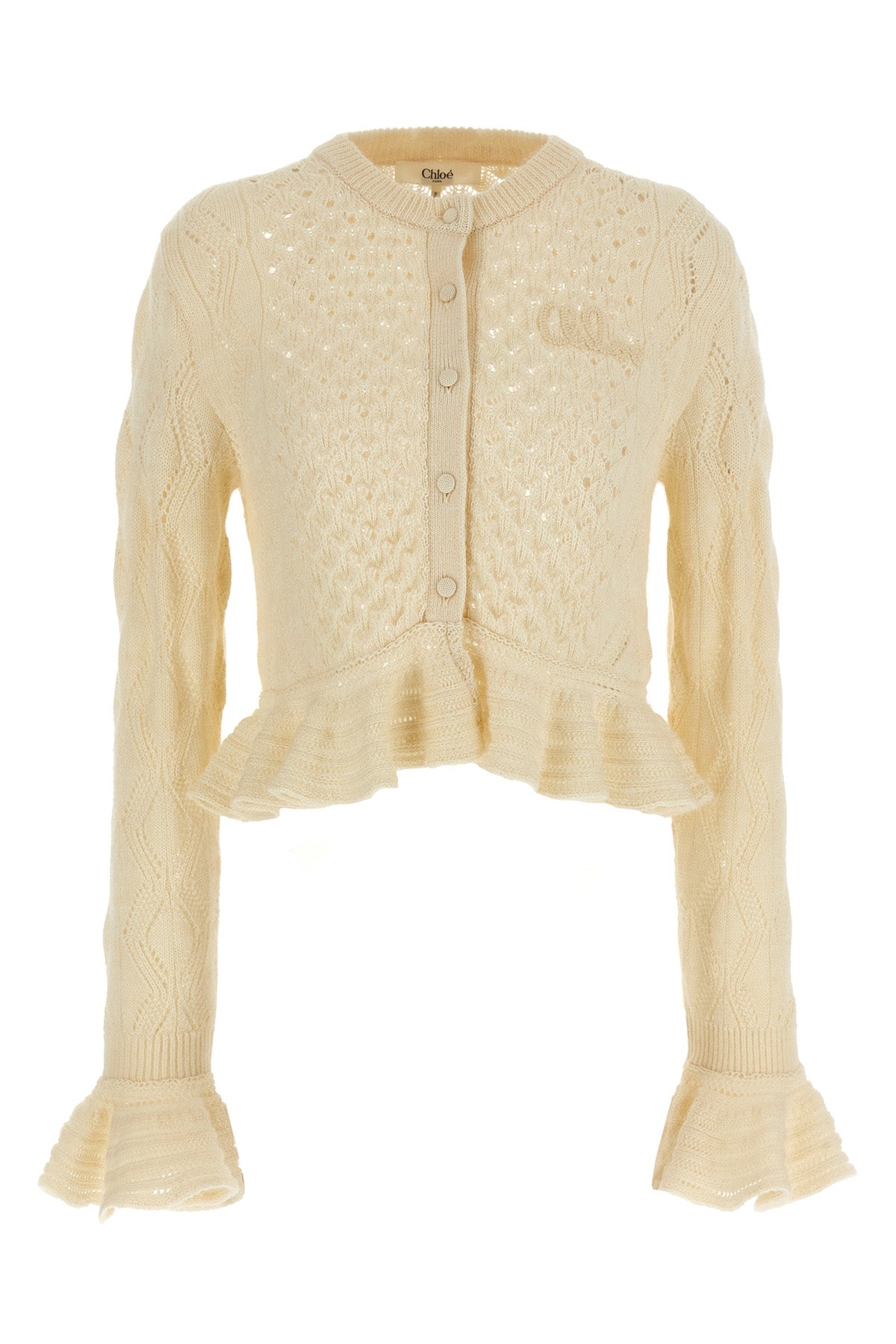 Gilet court en laine et soie mélangées, finition pointelle, ourlet à volants, col rond, broderie logo ton sur ton, fermeture boutonnée sur le devant, manches longues à poignets à volants.