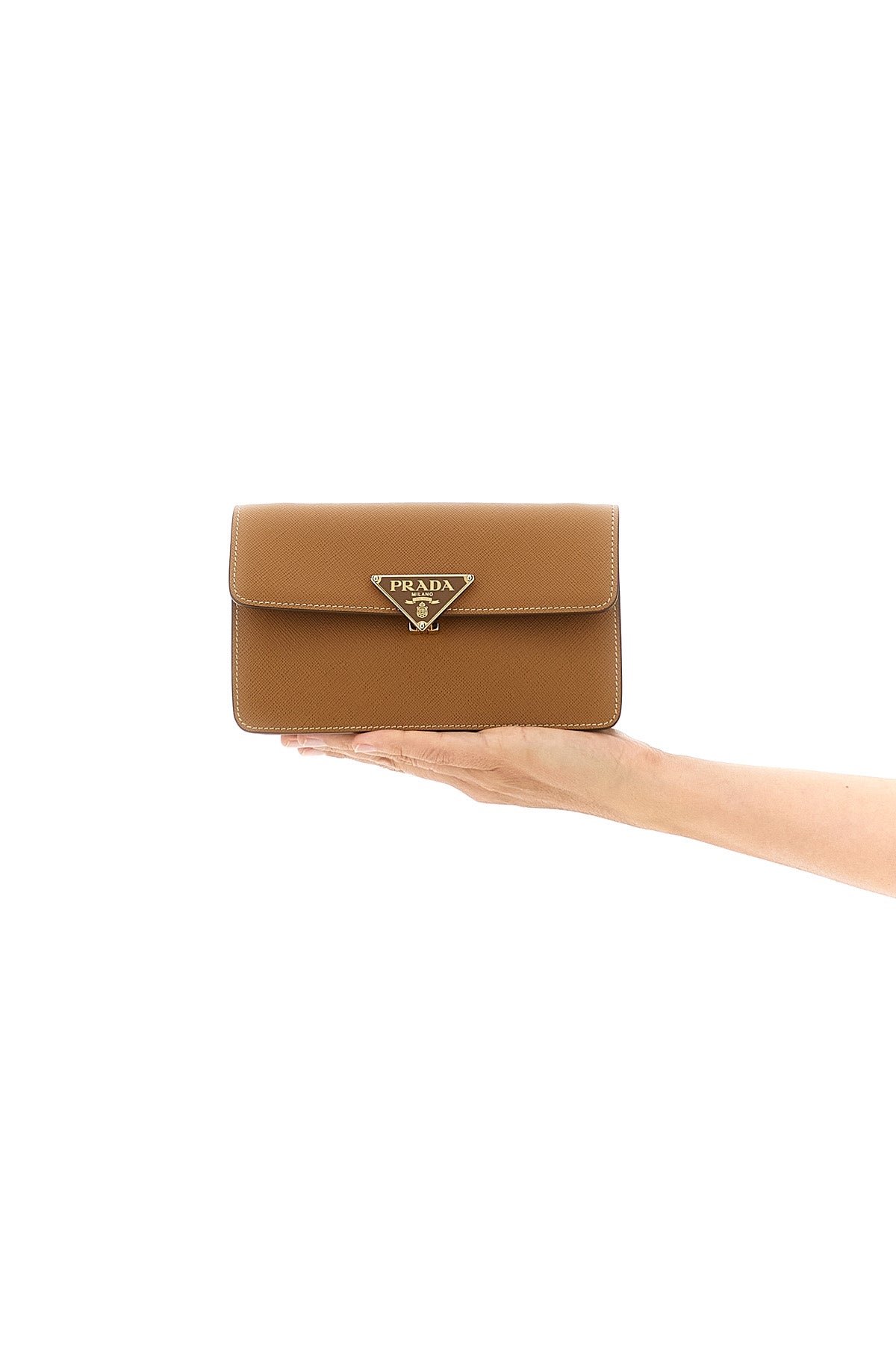 Sac bandoulière mini en cuir Saffiano, fermeture à rabat avec logo triangulaire en métal émaillé, bandoulière réglable.