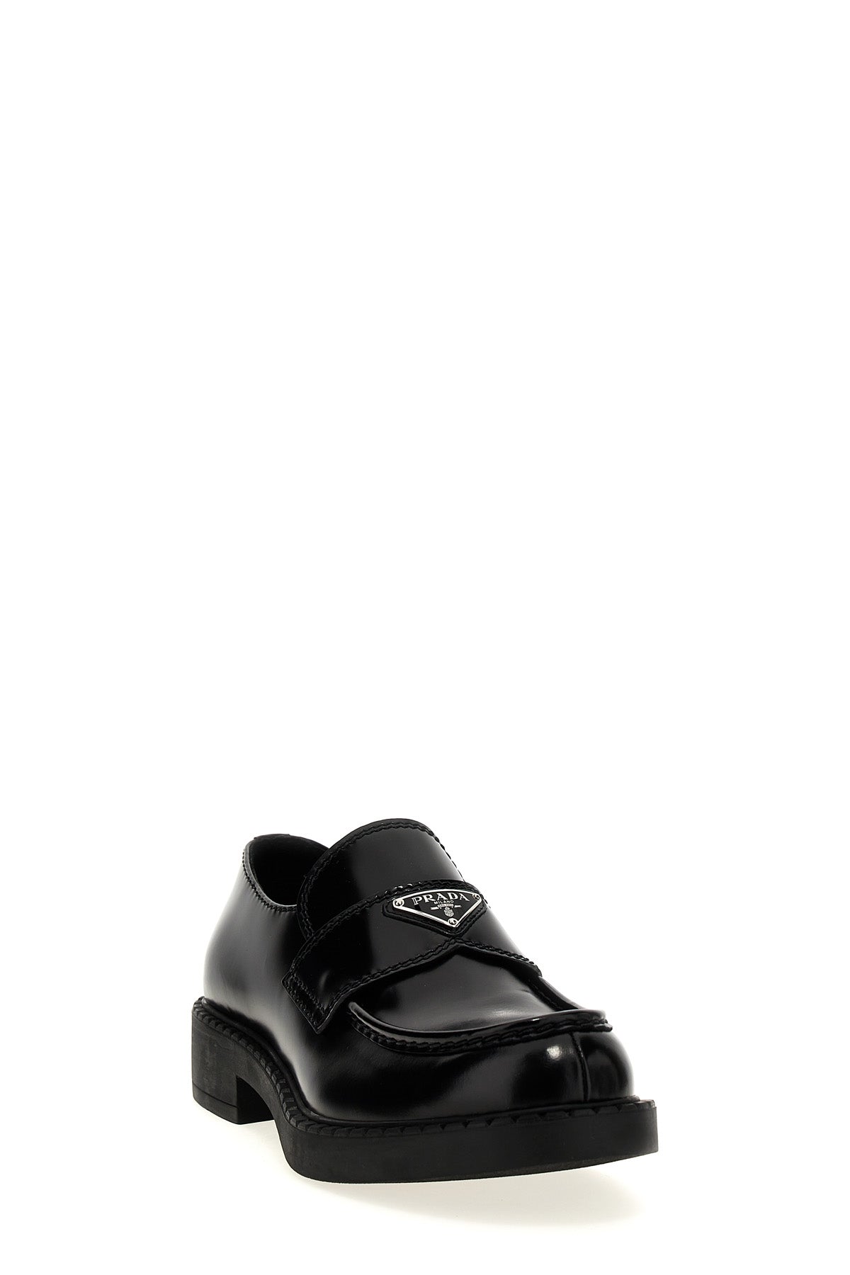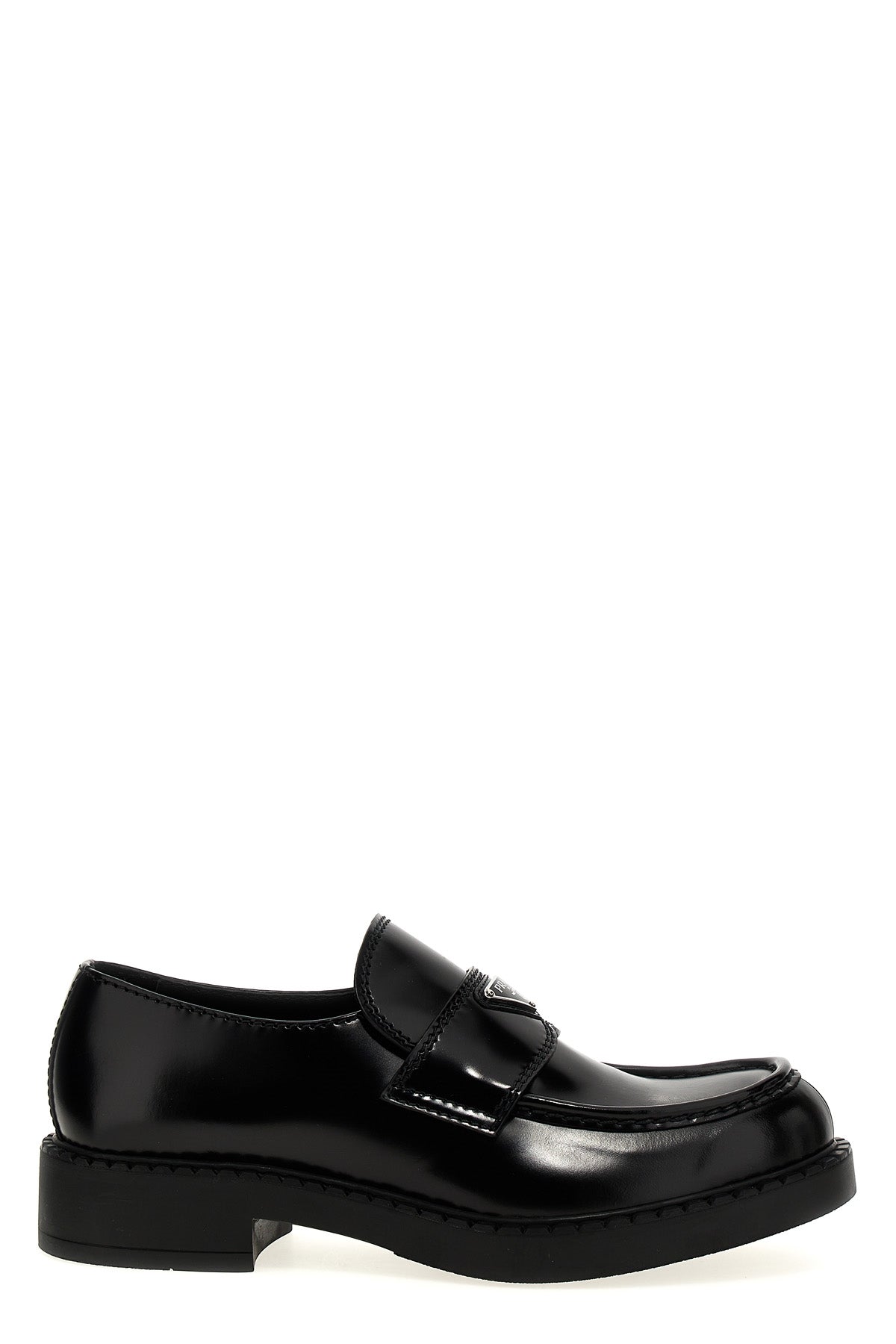 Mocassins en cuir brossé couleur chocolat avec logo triangulaire en métal émaillé sur le devant, semelle en caoutchouc.