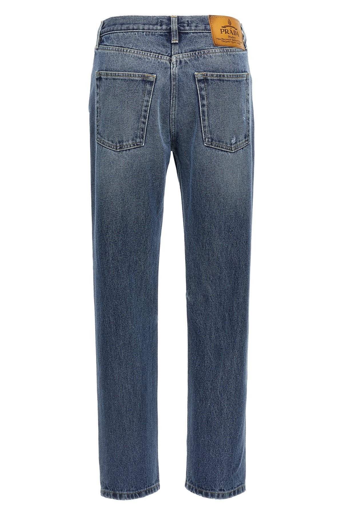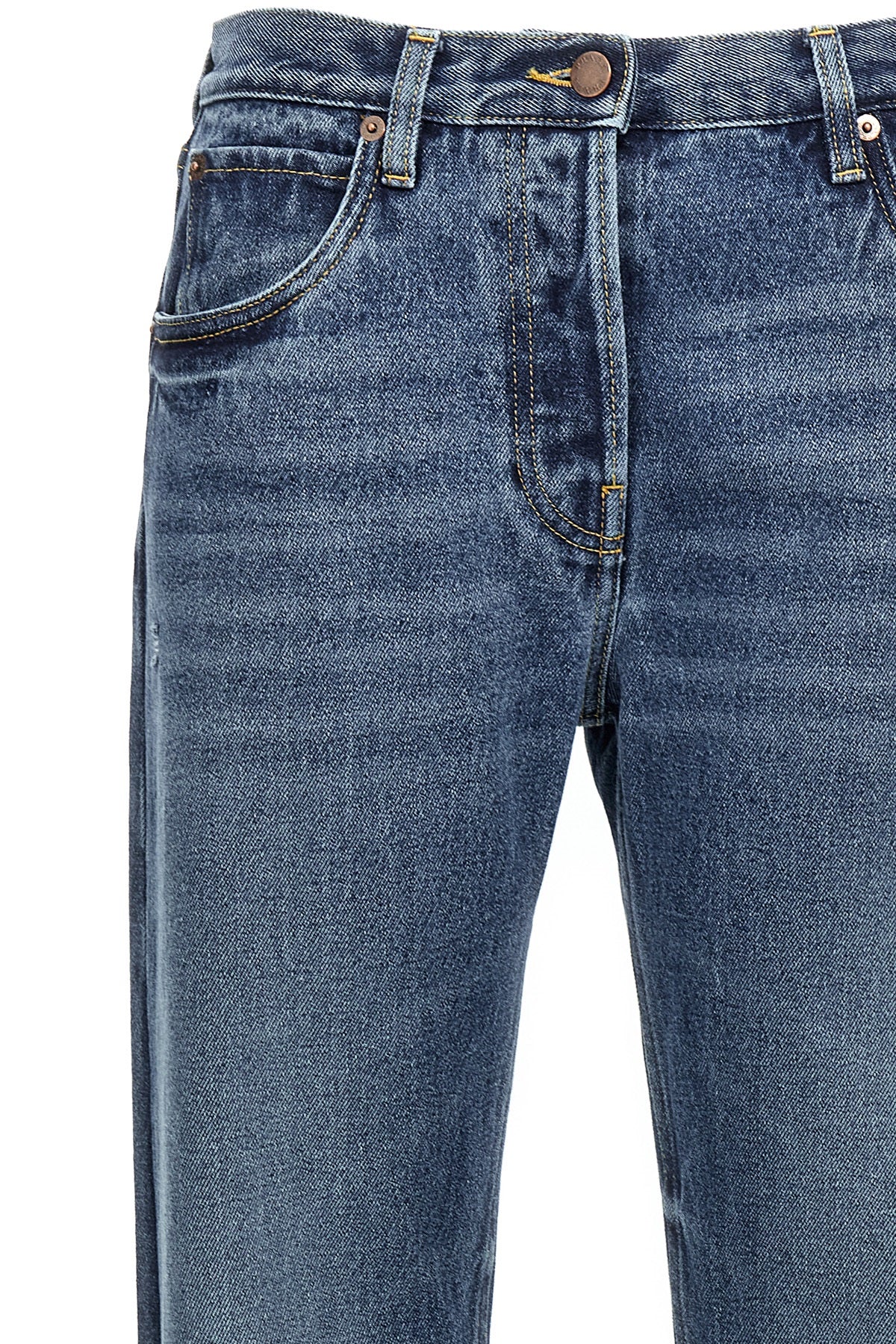 Jean en denim de coton Delavé, cinq poches, coupe droite, fermeture à boutons, étiquette logo en cuir au dos.