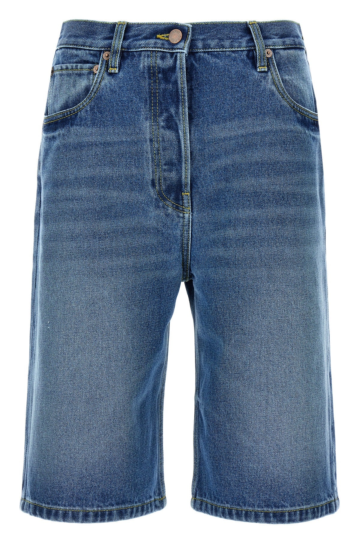 Short bermuda en denim de coton taille haute et jambes larges, délavé, cinq poches, fermeture à boutons et étiquette logo en cuir au dos.