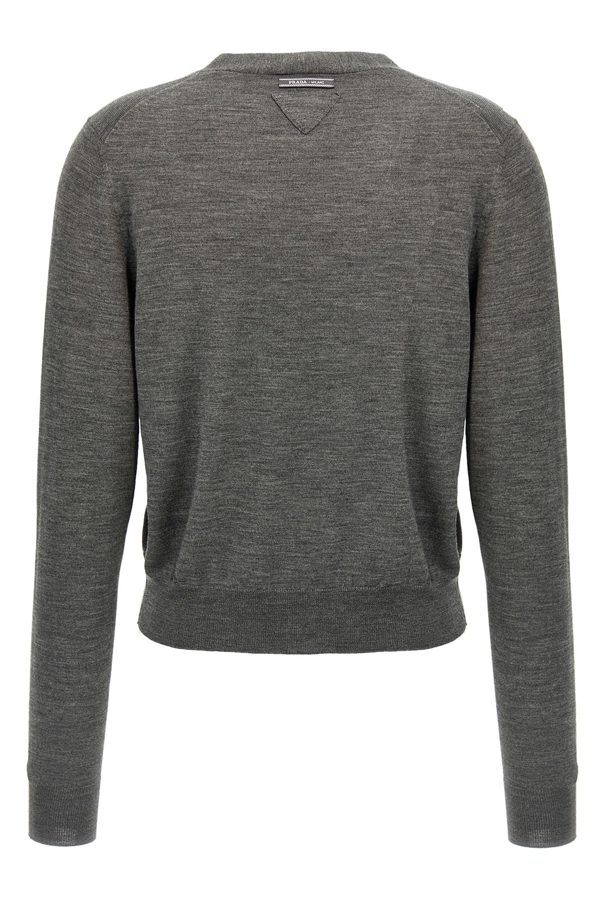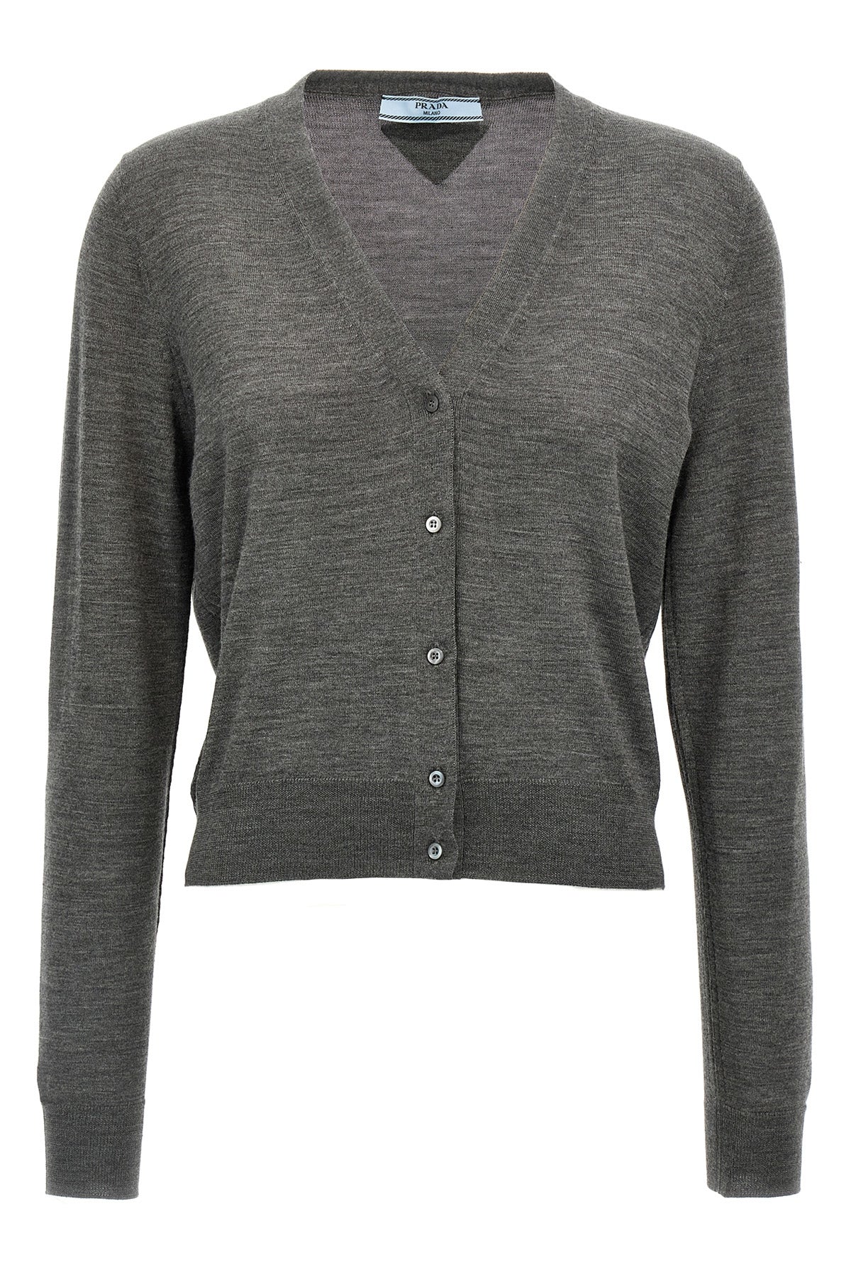 Gilet en laine vierge, logo triangulaire ton sur ton au dos, col en V, fermeture boutonnée, manches longues à poignets boutonnés.