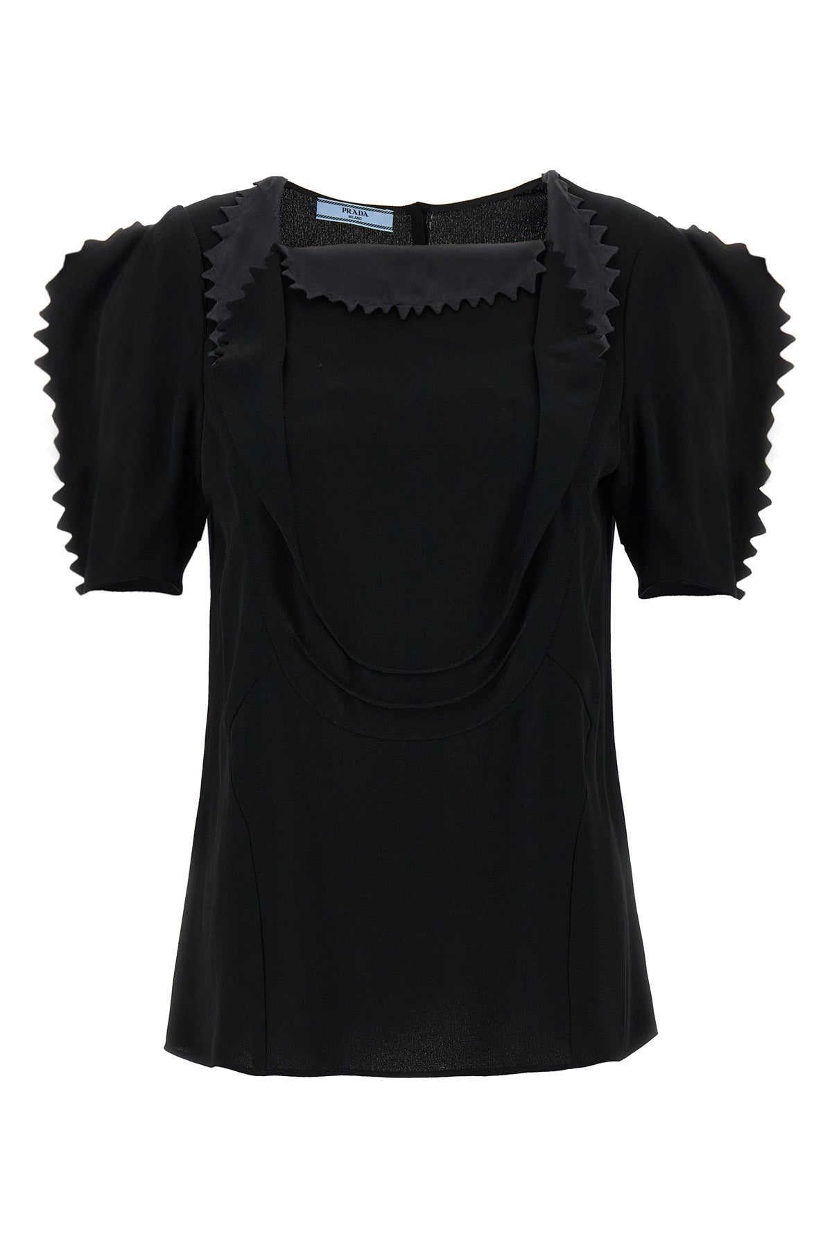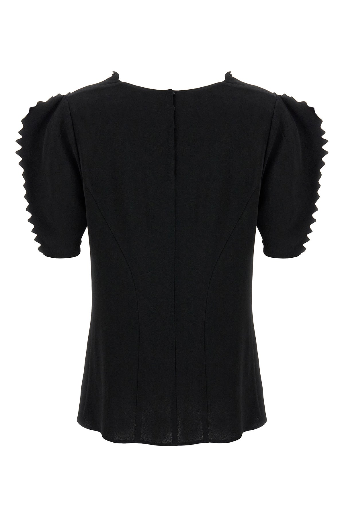 Top en crêpe cady avec plis et drapés sur le devant, encolure carrée, fermeture à boutons-pression au dos et manches courtes ballon.