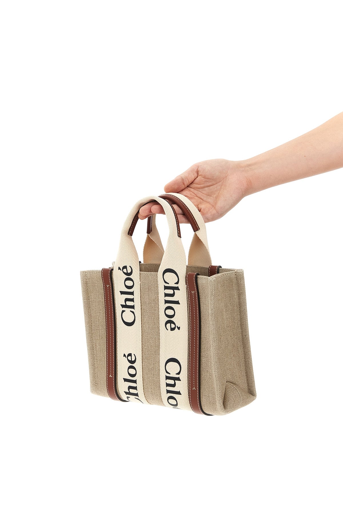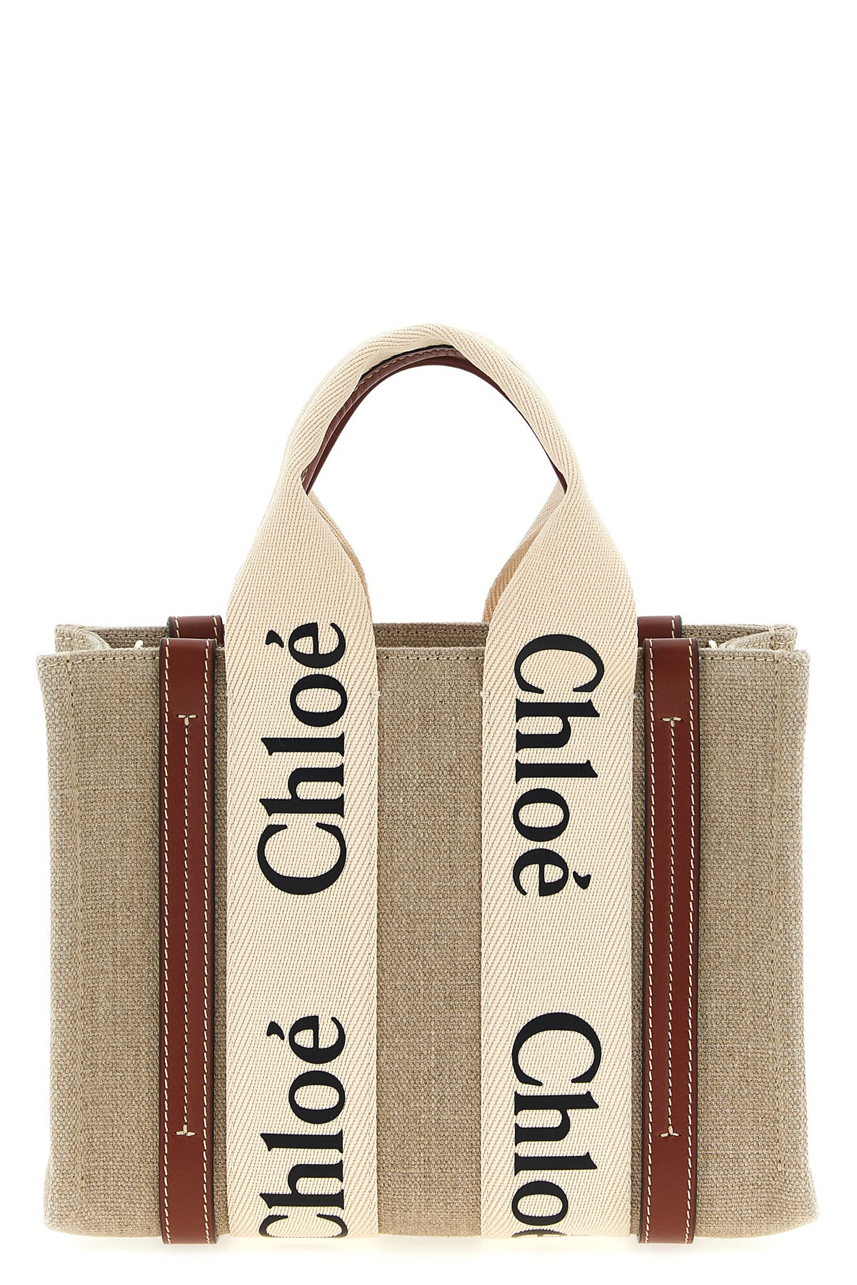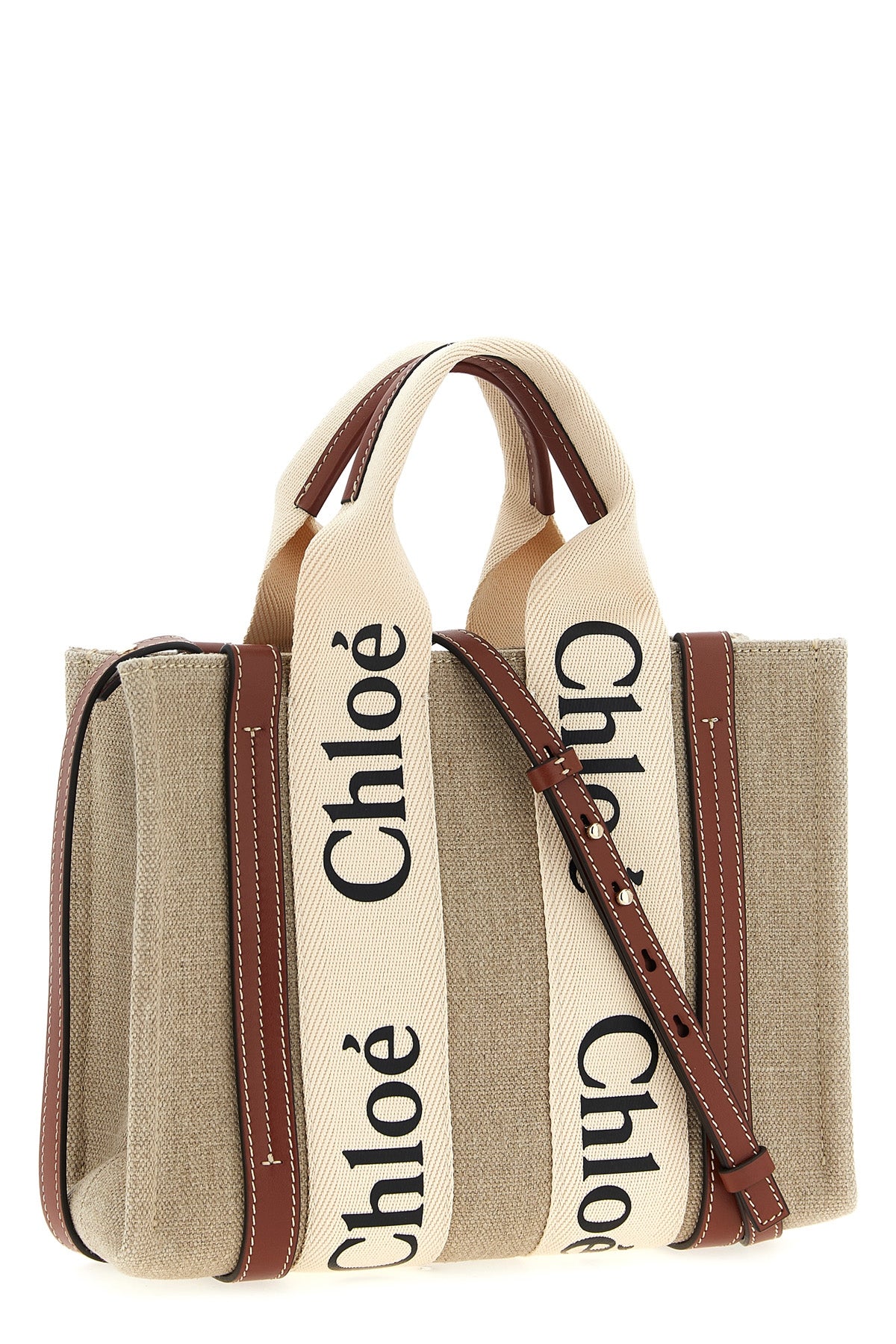 Sac cabas Woody Small en toile avec détails en cuir, double poignée avec logo, bandoulière en cuir réglable et amovible.