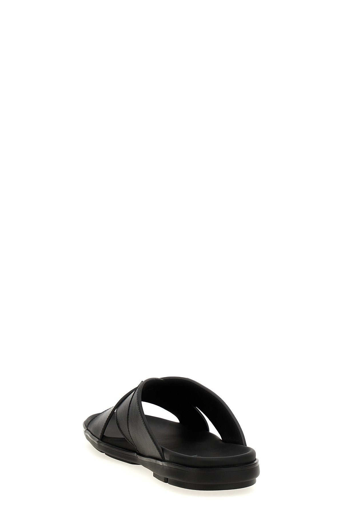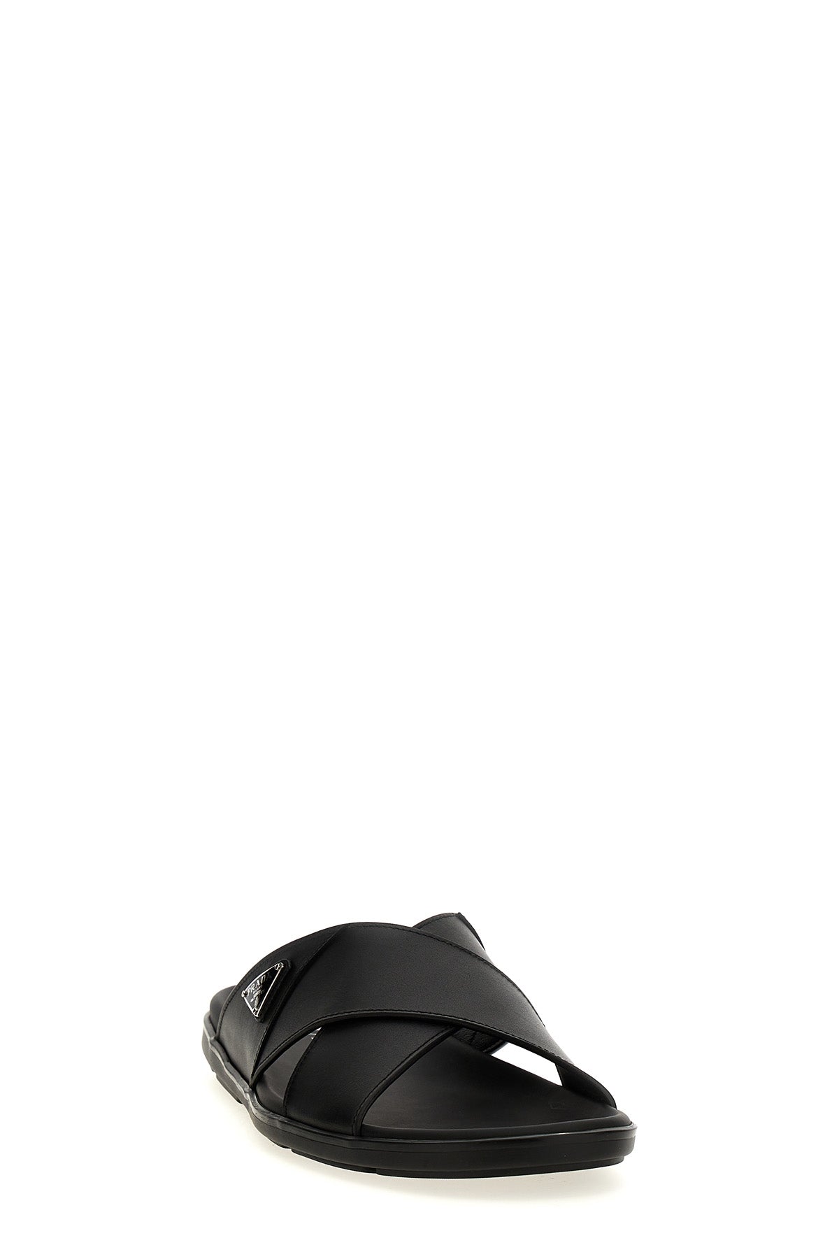Sandale en cuir, logo triangulaire en métal émaillé sur le côté, semelle en caoutchouc.