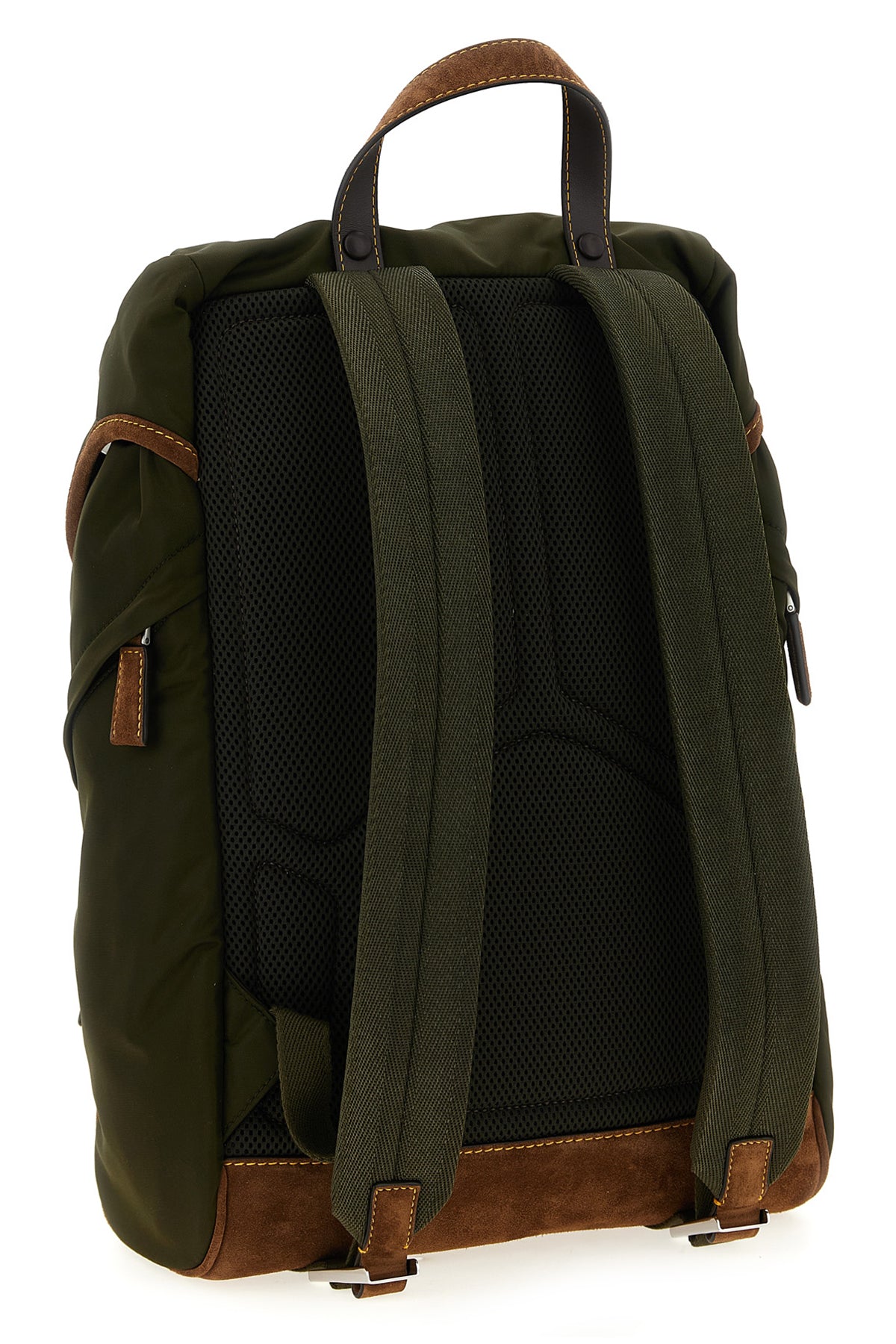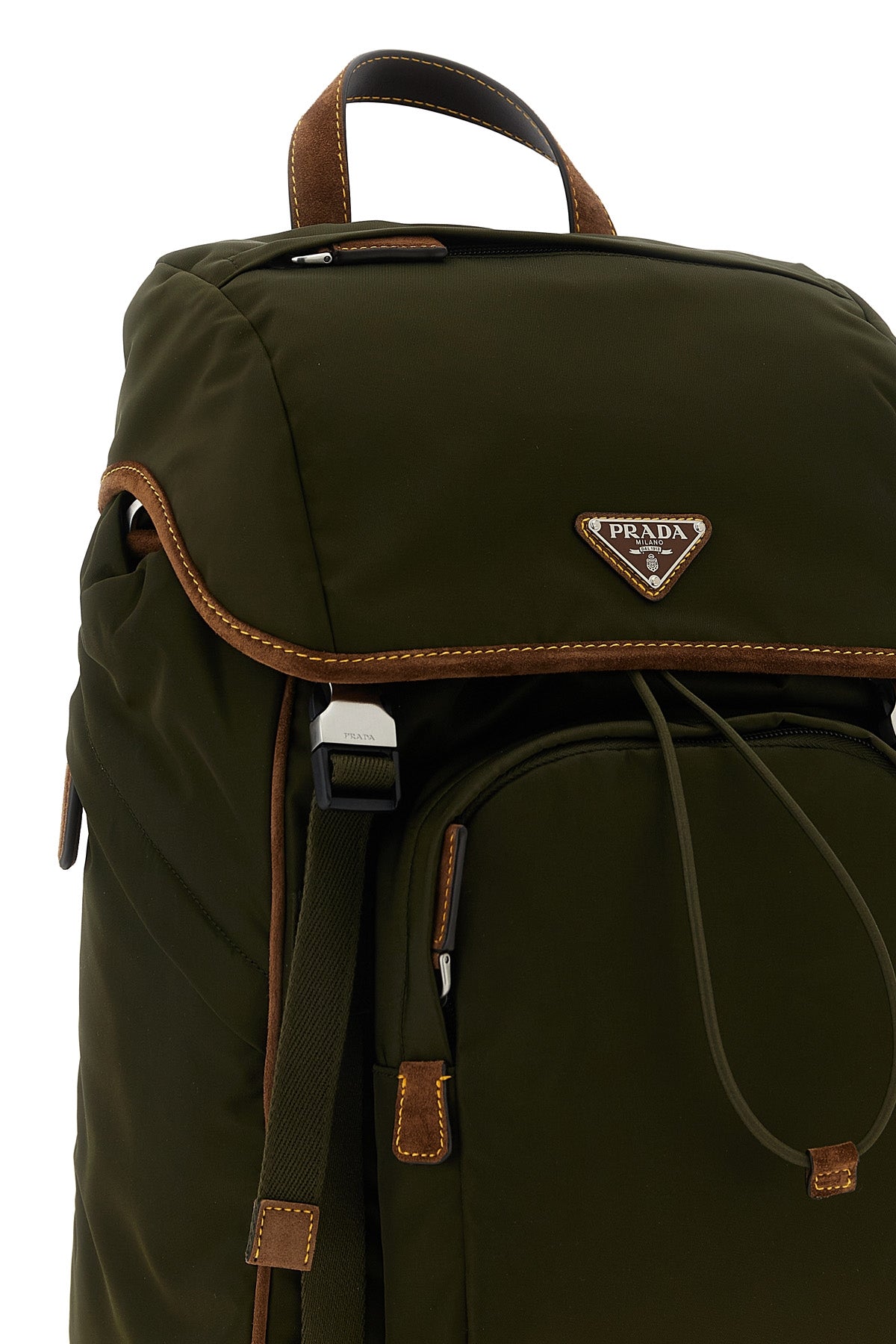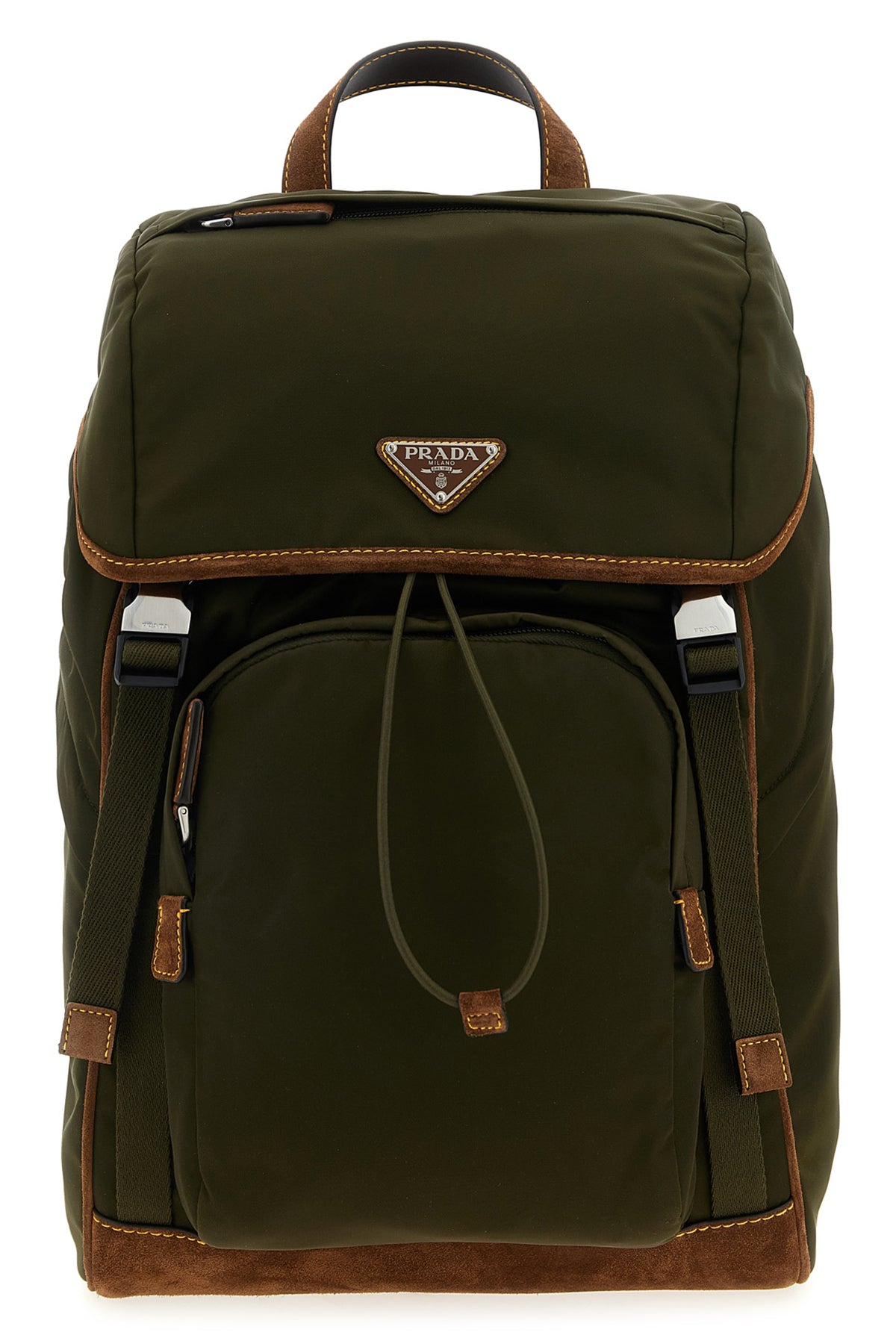 Sac à dos en Re-Nylon avec détails en daim, fermeture à rabat avec double boucle et logo triangulaire en métal émaillé sur le devant, poignée fixe, poches, fermeture intérieure par cordon, bretelles réglables, dos rembourré. Durable : Ce produit est fabriqué en Re-Nylon, un fil régénéré à partir de plastique recyclé et purifié collecté dans les océans, les filets de pêche et les fibres textiles.