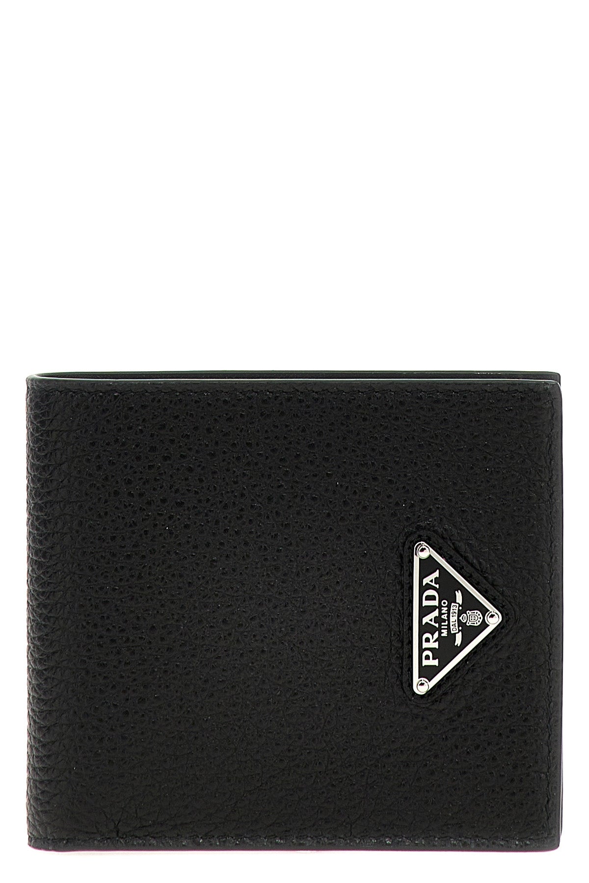 Portefeuille en cuir grenat, logo triangulaire en métal émaillé sur le devant, ouverture pliante, huit emplacements pour cartes et deux compartiments pour billets.