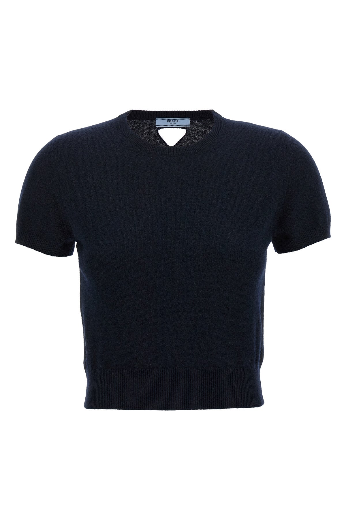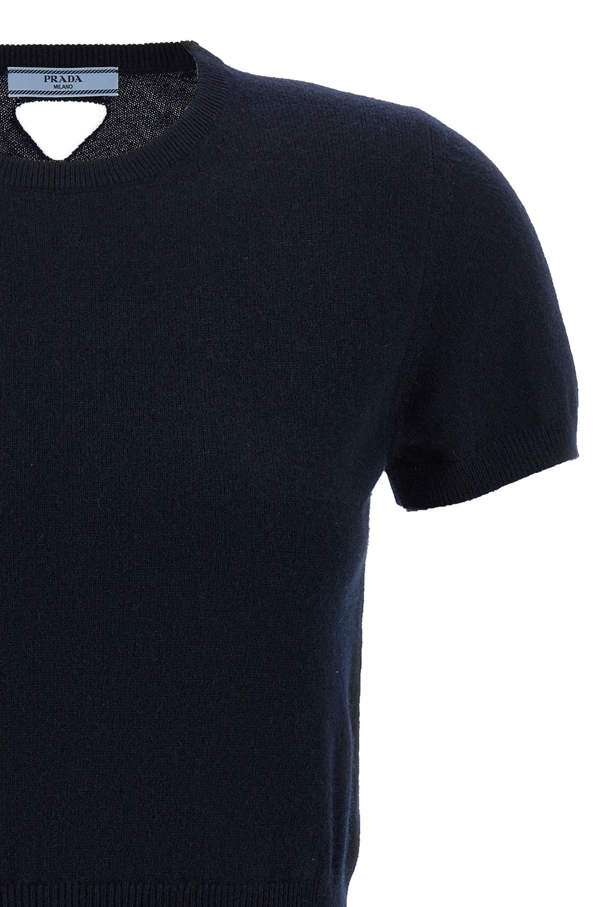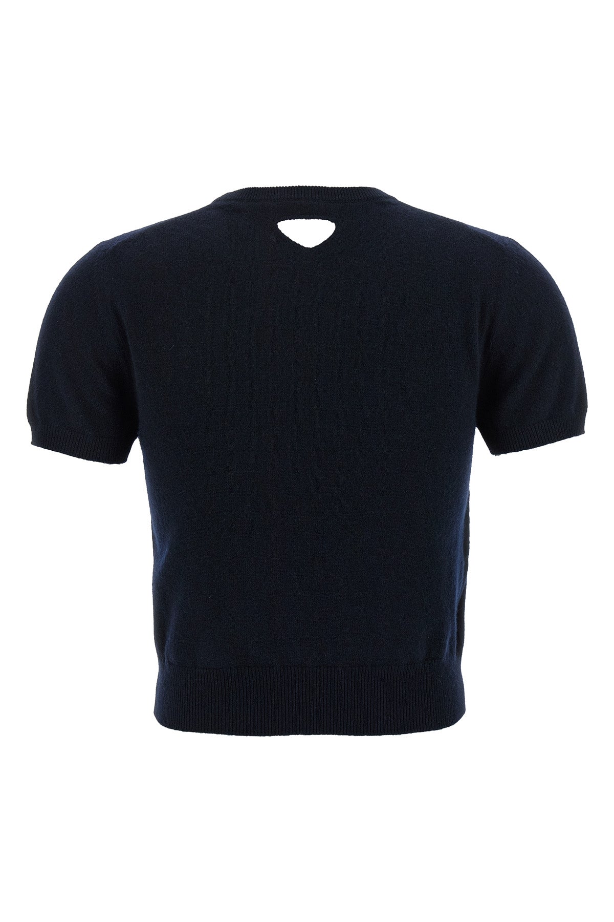 Pull en cachemire, modèle court, logo triangulaire ajouré au dos, col rond, manches courtes.