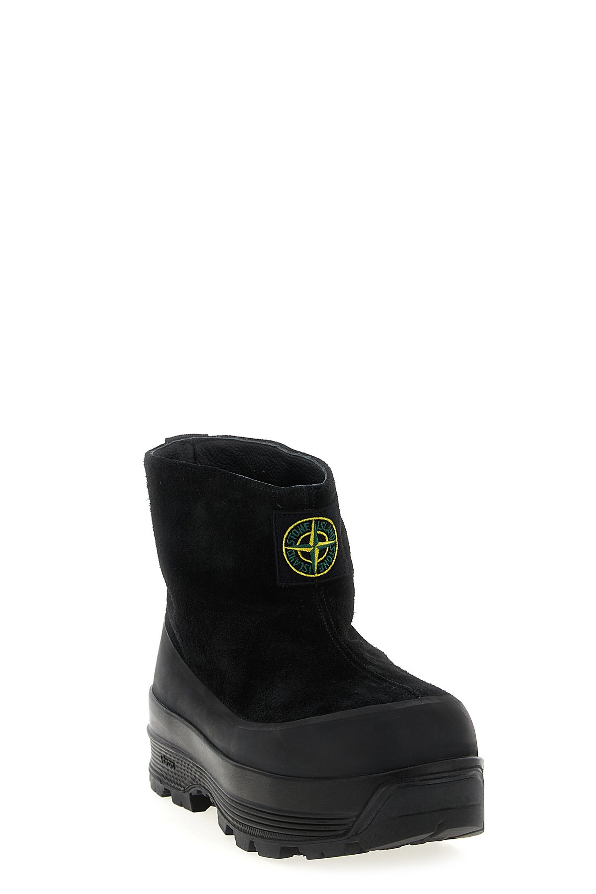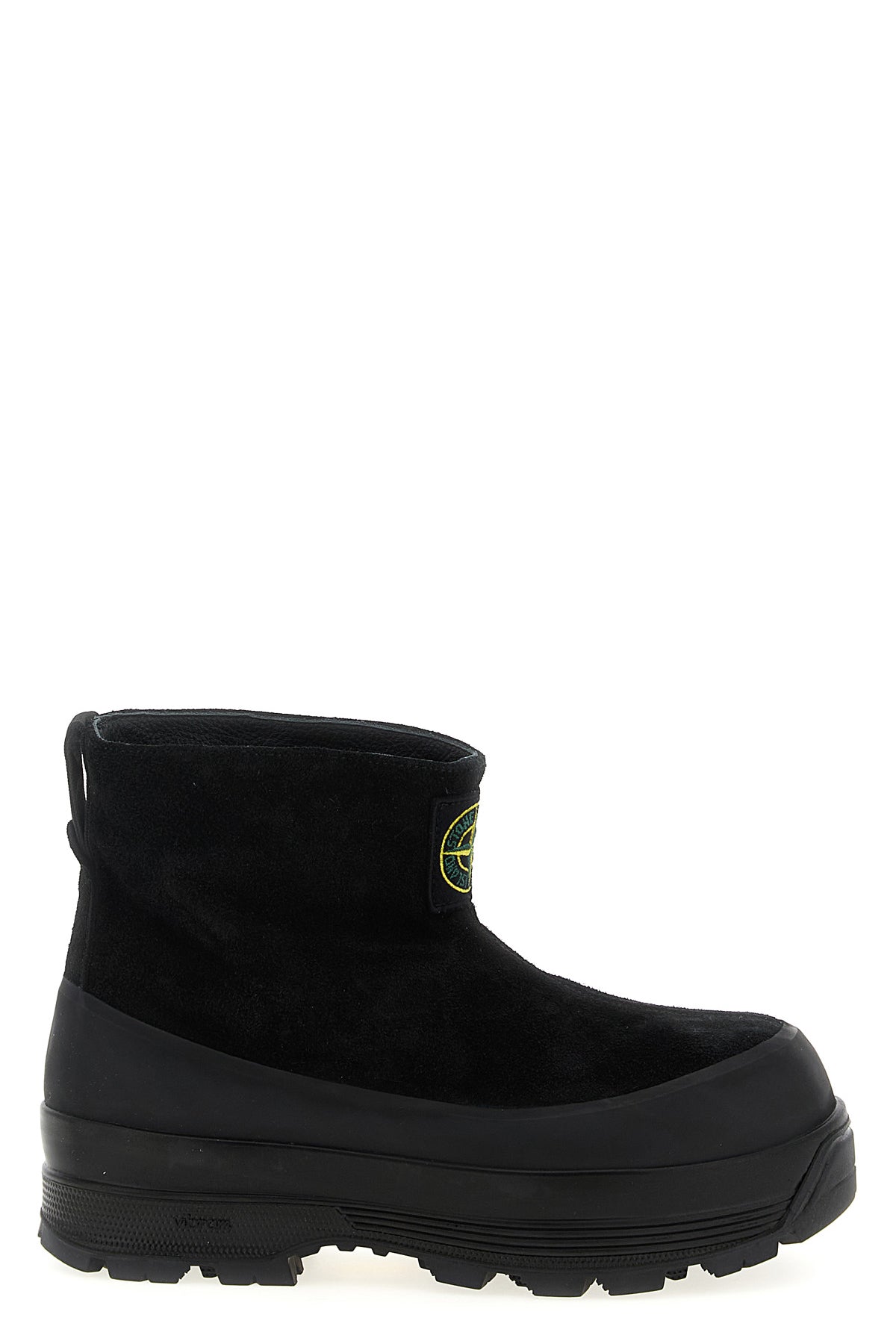 Bottines en daim finies avec un large élastique, un logo sur le devant, modèle à enfiler, semelle en caoutchouc Vibram.