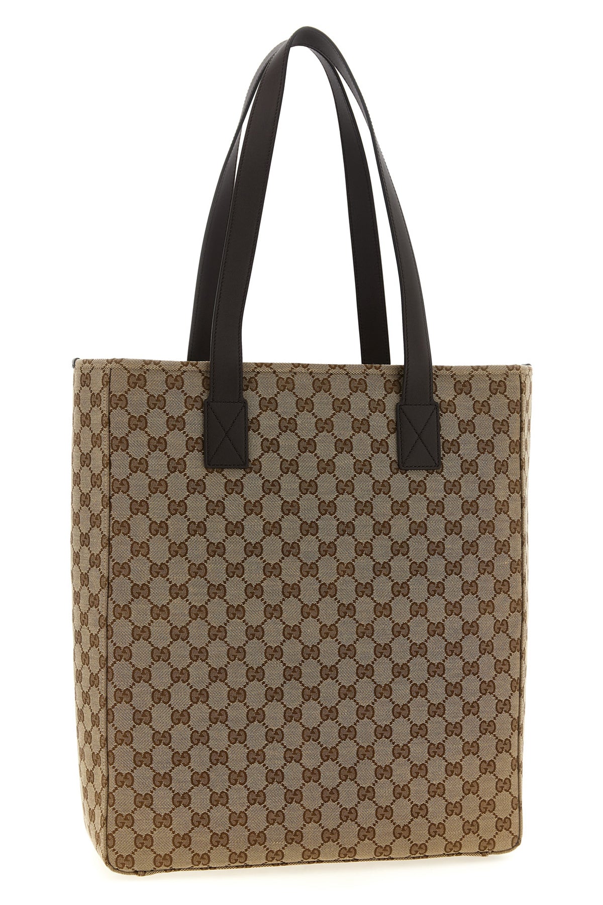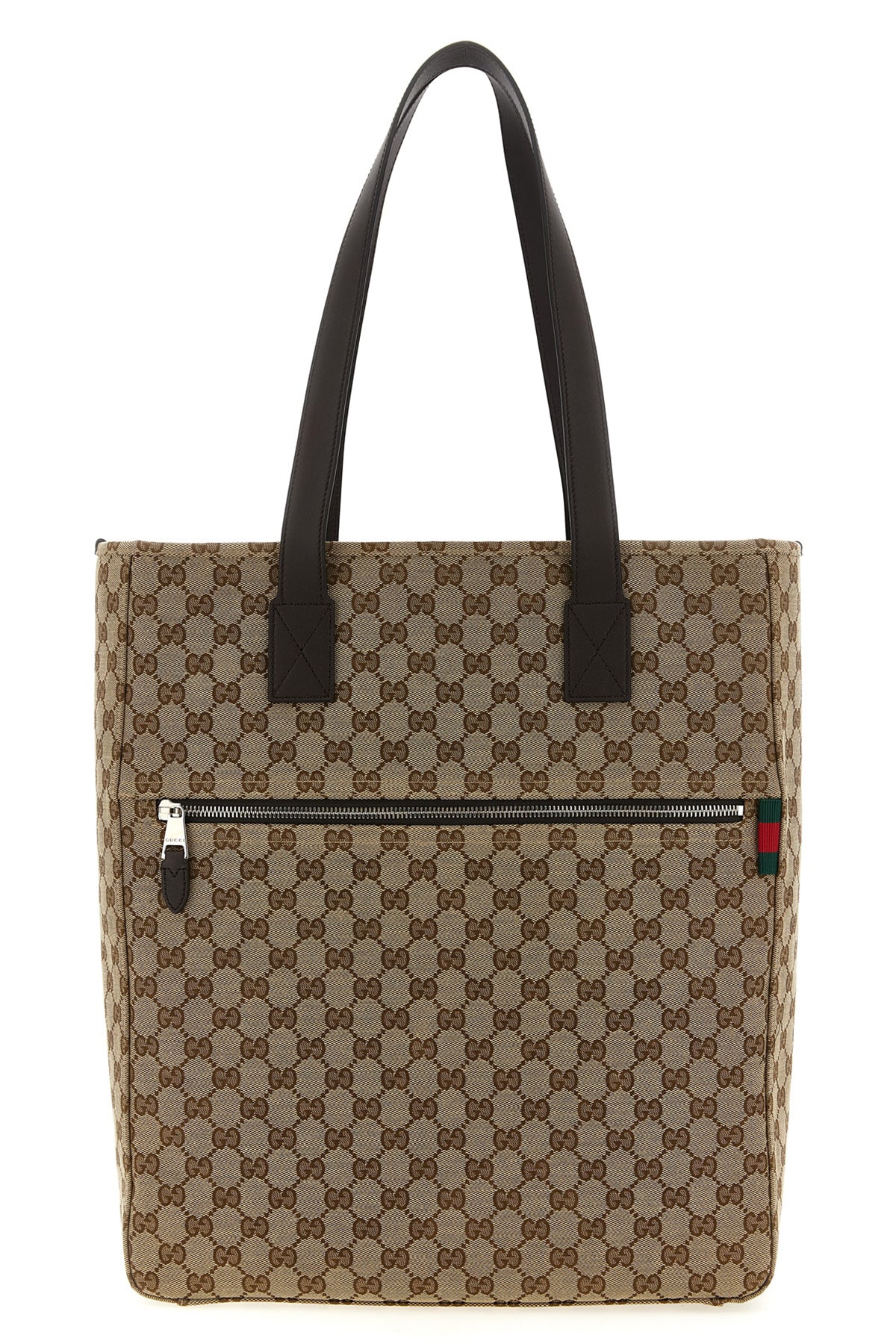 Sac bandoulière en tissu GG, double poignée fixe en cuir, fermeture zippée sur le dessus, poche zippée sur le devant et détail en ruban, doublure en nylon.