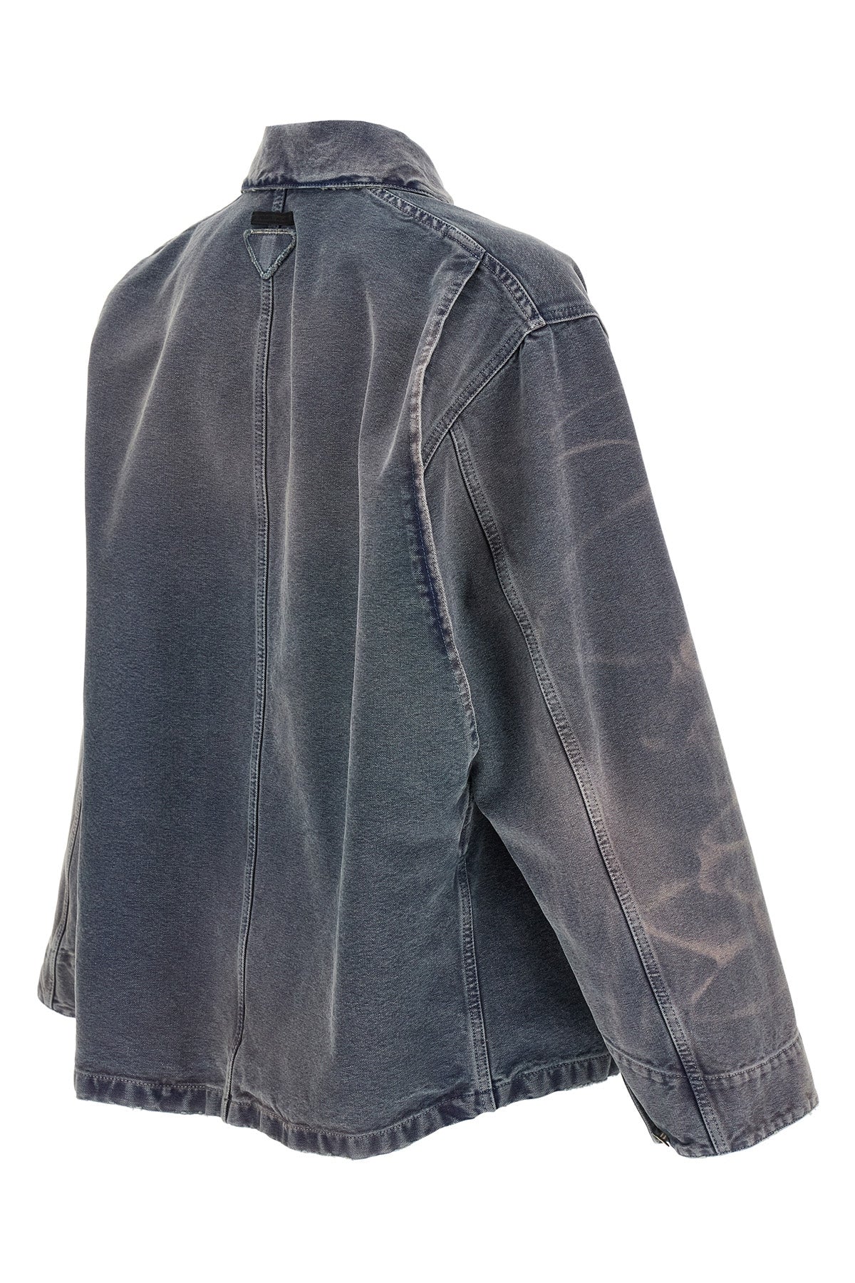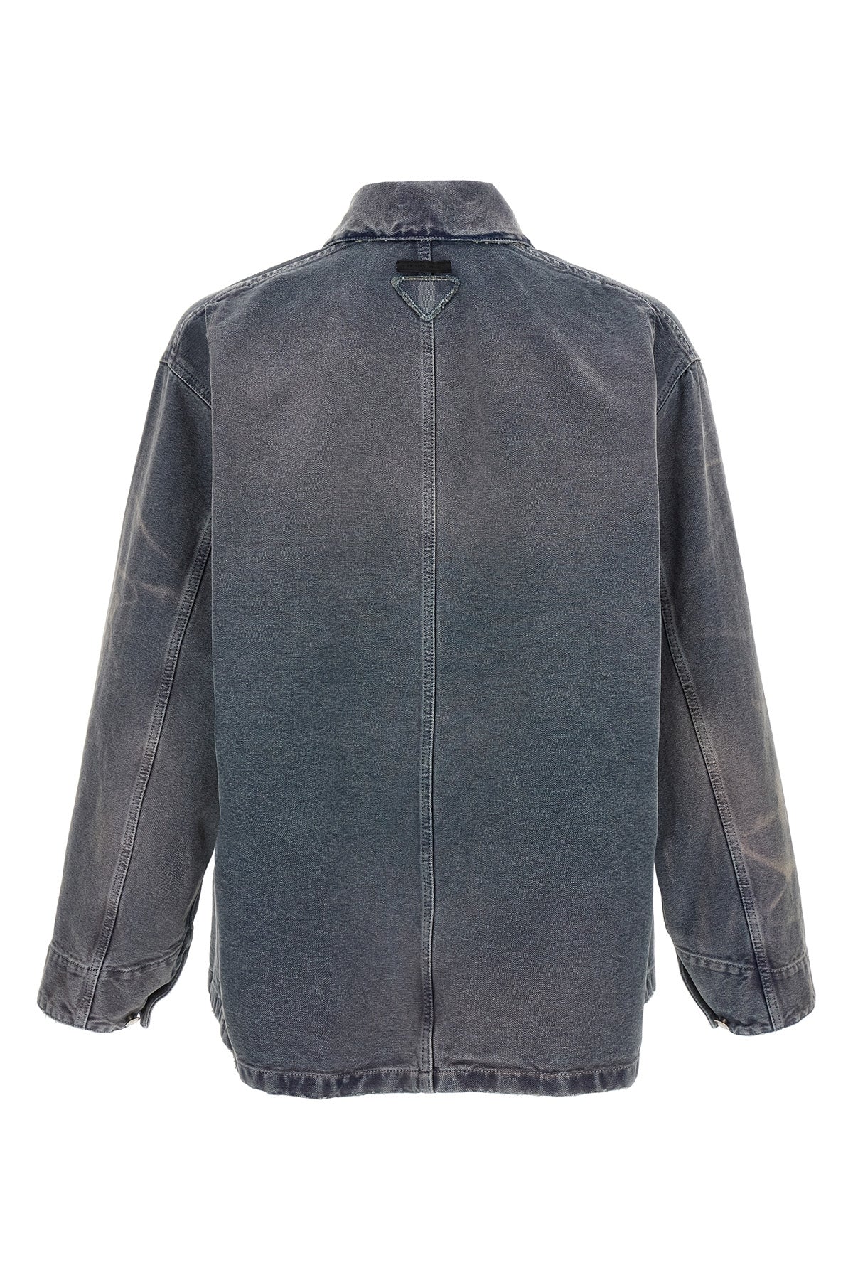 Blouson en toile de coton à effet vieilli, teint en pièce et traité à l'aérographe, logo triangulaire ton sur ton au dos, non doublé, col chemise, fermeture boutonnée sur le devant, poches, manches longues à épaules tombantes.