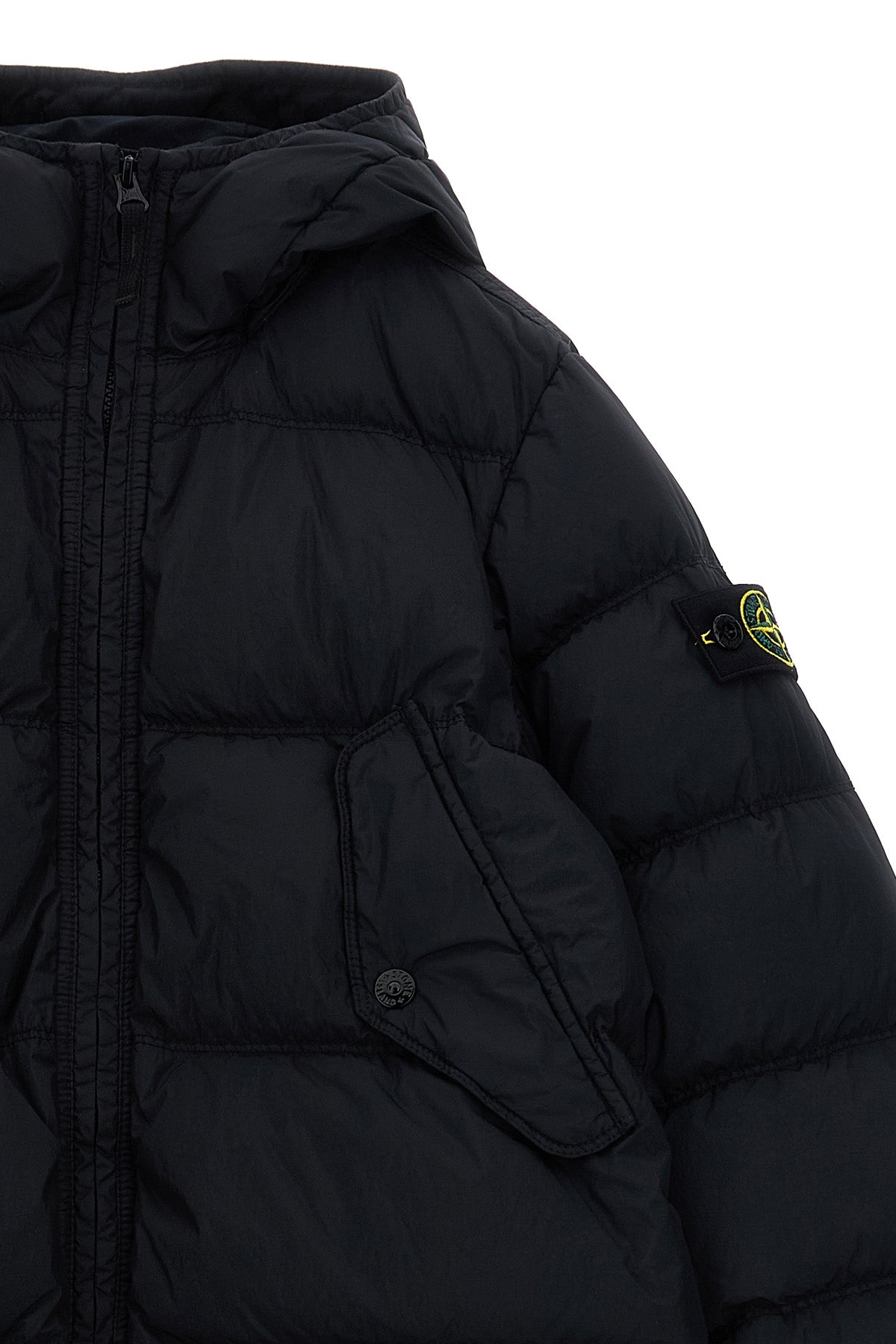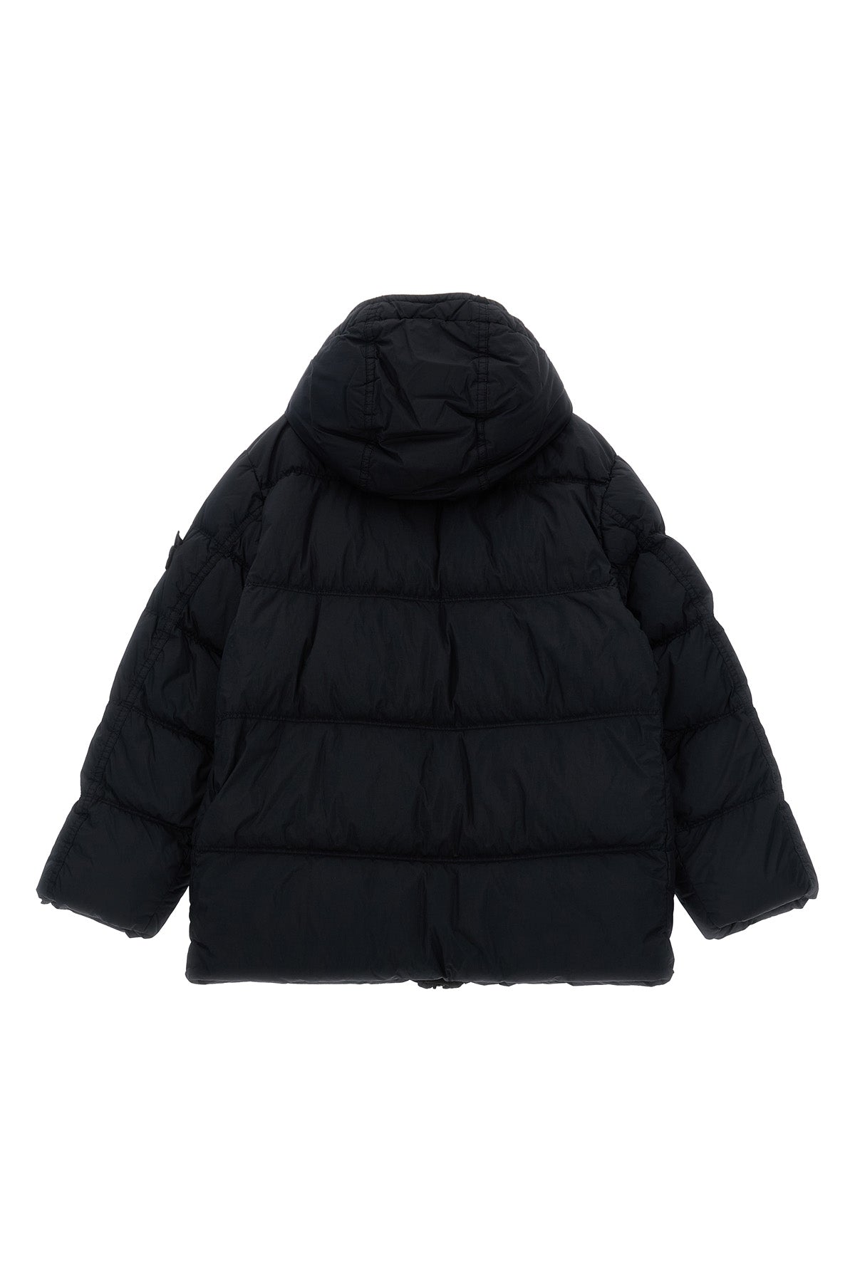 Doudoune matelassée en tissu synthétique teint, garnie de duvet d'oie froissé, capuche, col montant, fermeture éclair sur le devant, poches, manches longues avec poignets élastiques et logo.