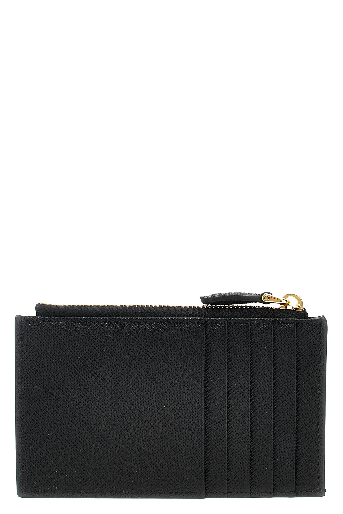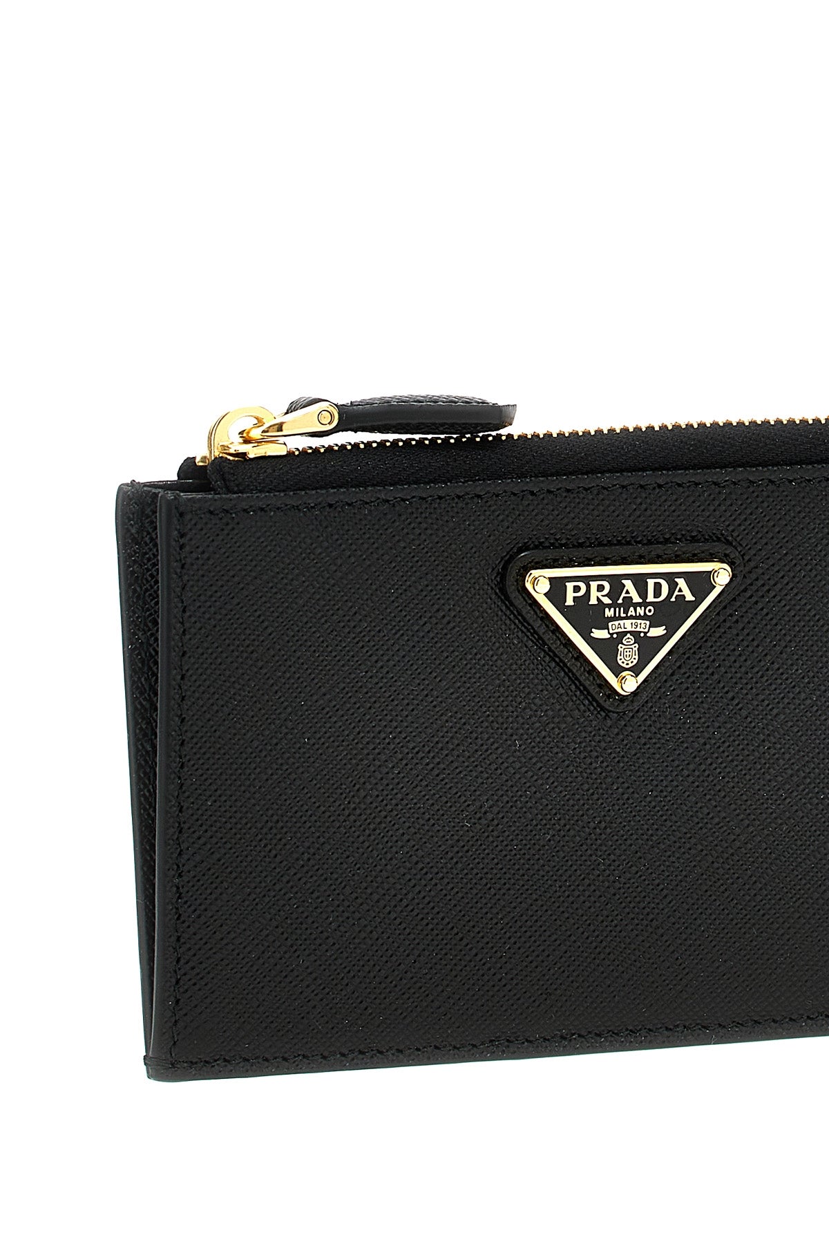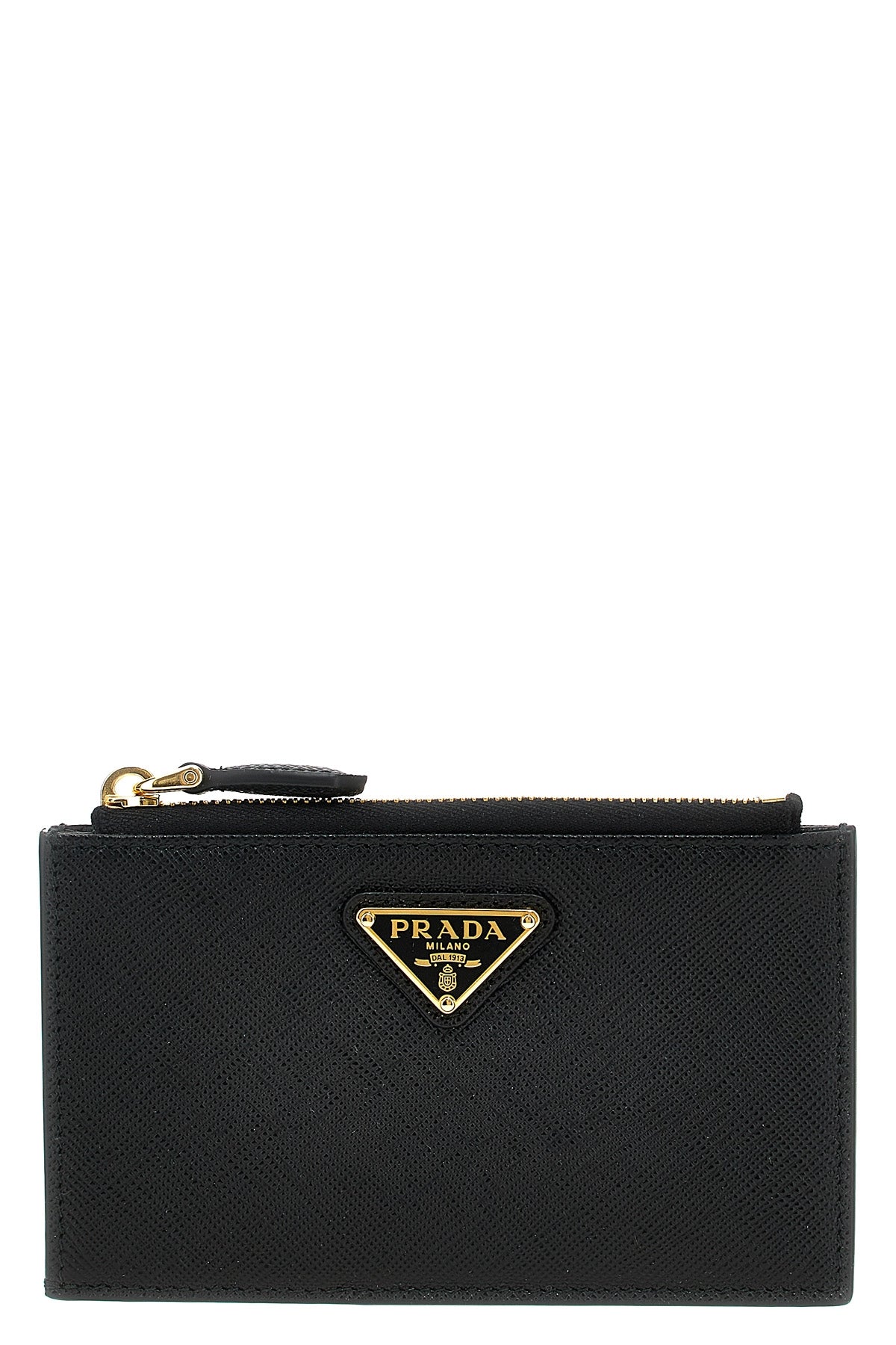 Porte-cartes Saffiano, logo triangulaire en métal émaillé appliqué sur le devant, fermeture éclair.