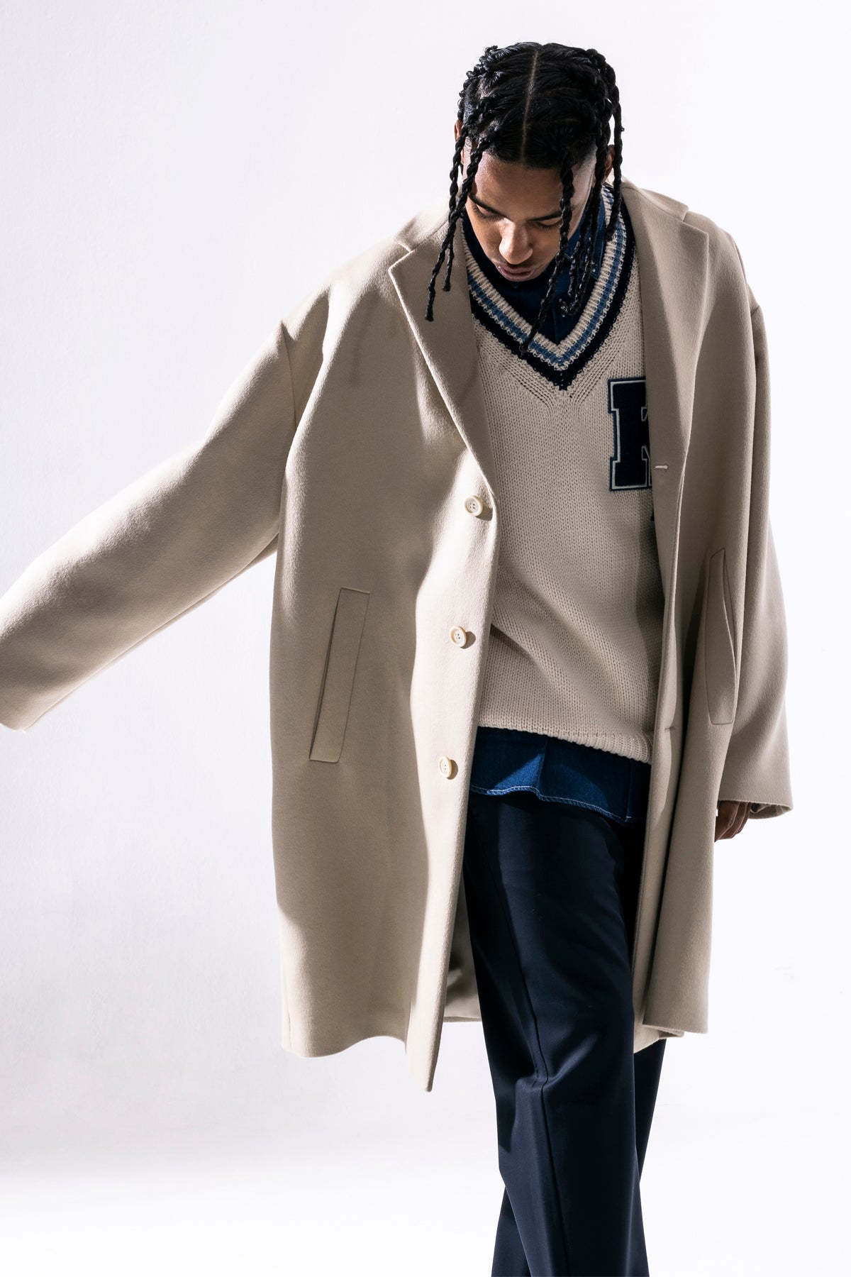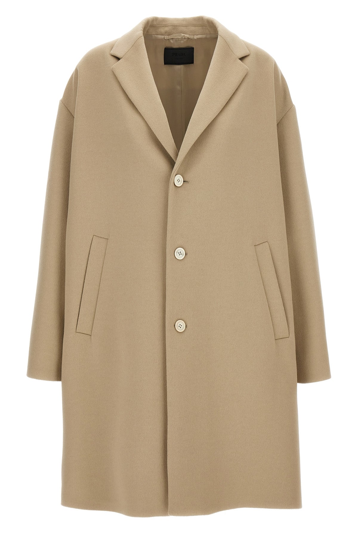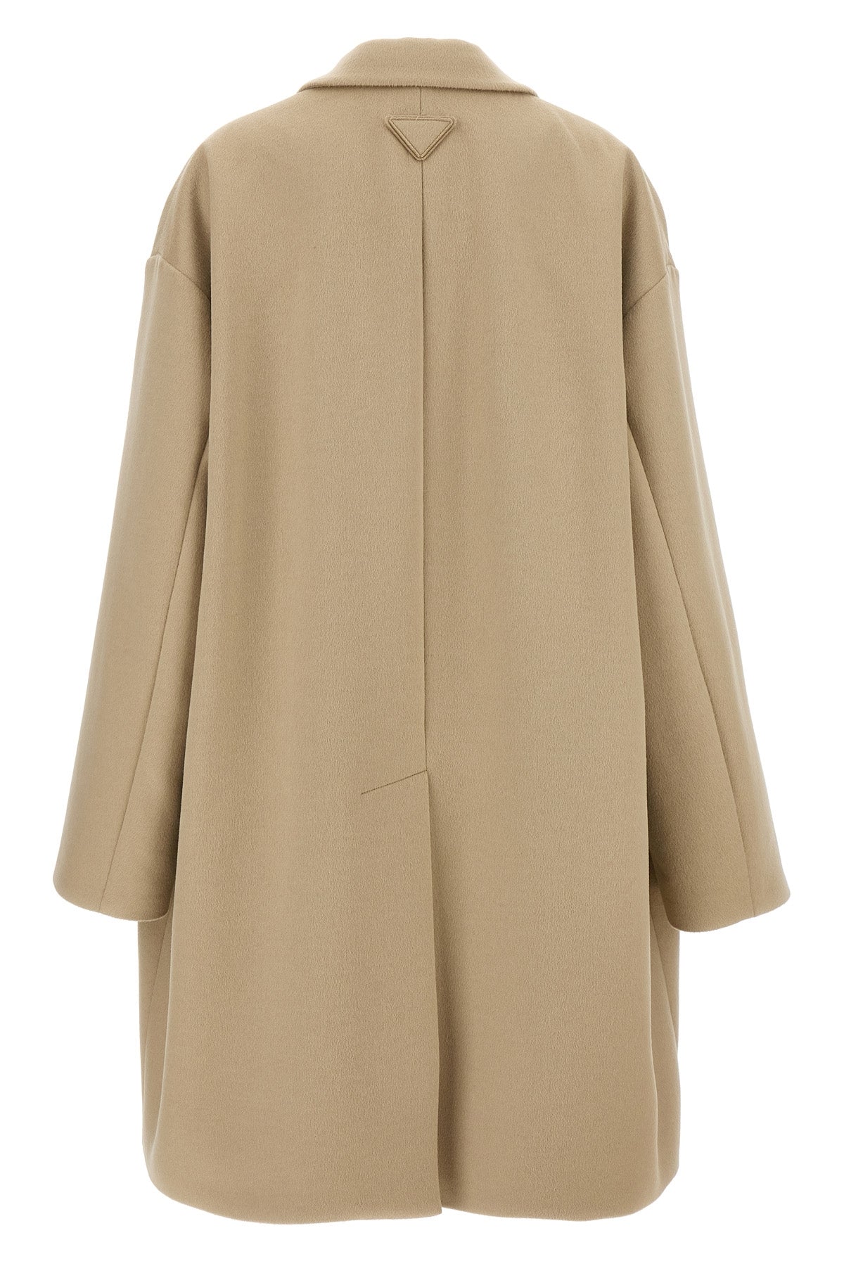 Manteau en laine et cachemire mélangés, fermeture boutonnée sur le devant, coupe légèrement ample, manches longues, détail triangulaire au dos.