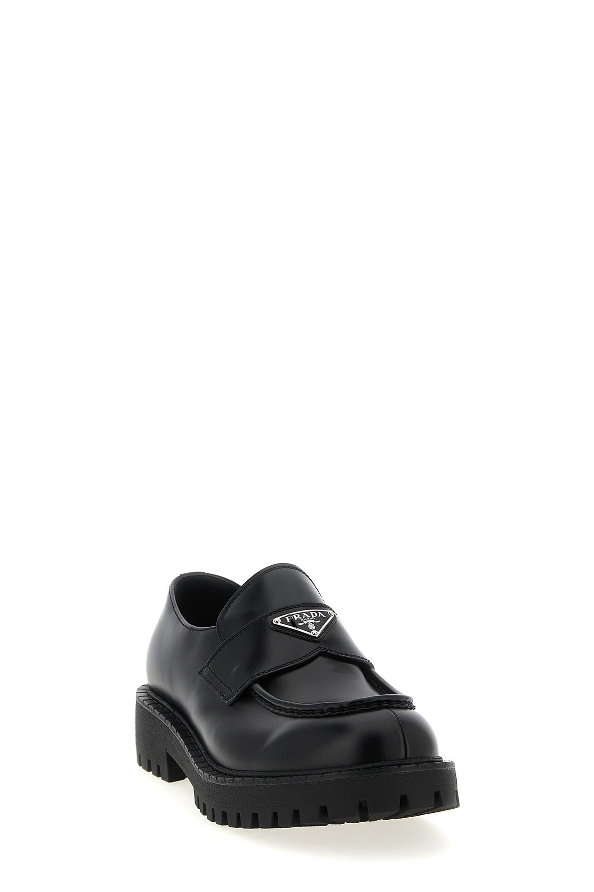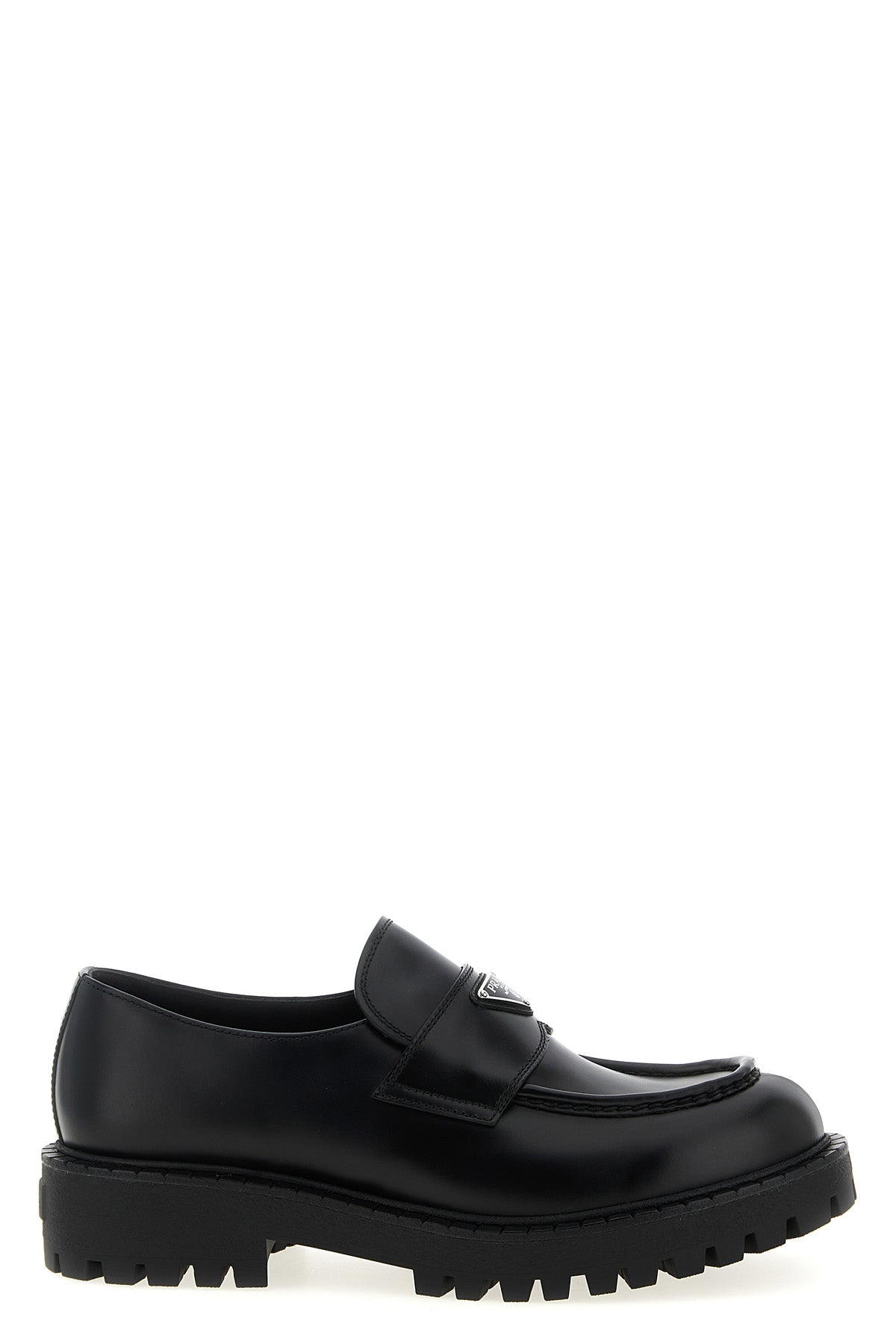 Mocassins en cuir brossé ' Double Chocolate ' avec logo triangulaire en métal émaillé sur le devant et semelle en caoutchouc à double trépointe.