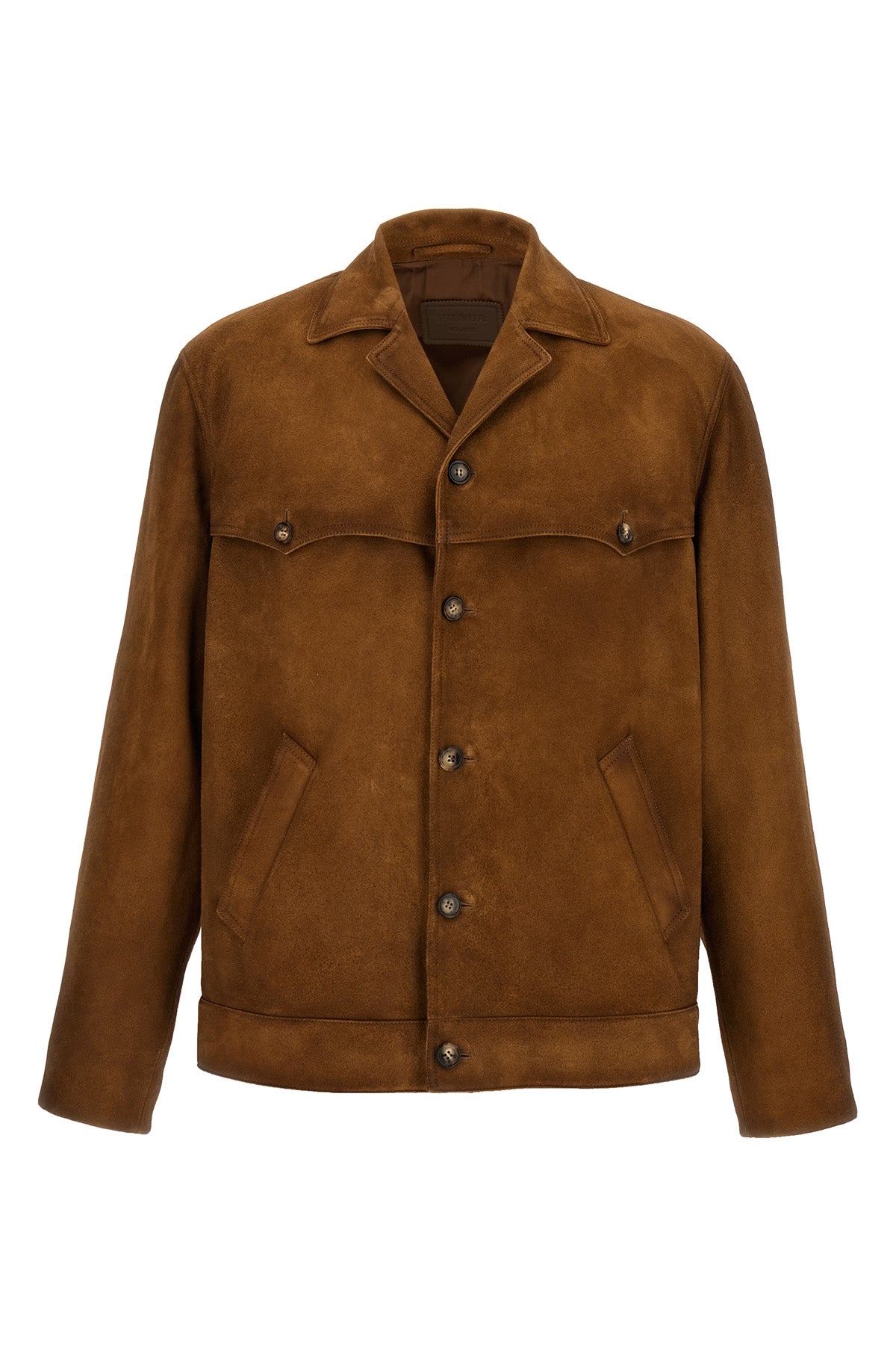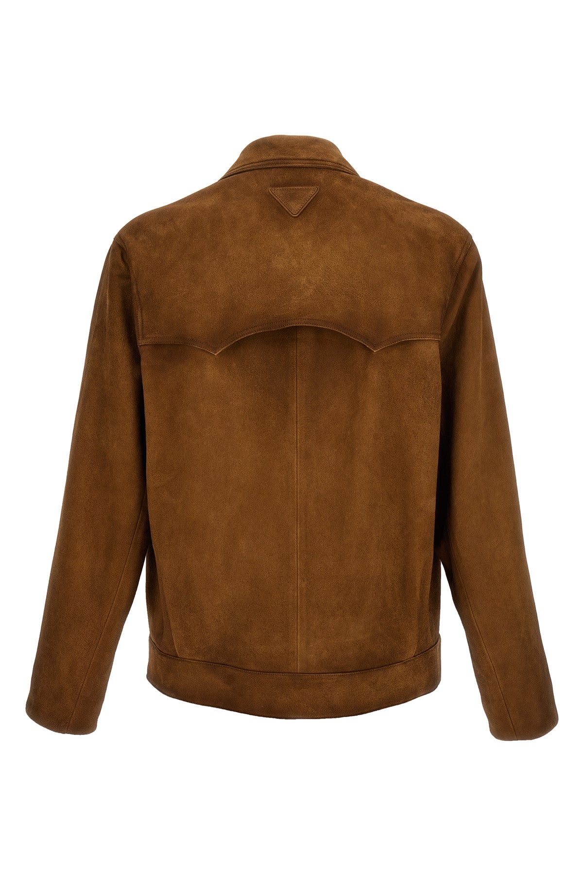 Blouson en daim effet usé, logo triangulaire ton sur ton en tissu au dos, col chemise, col en V, fermeture boutonnée sur le devant, poches, manches longues, doublure.