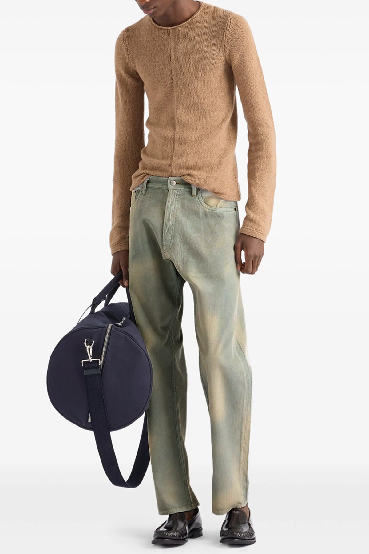 Pantalon en velours côtelé délavé, fermeture boutonnée sur le devant, cinq poches, jambe droite, étiquette logo au dos.