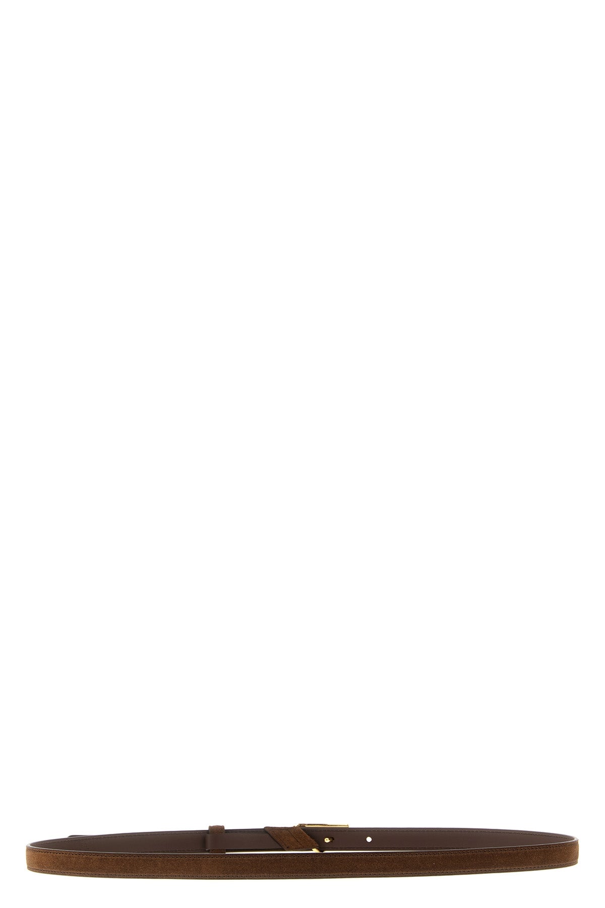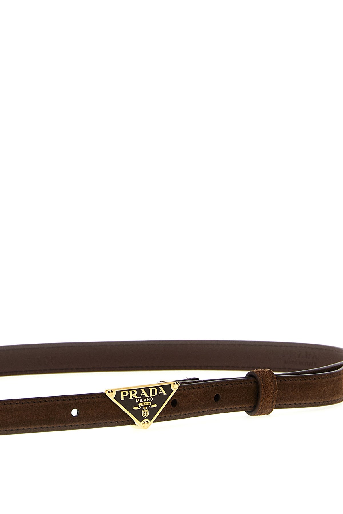 Ceinture en daim, boucle à logo triangulaire en métal émaillé.