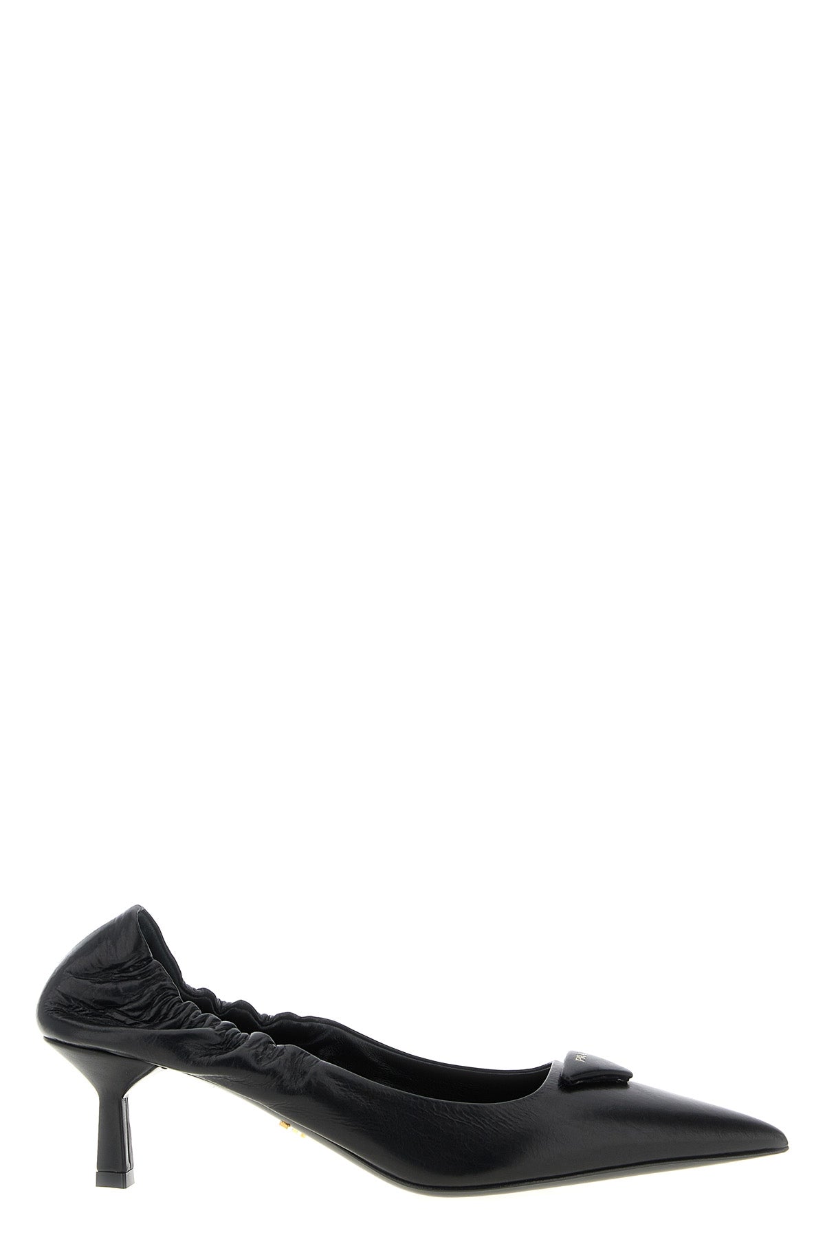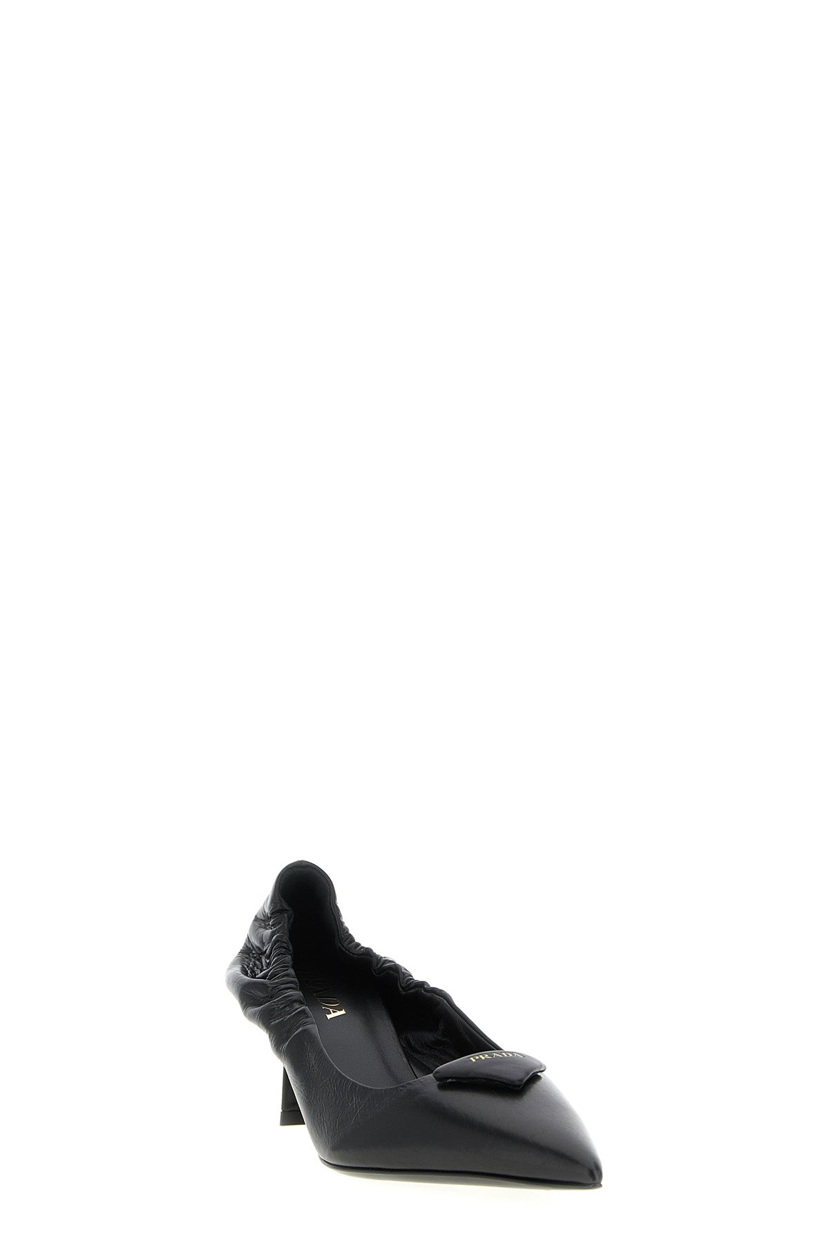 Escarpins pointus en cuir avec logo triangulaire ton sur ton et logo en relief sur le devant, talon élastique à l'arrière, talon architectural inspiré de la géométrie du triangle iconique, semelle en cuir.