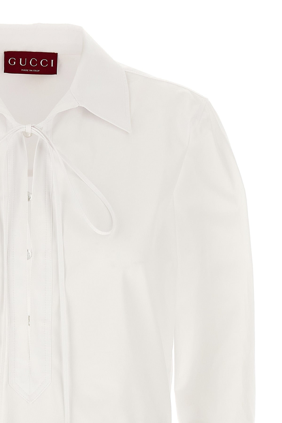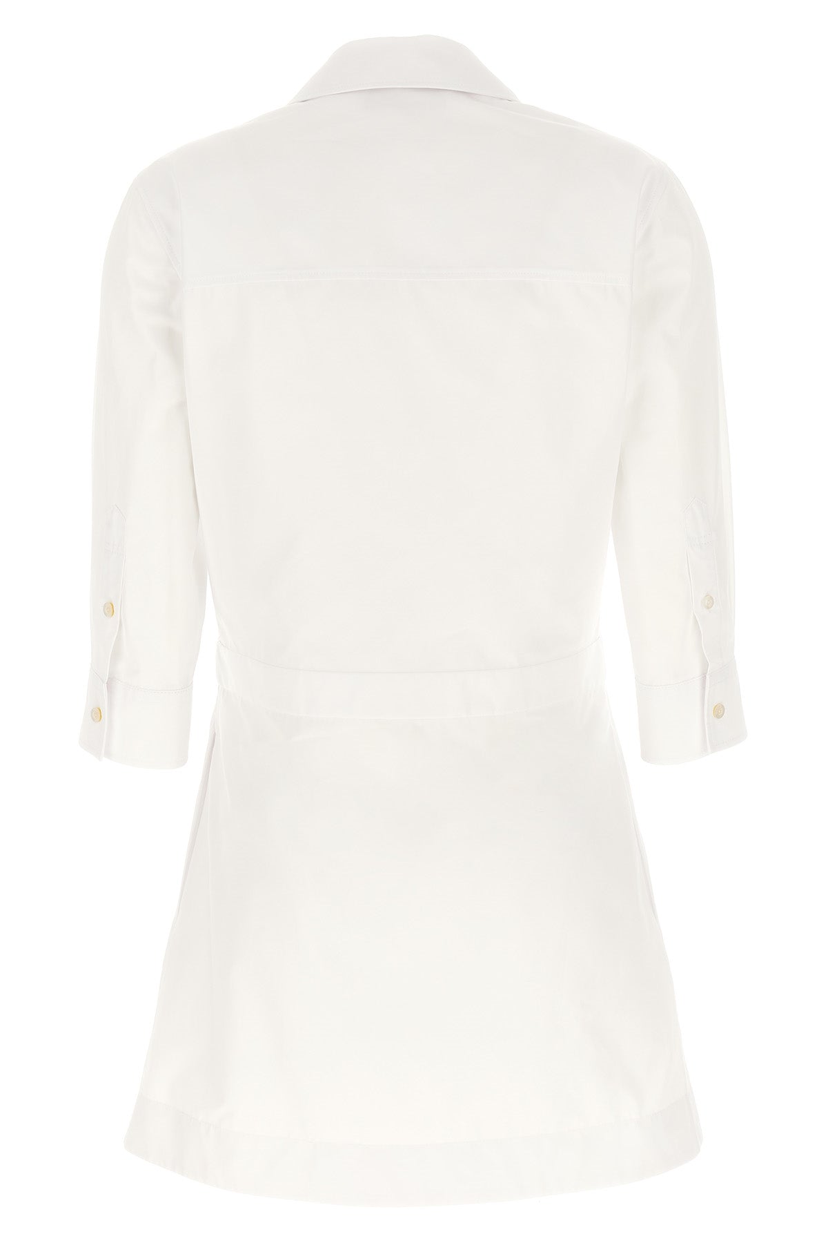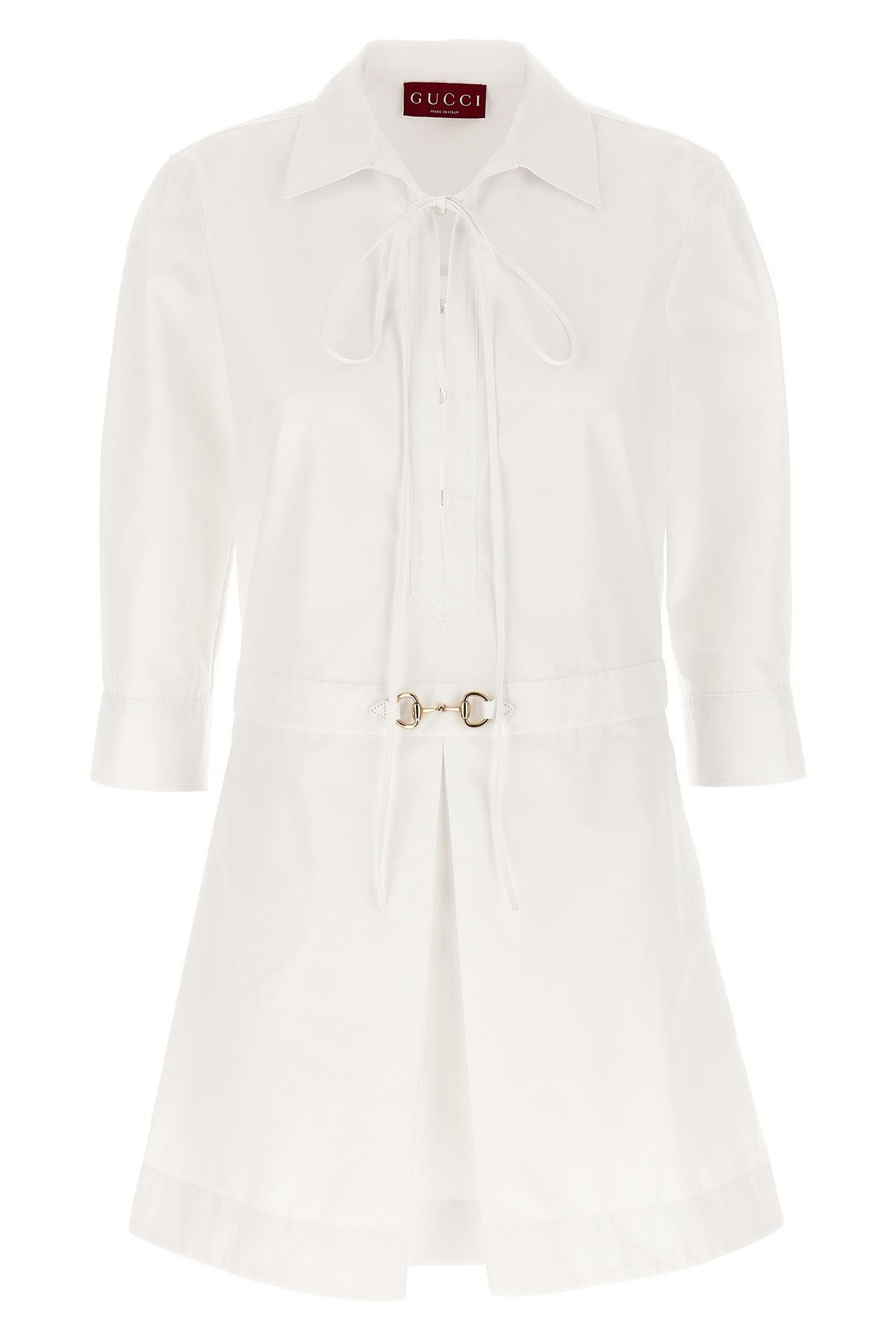 Robe Chemisier Mini en popeline de coton avec col à ruban, détail de pince métallique et fermeture boutonnée sur le devant, jupe plissée et manches 3/4.