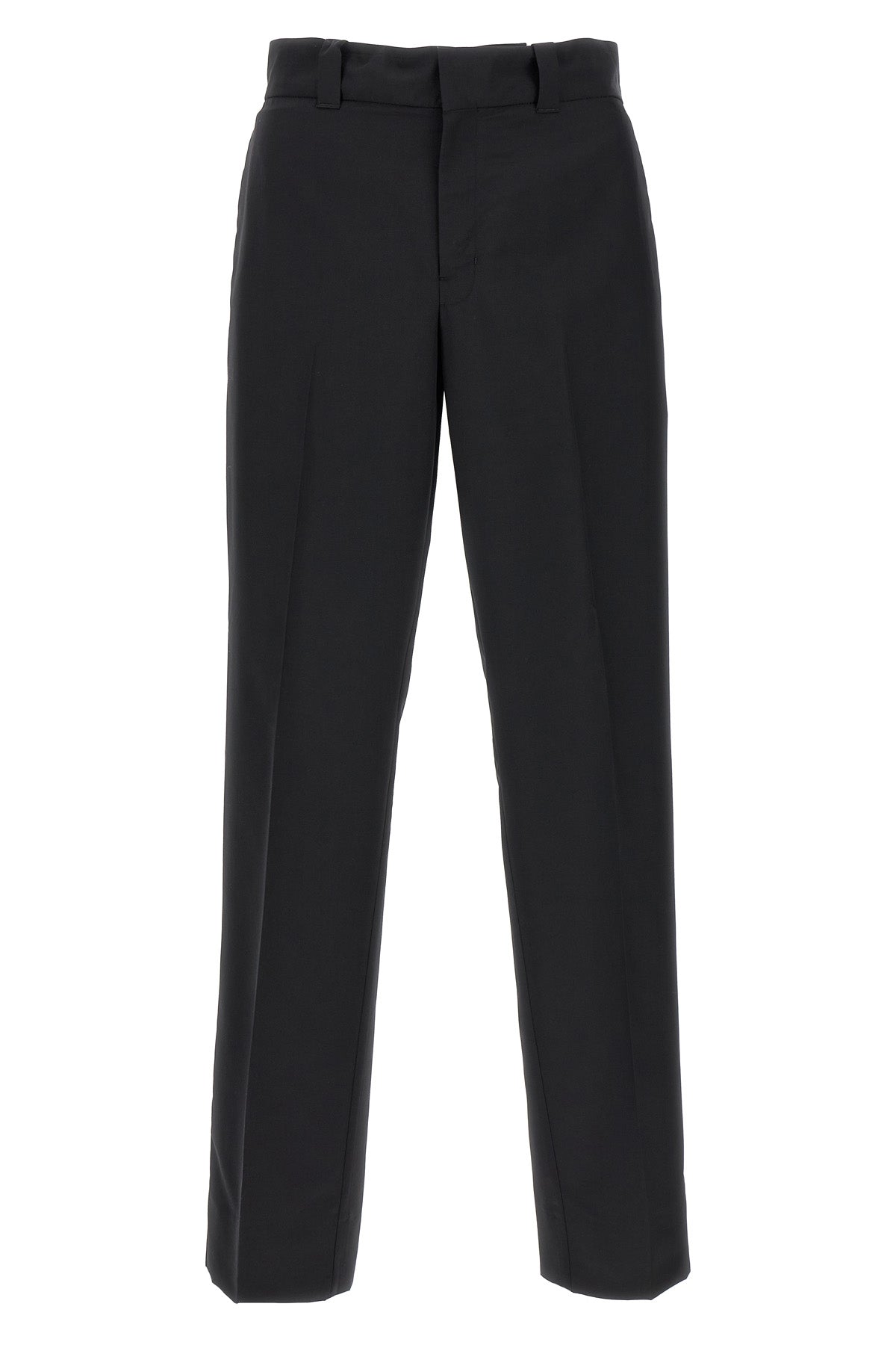 Pantalon en laine mélangée, logo triangulaire ton sur ton au dos, fermeture éclair à crochet et bouton, cordon de serrage ajustable à la taille, poches, jambe droite avec pli étiré.