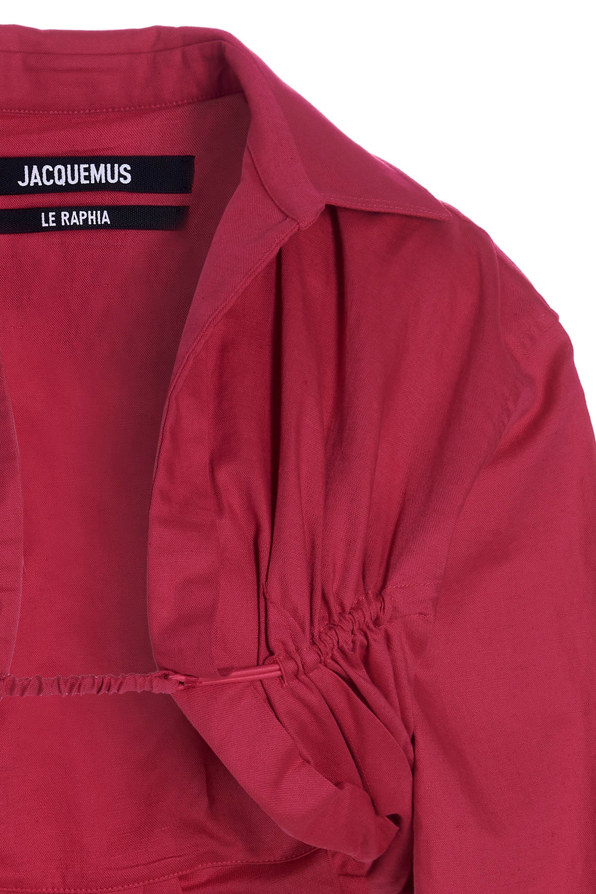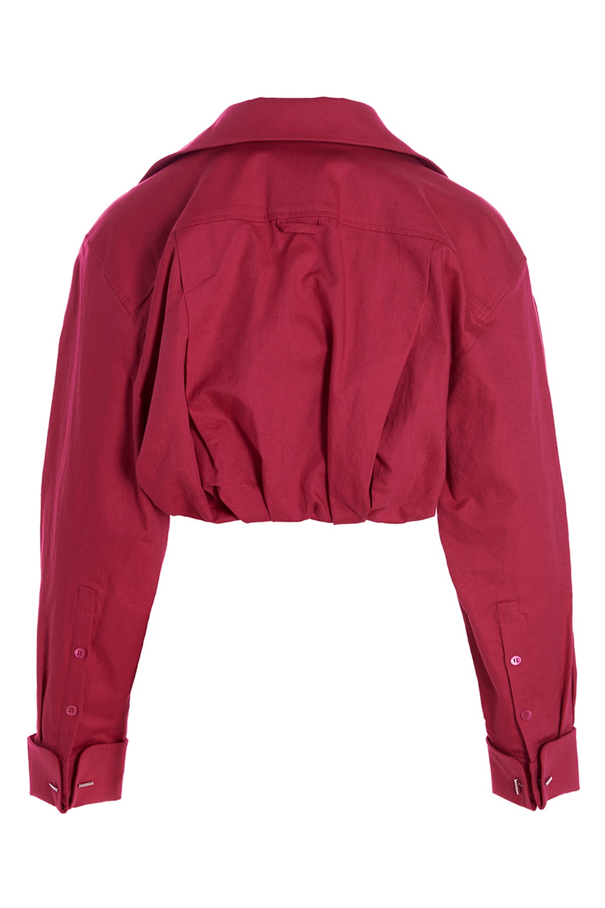 Ma chemise boléro courte en cachemire et coton, avec élastique sur le devant orné de détails froissés, boutons en nacre, manches longues à poignets, poignets métalliques, froissée au dos.