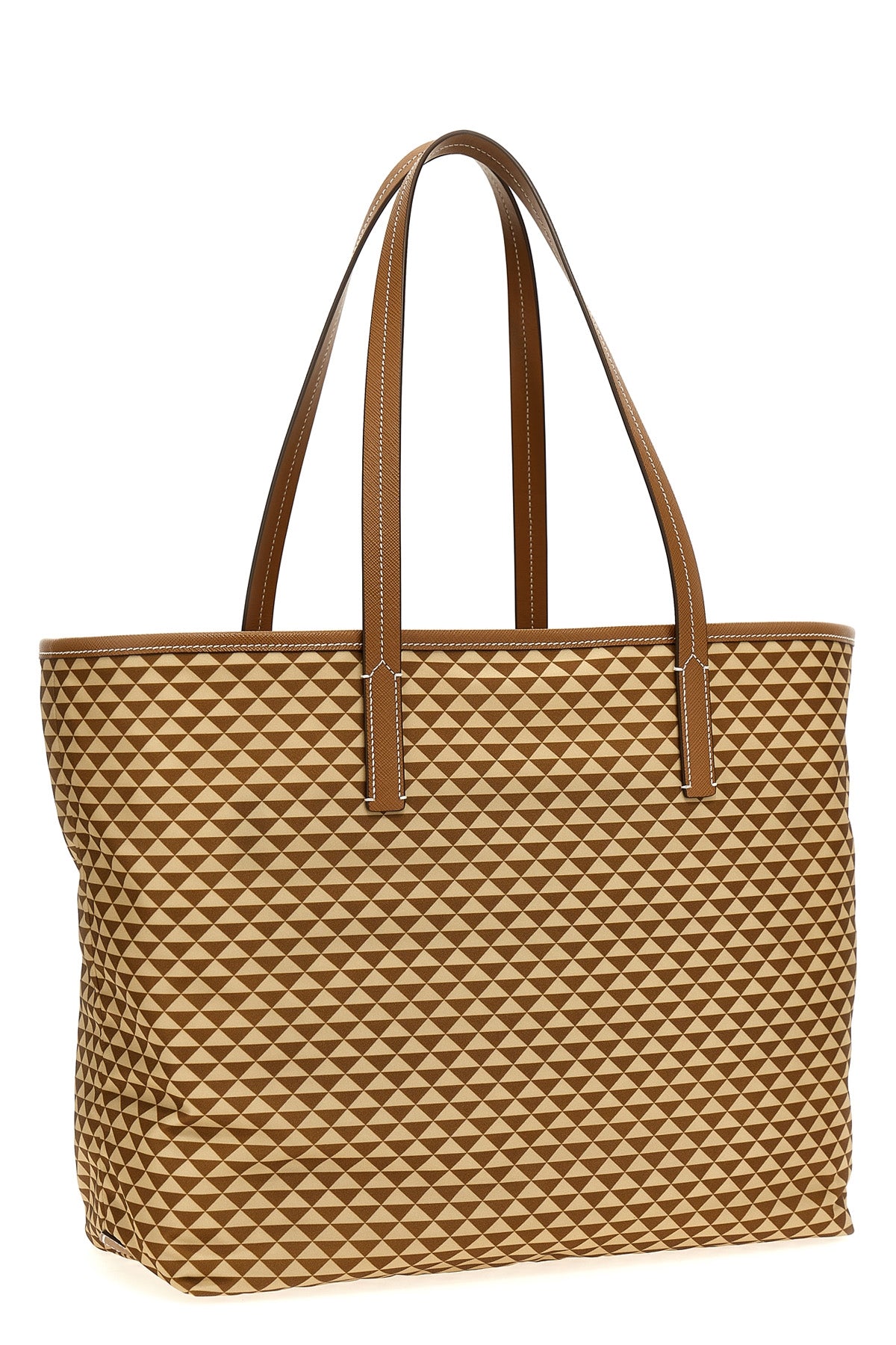 Sac shopping Prada Symbole en tissu Tria avec passepoil en cuir Saffiano, logo triangulaire émaillé sur le devant, double poignée fixe.