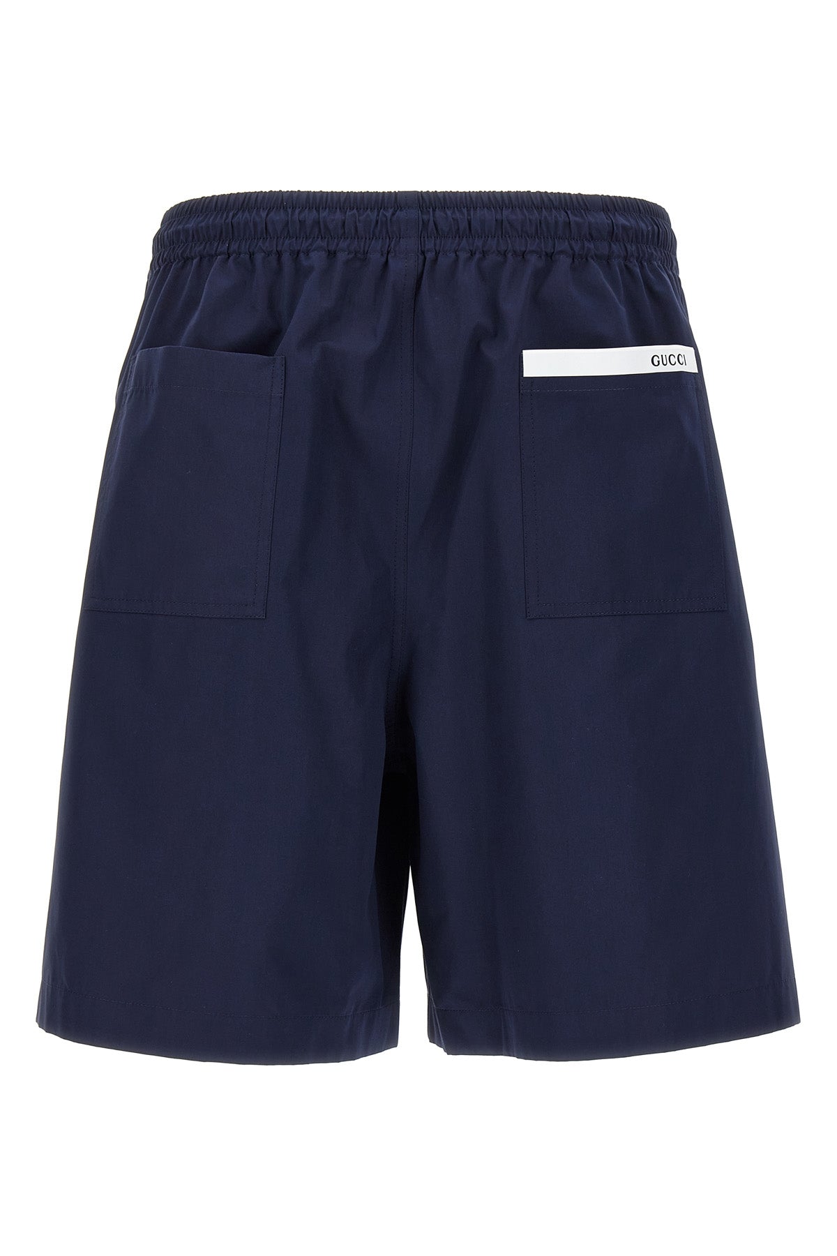 Bermuda en popeline de coton épais, taille élastiquée ajustable par cordon de serrage, poches, non doublé, détail thermoscellé avec logo au dos.