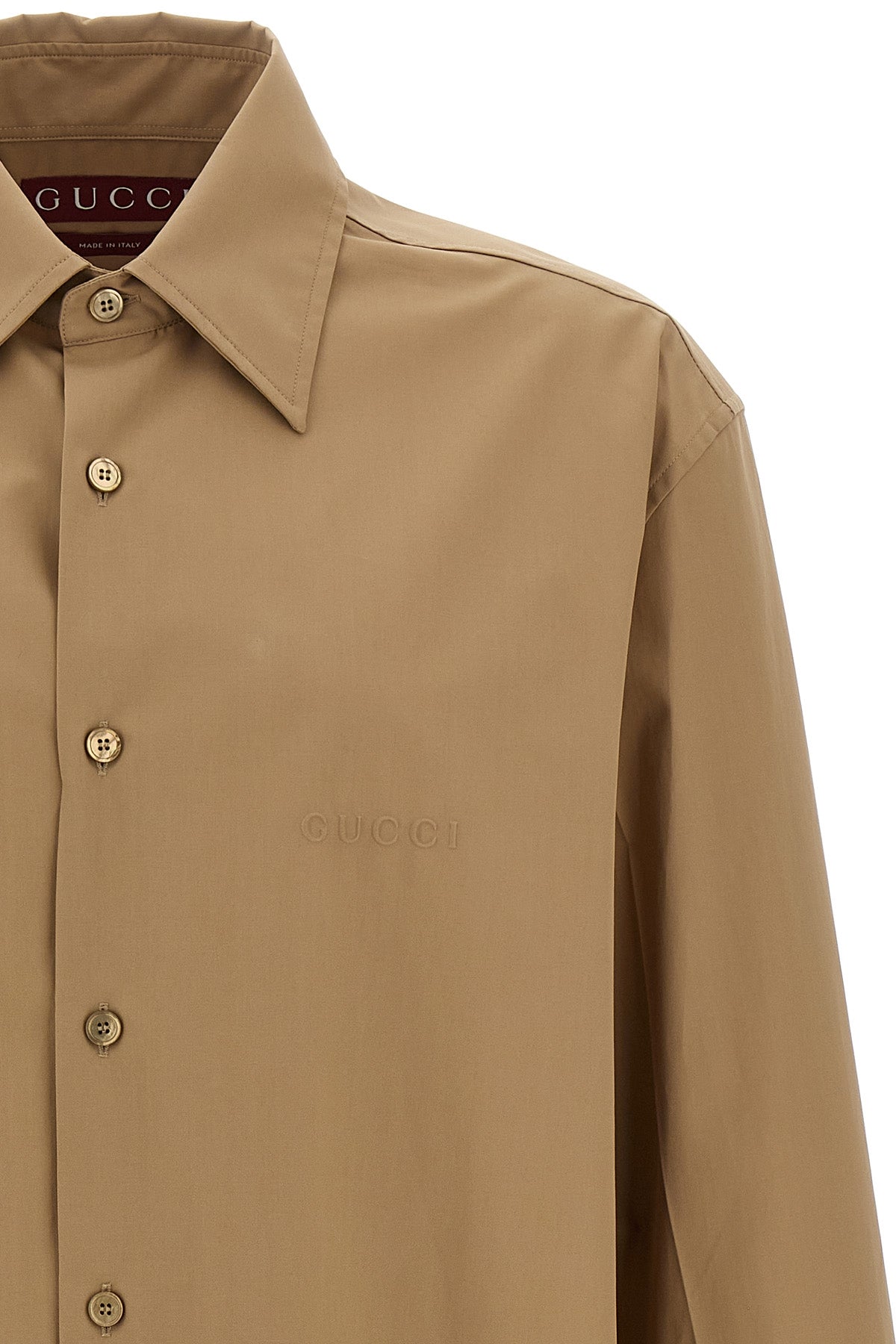 Chemise en popeline de coton avec logo en relief sur le devant, fermeture boutonnée, manches longues à poignets et épaules tombantes.