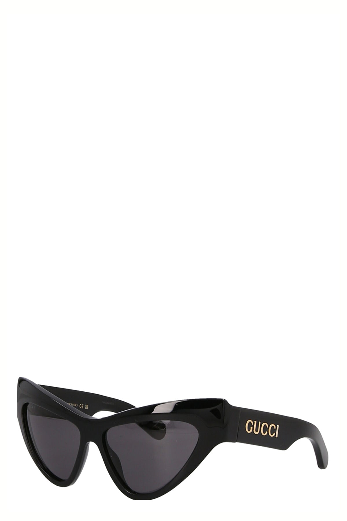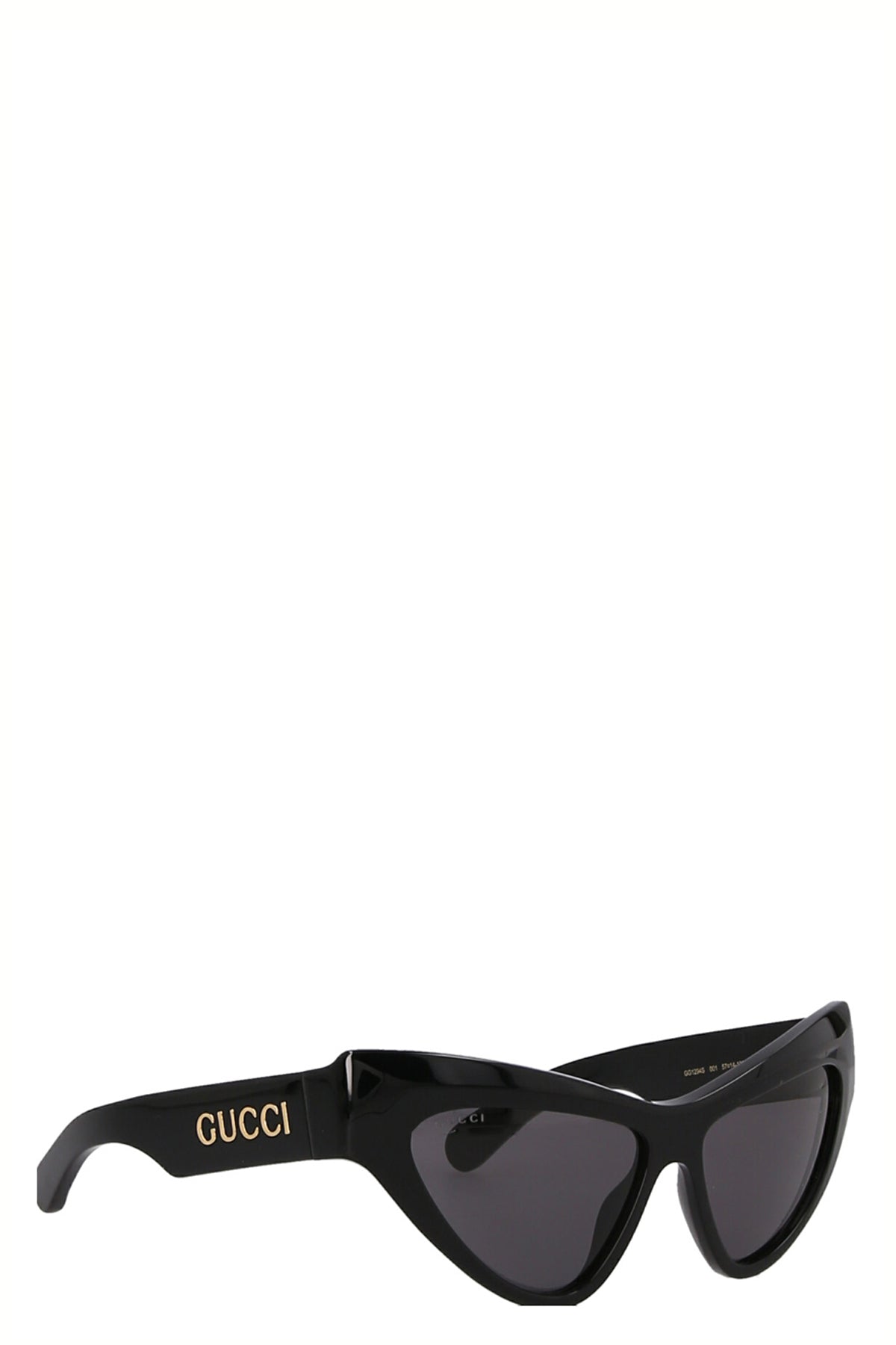 Lunettes de soleil œil de chat avec monture en acétate noir brillant, branches en acétate noir brillant ornées du logo Gucci et verres gris unis. Protection UVA/UVB totale.