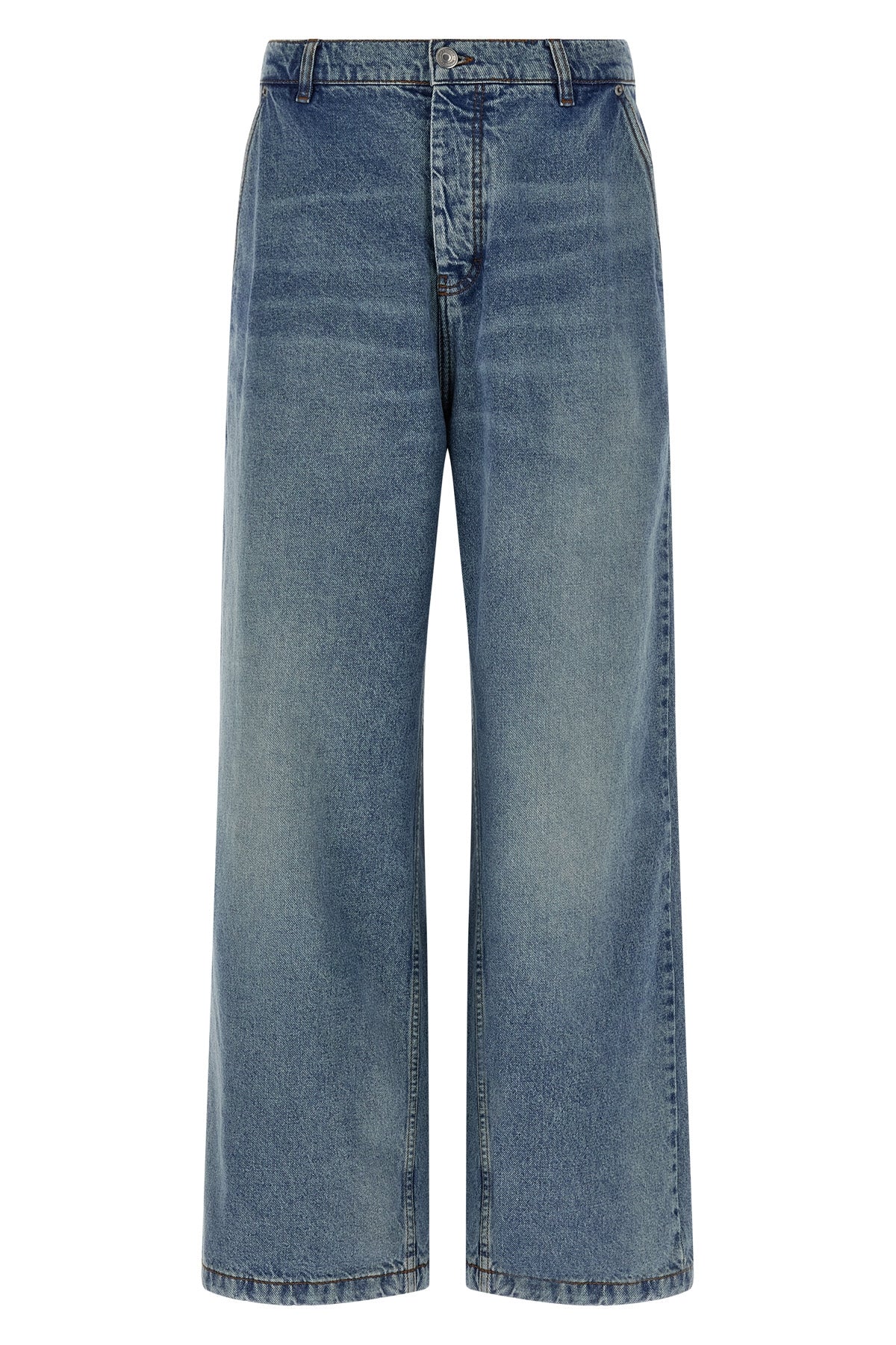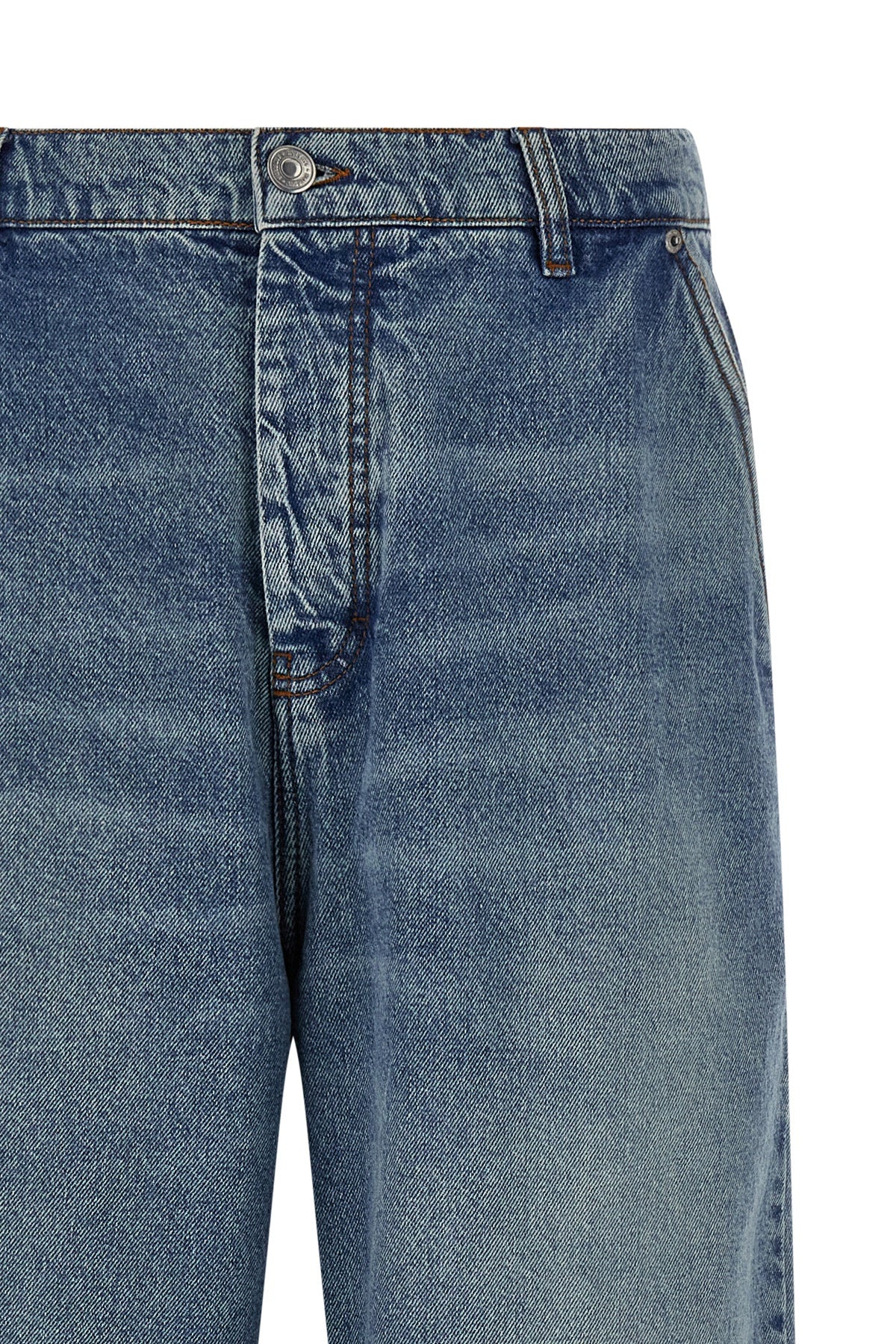Jean en denim de coton délavé à la pierre, avec surpiqûres contrastées, coupe droite et jambes larges. Fermeture boutonnée sur le devant, cinq poches, sangle ajustable au dos.