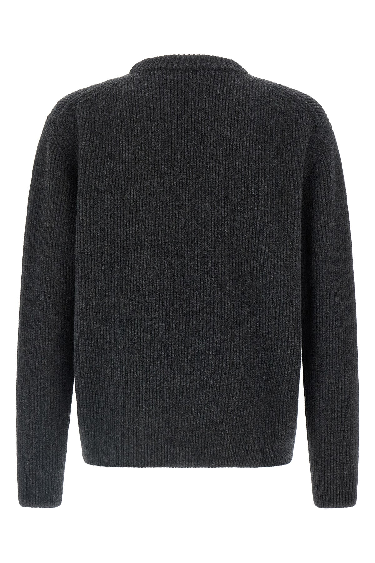 Pull en laine et cachemire côtelé avec logo Gucci en intarsia sur le devant, col rond, manches longues à poignets boutonnés et épaules tombantes.